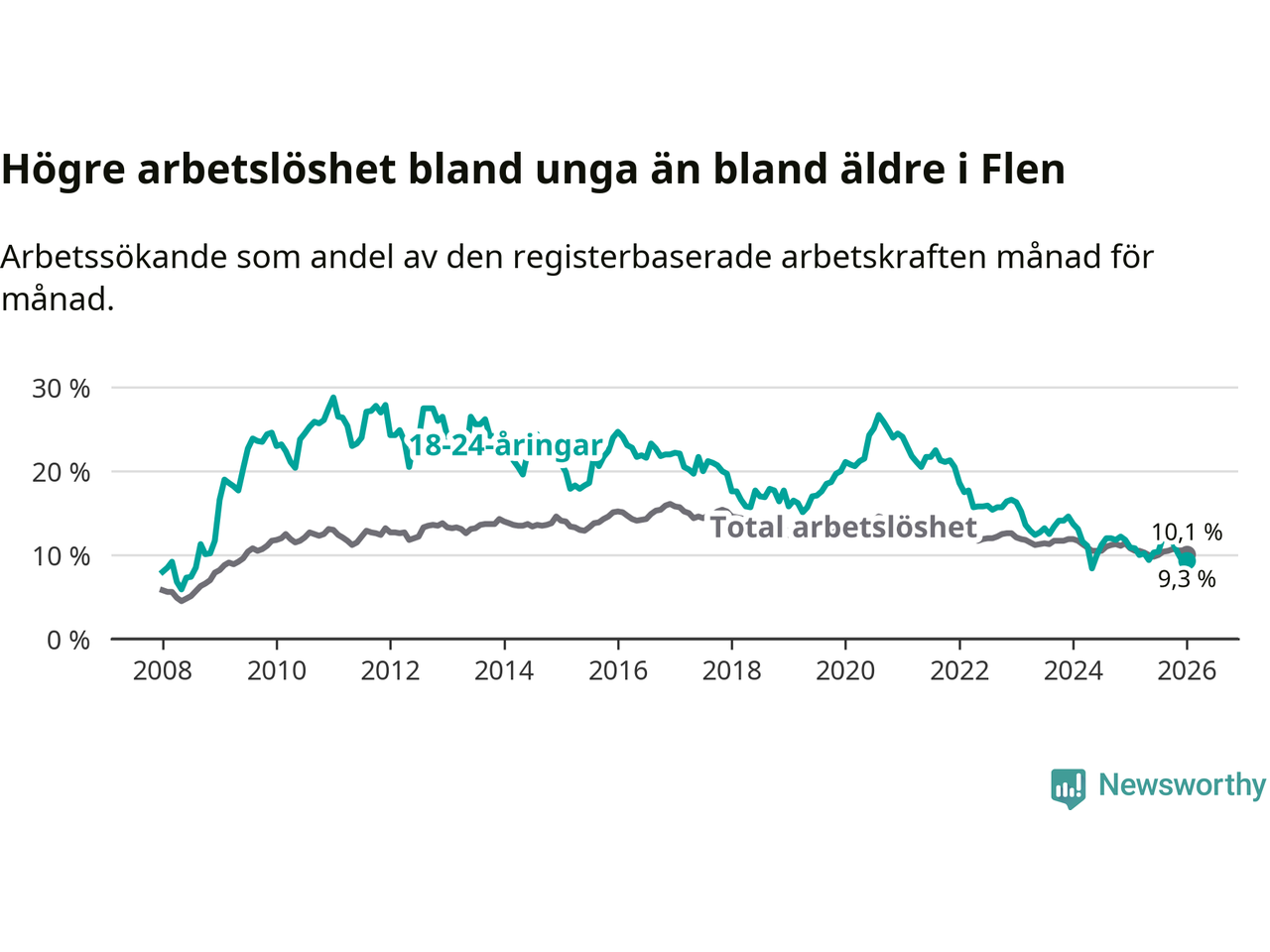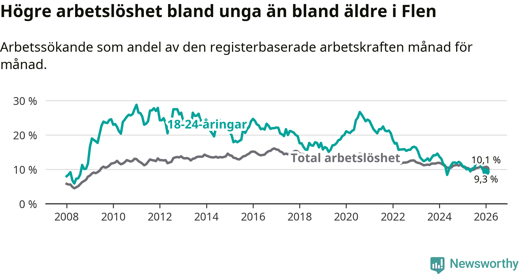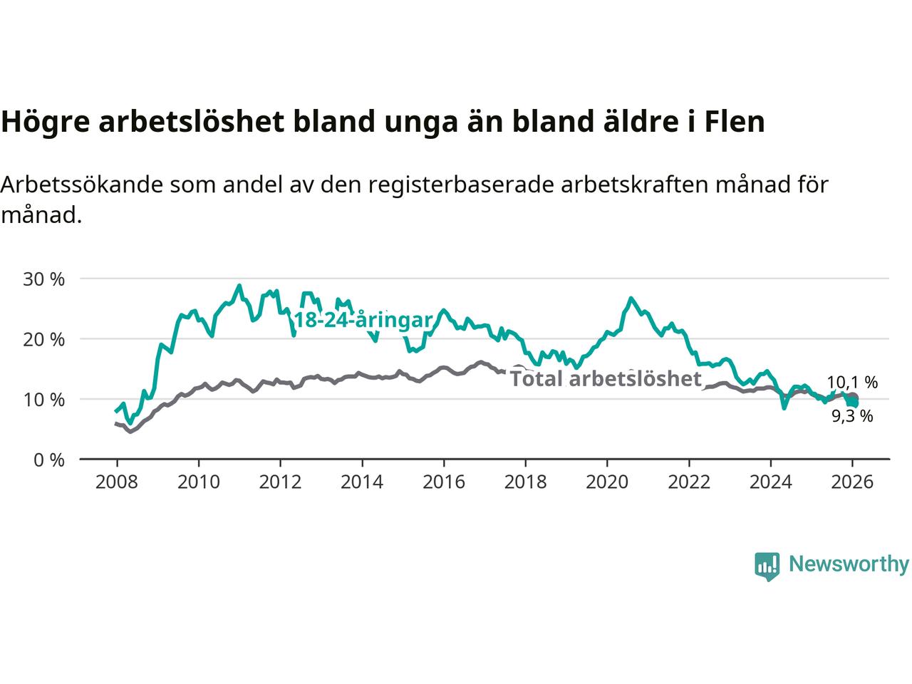Graf: Arbetslöshet bland unga i Flens kommun och Södermanlands län