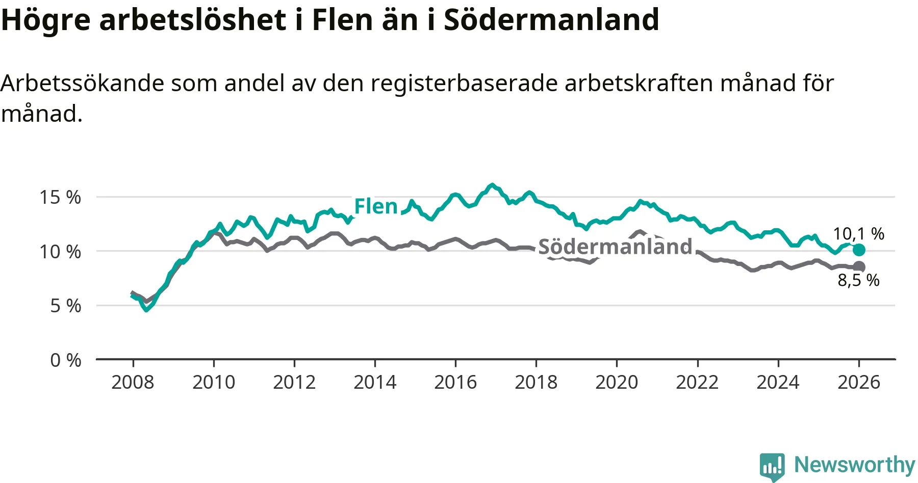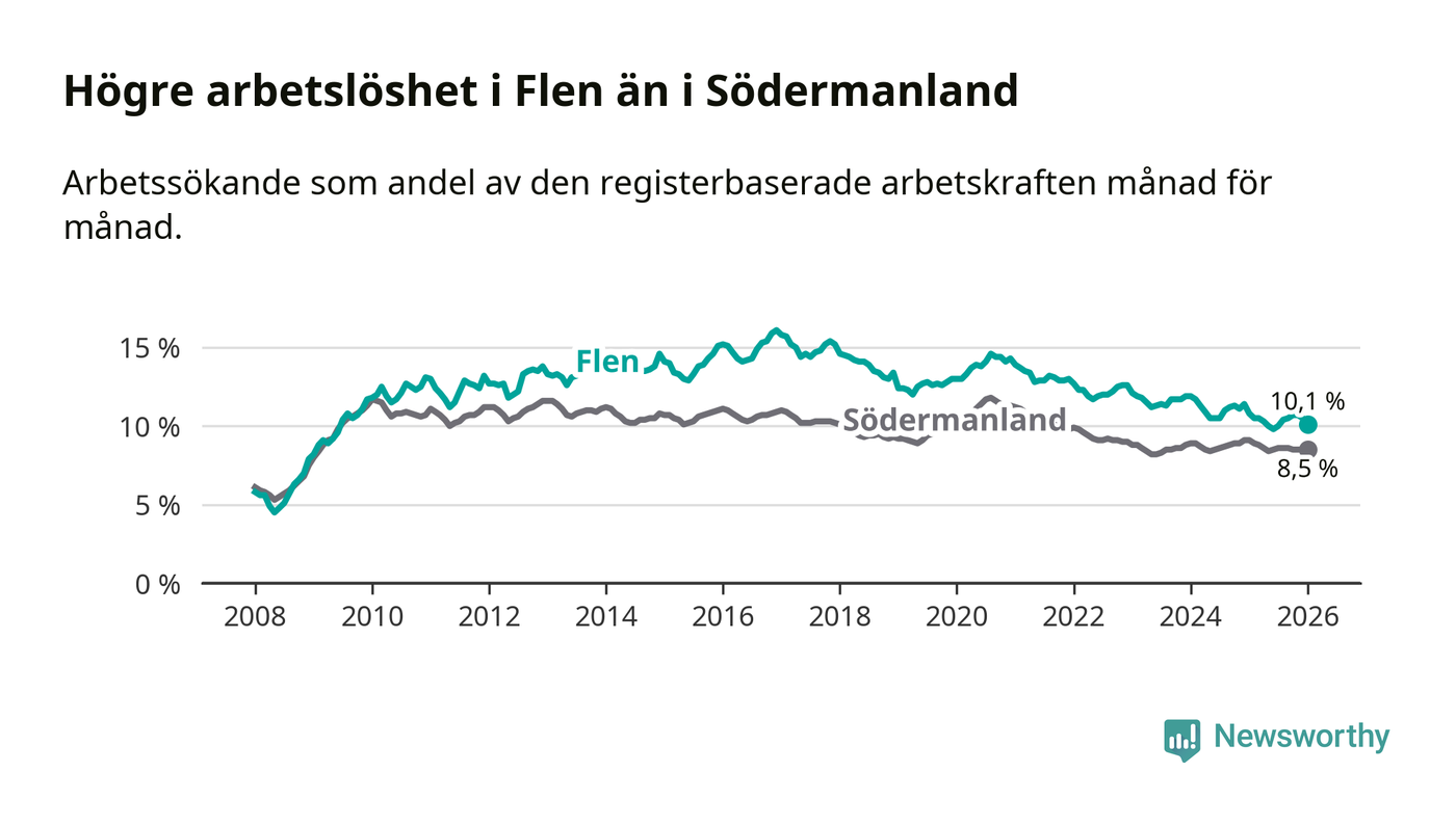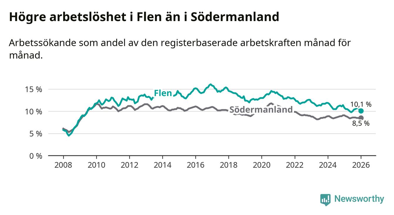 Under januari månad rapporterade Flens kommun en total arbetslöshet på 10,1 procent. Det är en minskning jämfört med samma tidpunkt i fjol (−0,7 procentenheter). Även i Södermanlands län sjunker arbetslösheten .