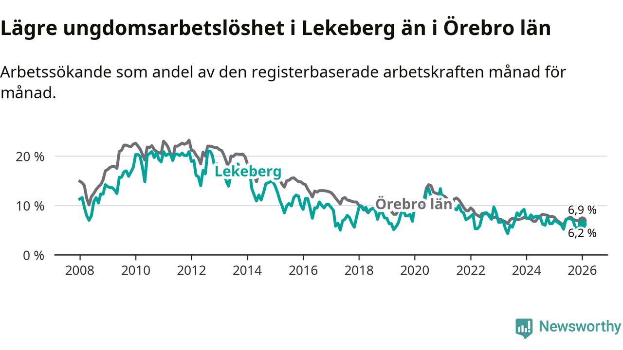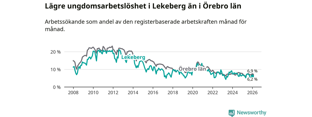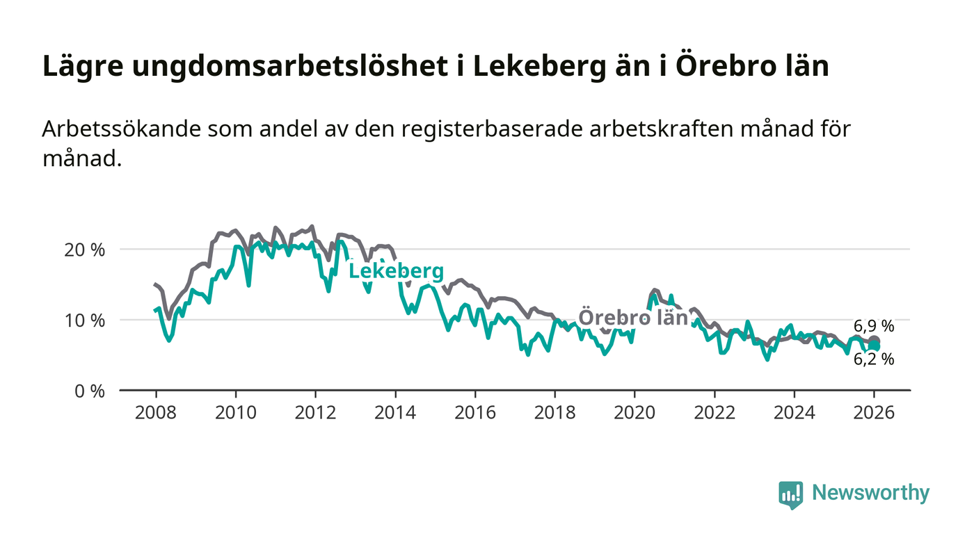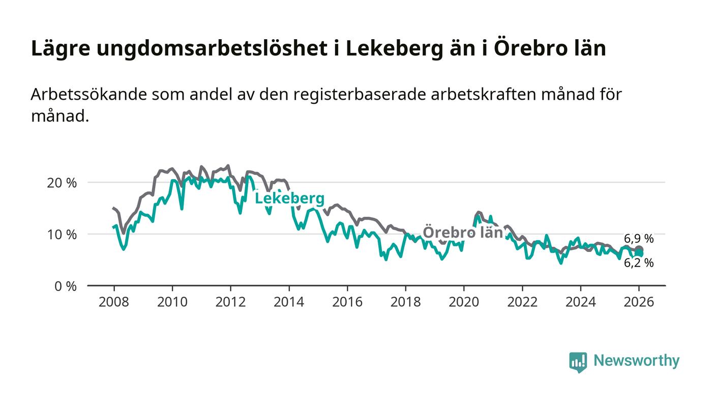 Precis som den totala arbetslösheten ligger ungdomsarbetslösheten i Lekeberg lägre än i Örebro som helhet. Skillnaden mellan kommunen och länet är 0,7 procentenheter.