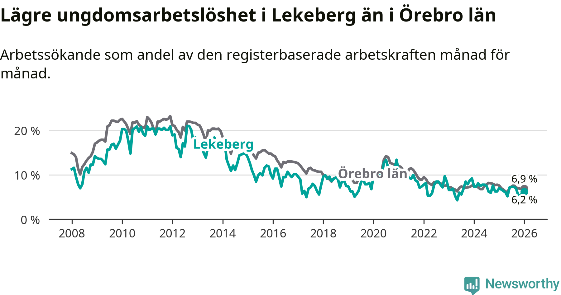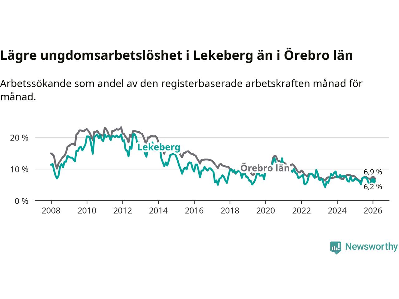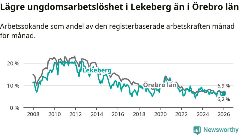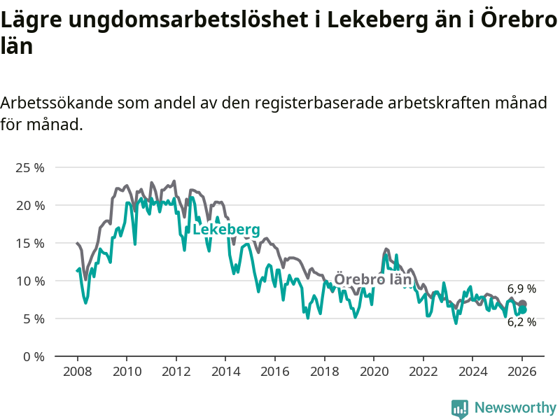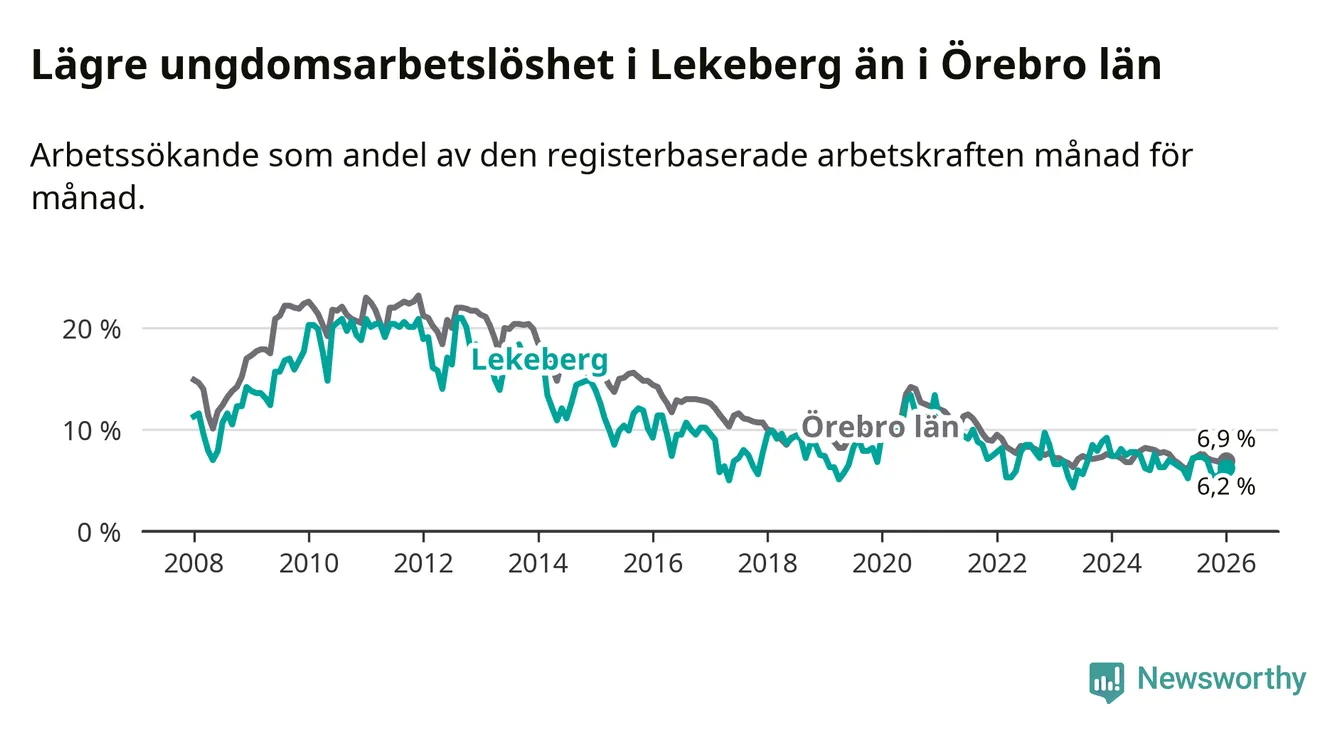 Precis som den totala arbetslösheten ligger ungdomsarbetslösheten i Lekeberg lägre än i Örebro som helhet. Skillnaden mellan kommunen och länet är 0,7 procentenheter.