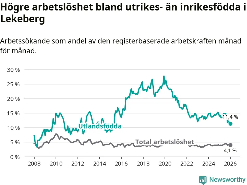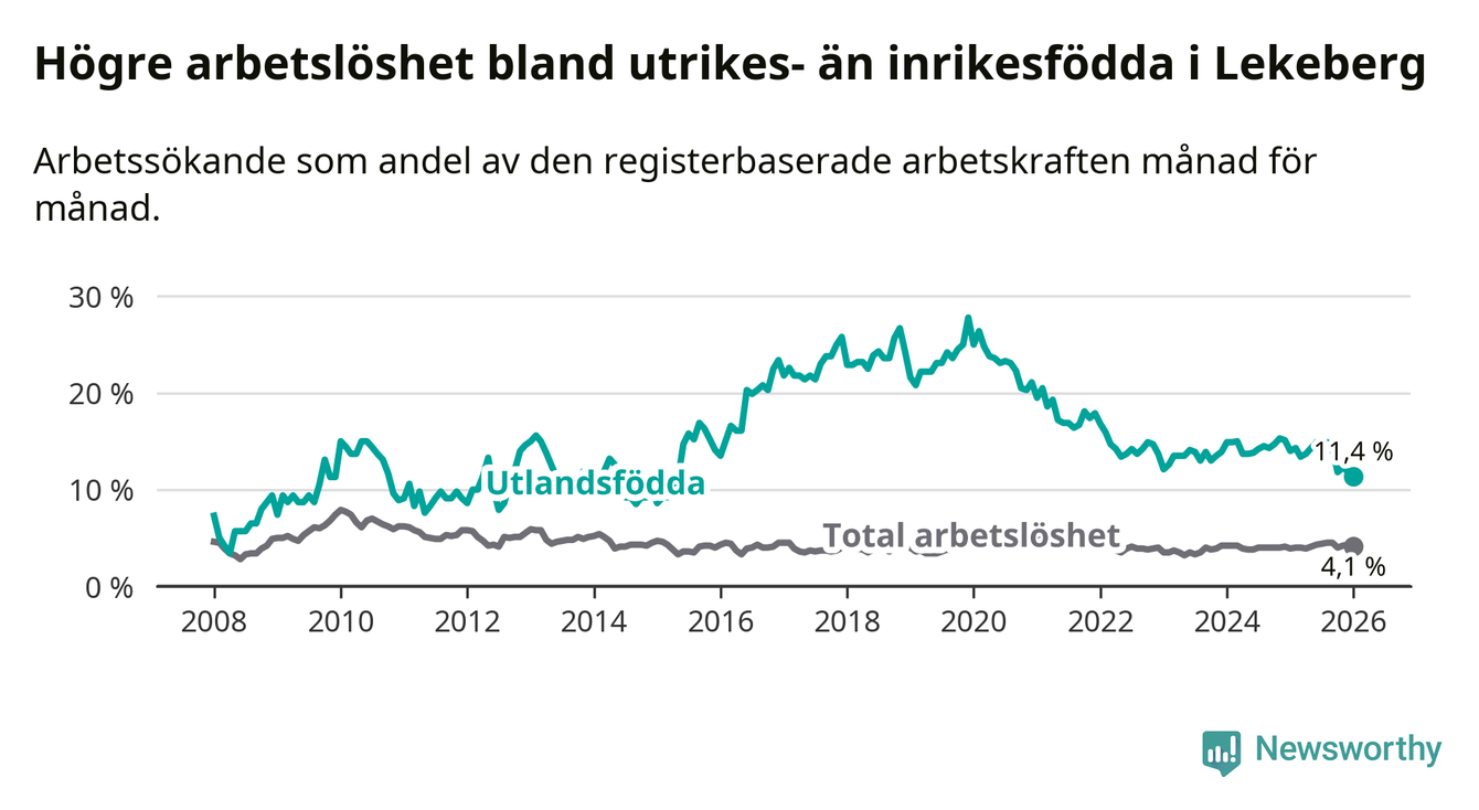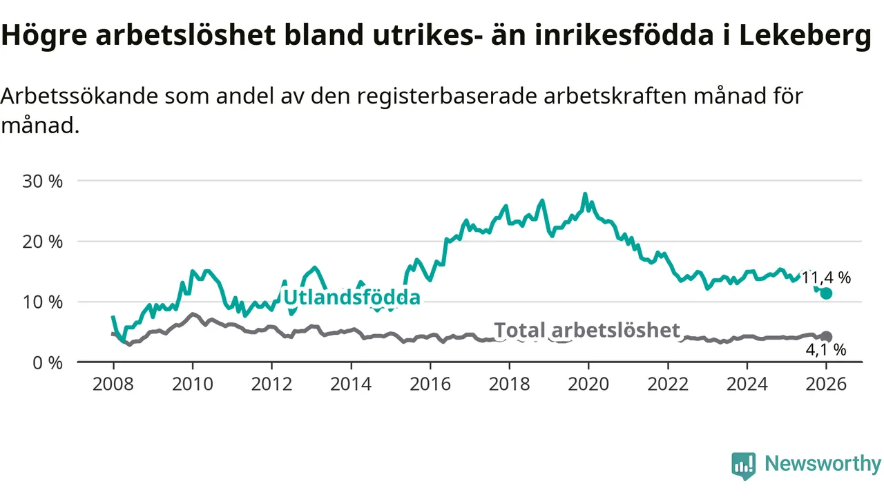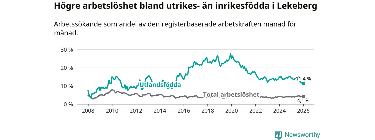 Arbetslösheten bland utlandsfödda var 11,4 procent i Lekeberg under januari månad, motsvarande 40 av 351 personer. Det är 2,6 procentenheter färre än vid samma tidpunkt i fjol (−9 om man räknar personer). Den nuvarande arbetslöshetsnivån är den lägsta sedan maj 2015.