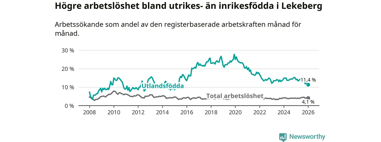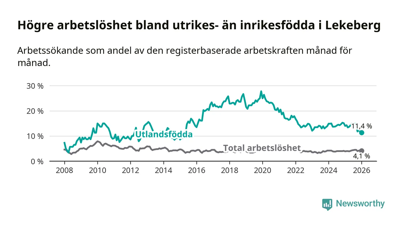 Skillnaden i arbetslöshet mellan utrikesfödda och hela befolkningen är 7,3 procentenheter i Lekeberg. Det är en betydligt mindre skillnad än för ett år sedan (−2,8 procentenheter).