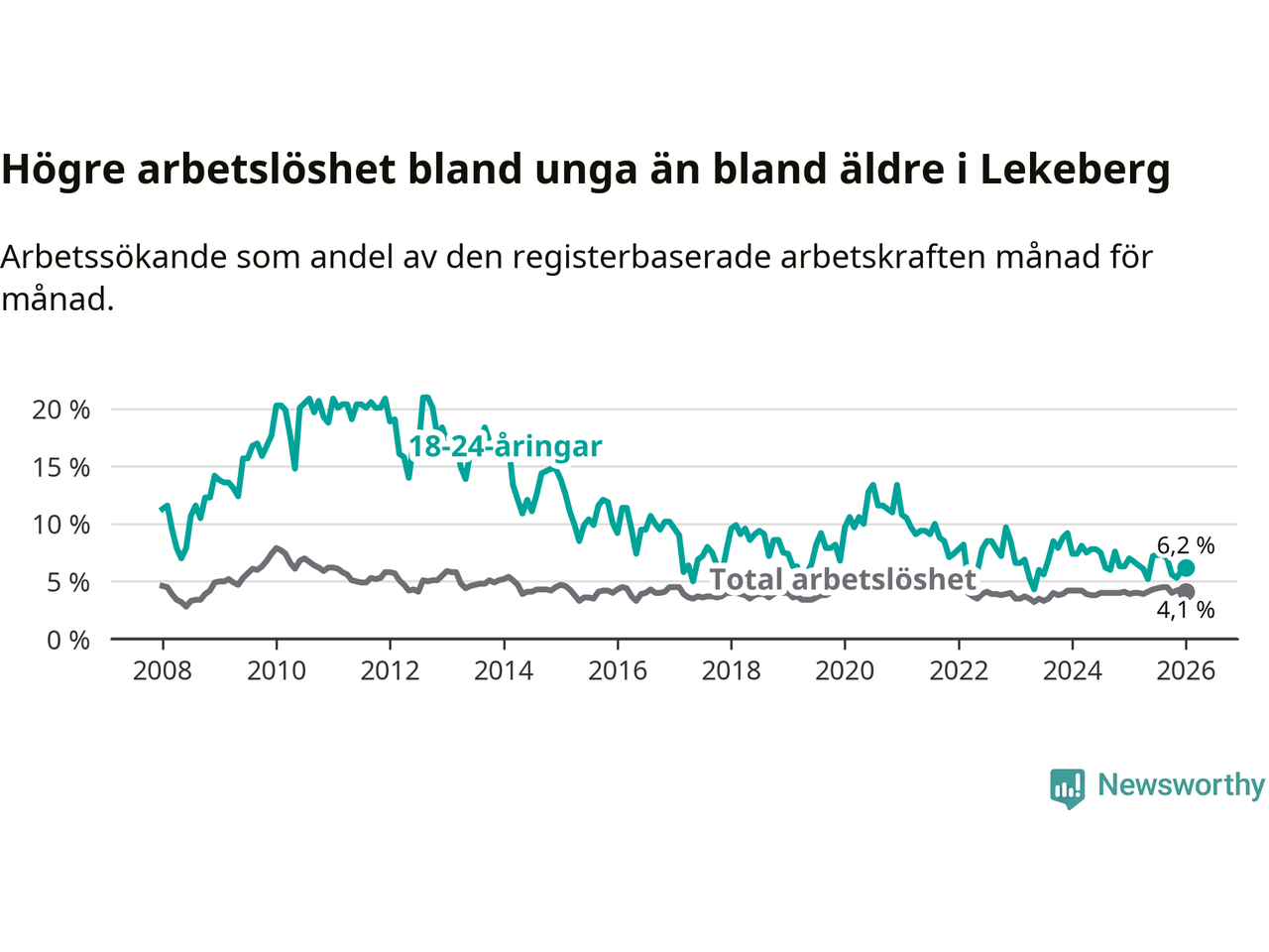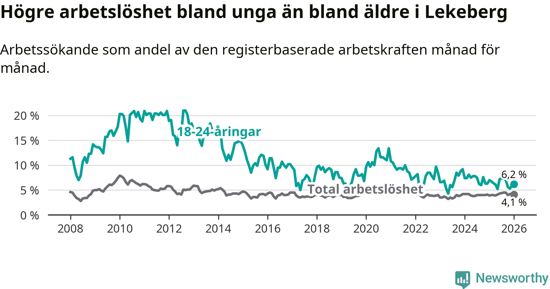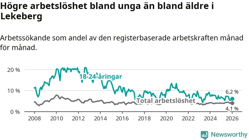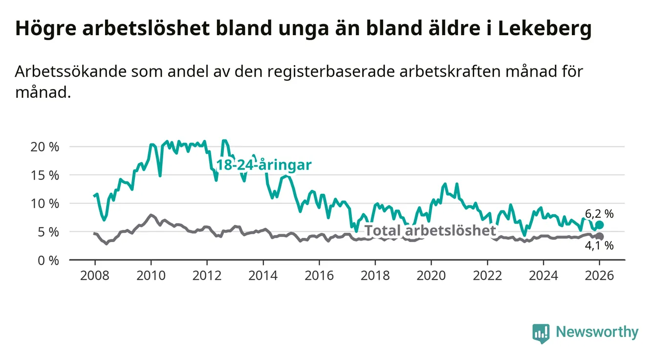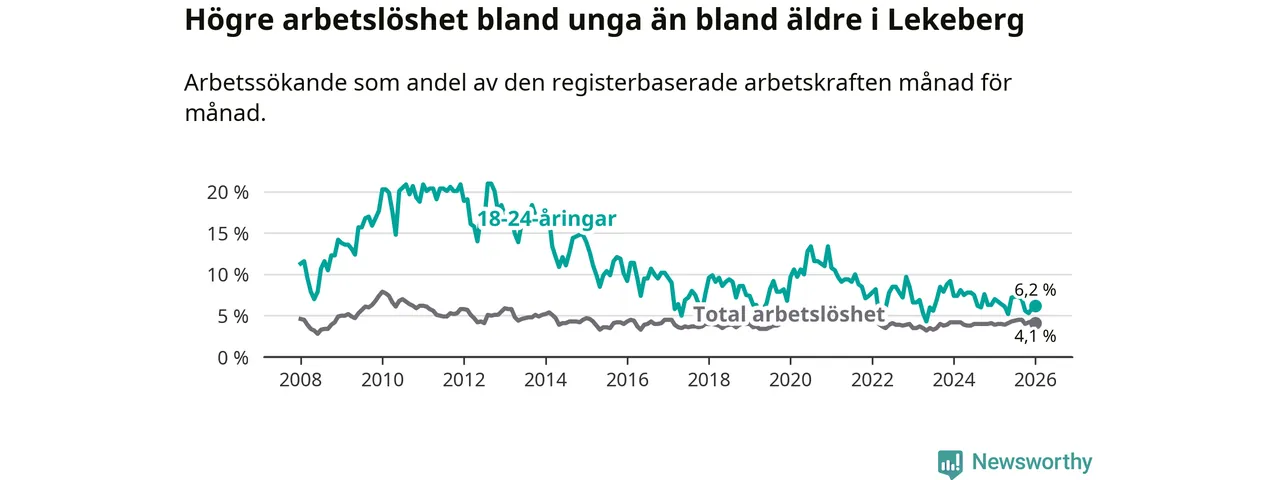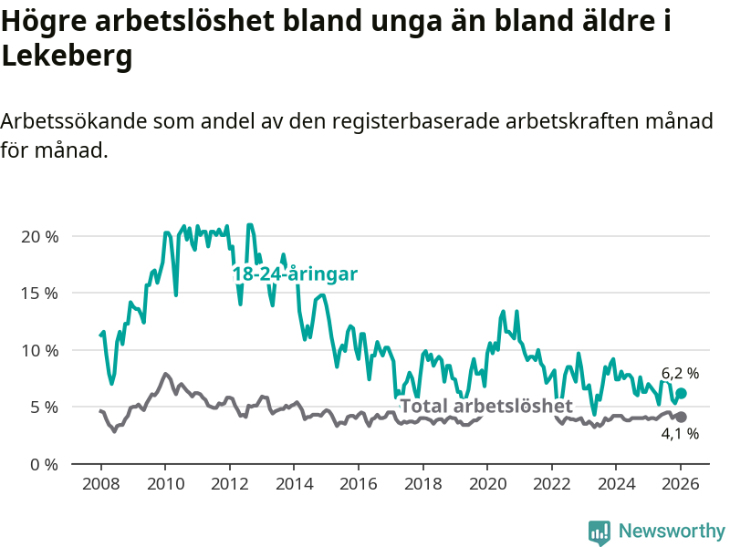 Till skillnad från den totala arbetslösheten sjunker arbetslösheten bland unga (−0,8 procentenheter). I januari var 6,2 procent av 18–24-åringarna inskrivna som arbetssökande (motsvarande 19 personer). Mäter vi antalet inskrivna ser vi en minskning med tre personer på ett års sikt.