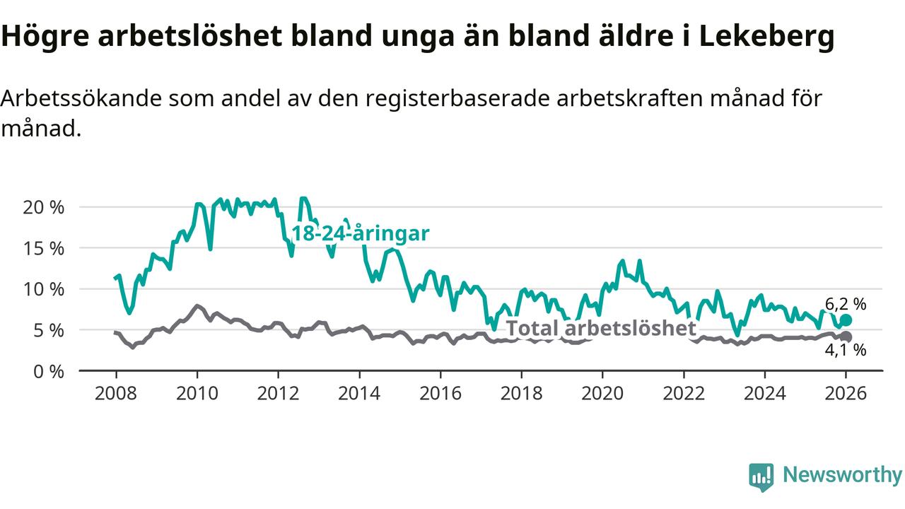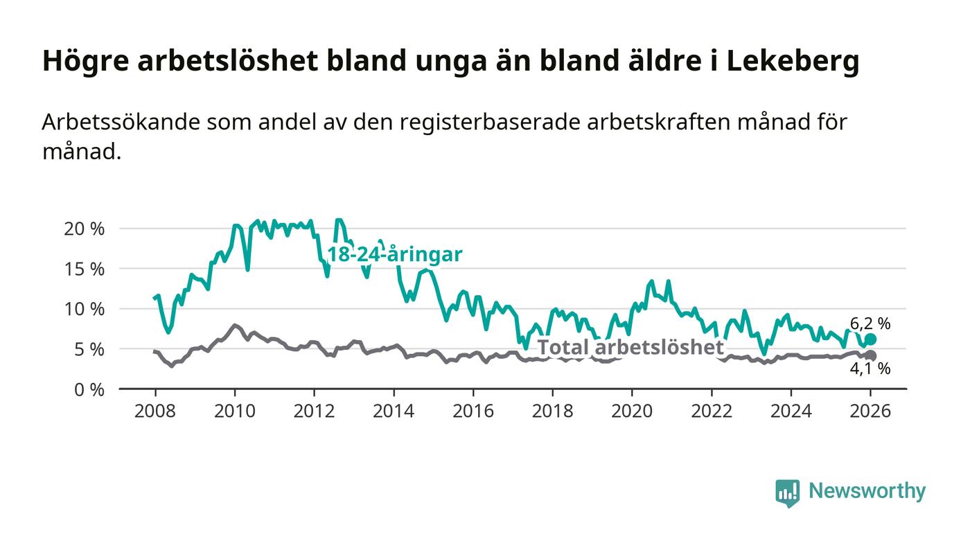 Sett till antalet personer betyder det att 170 av 4 146 invånare i åldern 16 till 661 år i Lekebergs kommun var inskrivna som arbetssökande (sex fler än i januari i fjol).