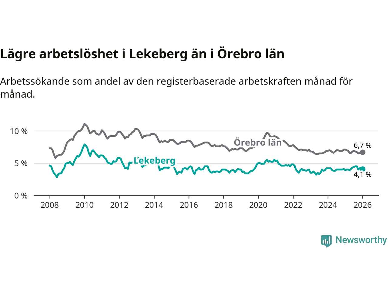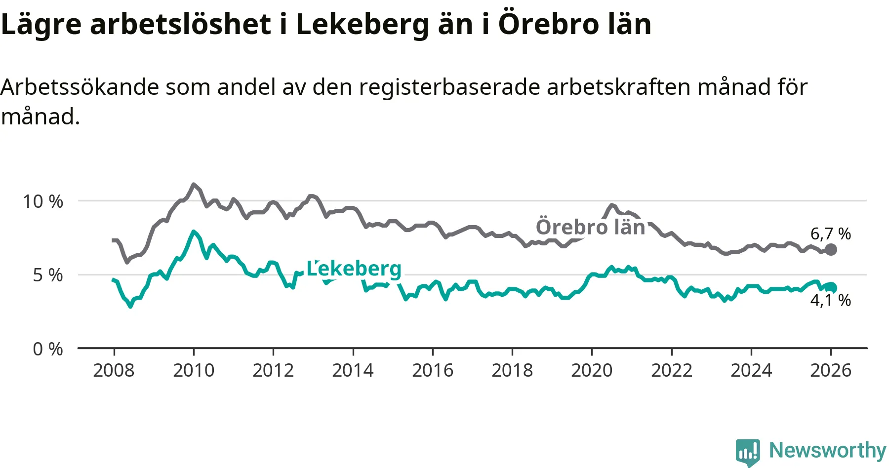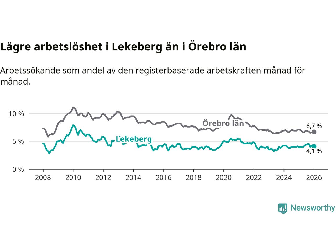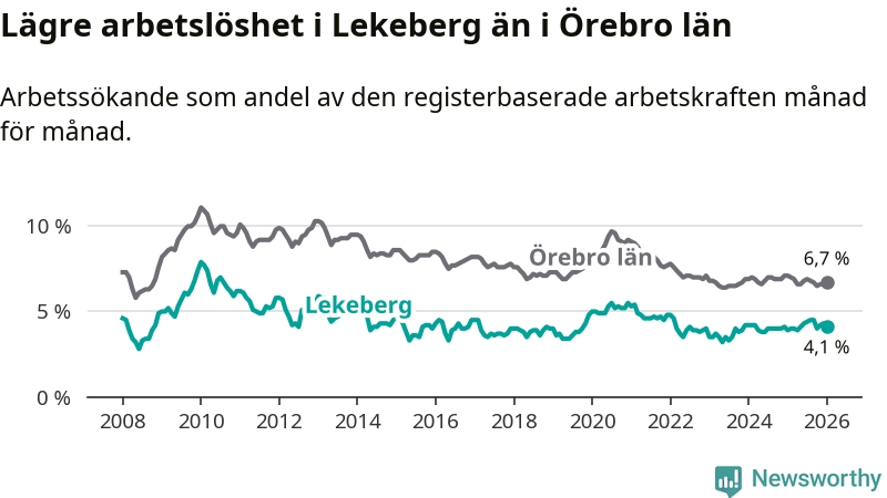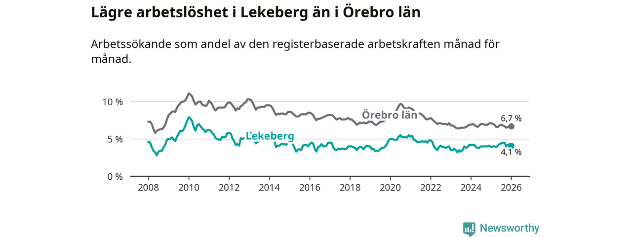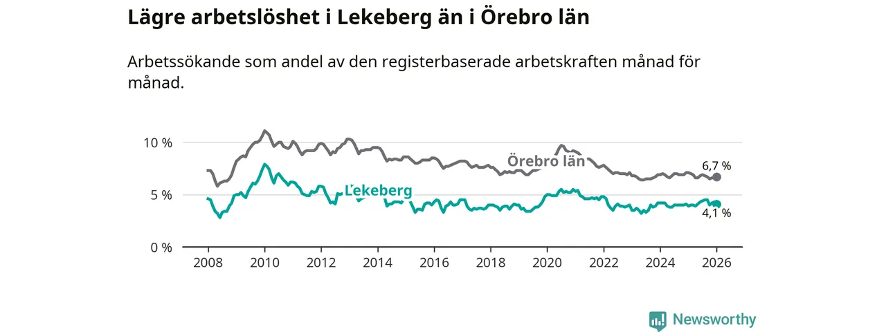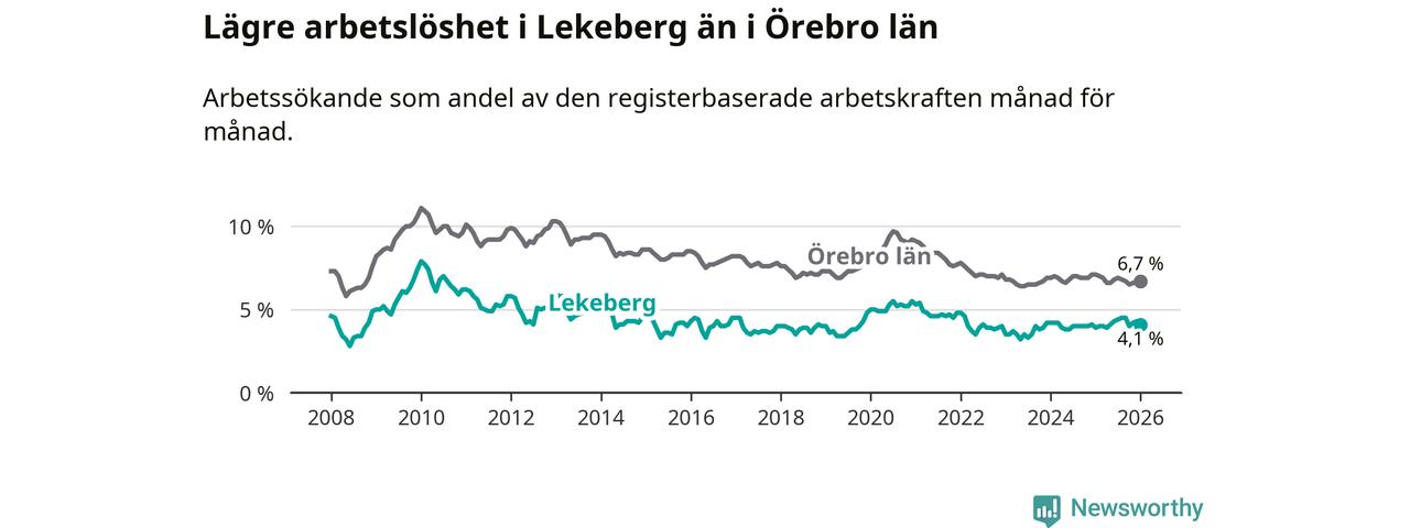 Under januari månad rapporterade Lekebergs kommun en total arbetslöshet på 4,1 procent. Det är en ökning jämfört med samma tidpunkt i fjol (+0,2 procentenheter). I Örebro län däremot sjunker arbetslösheten .