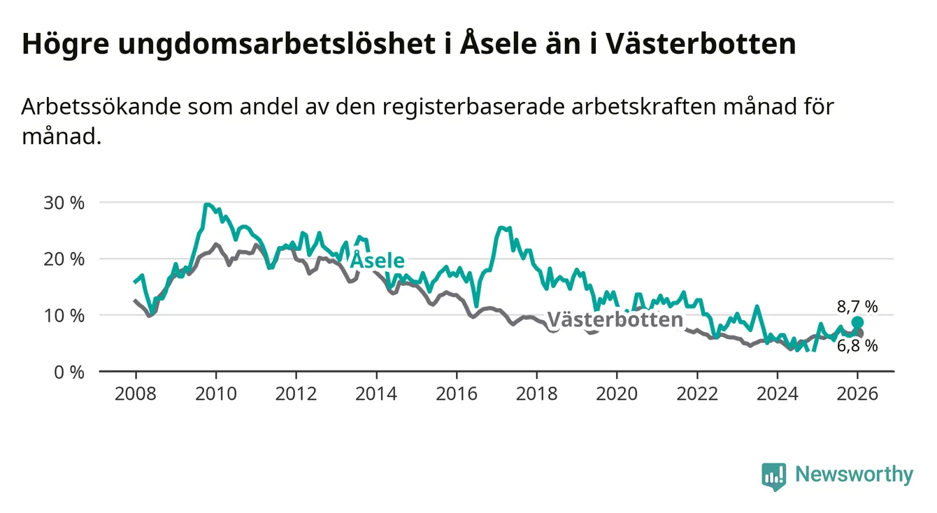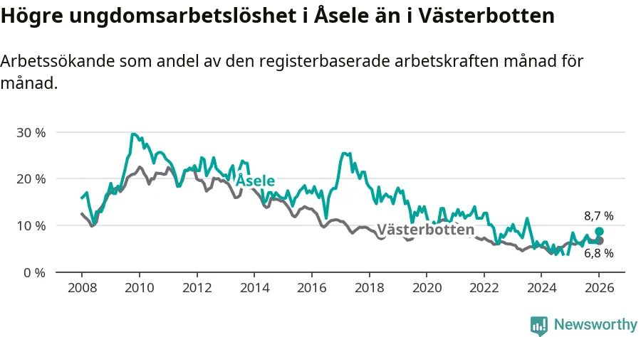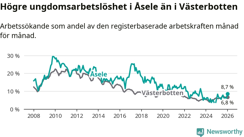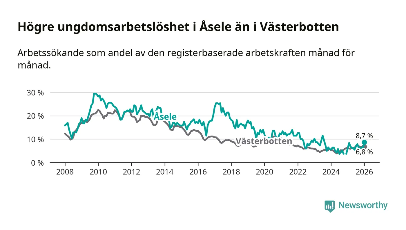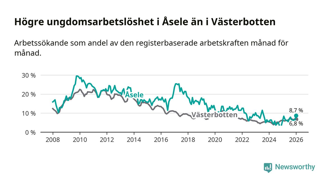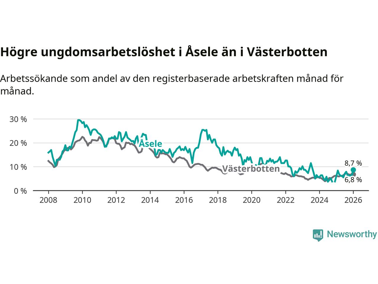 Precis som den totala arbetslösheten ligger ungdomsarbetslösheten i Åsele högre än i Västerbotten som helhet. Skillnaden mellan kommunen och länet är 1,9 procentenheter.