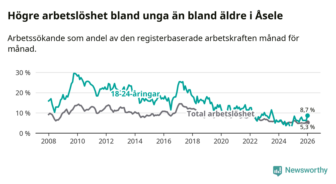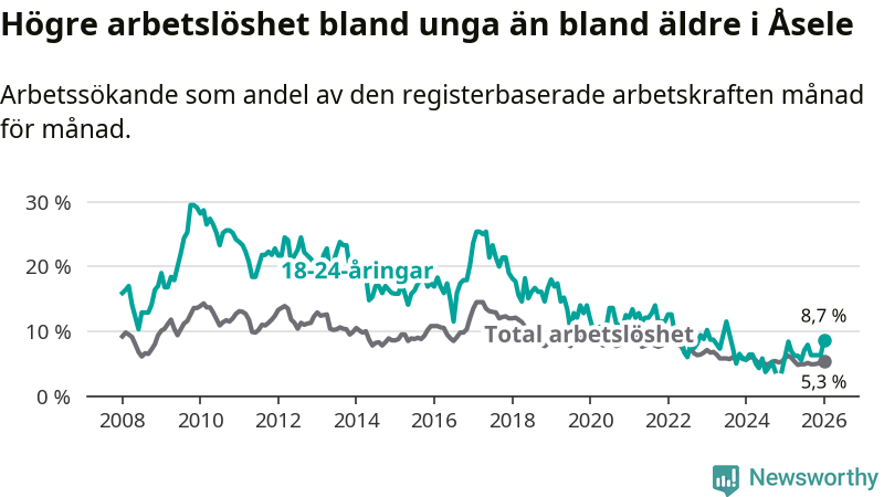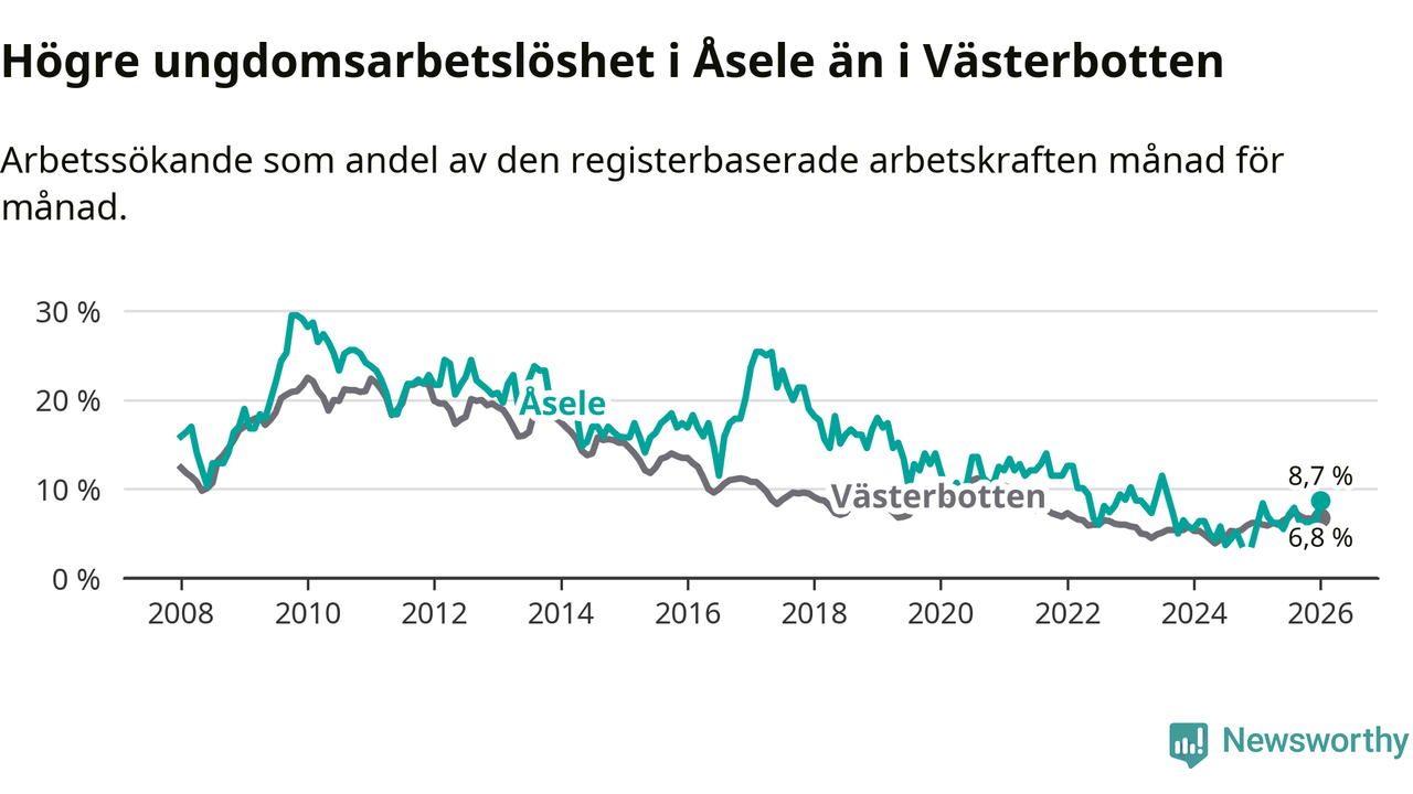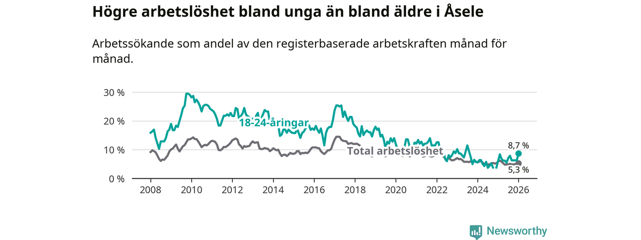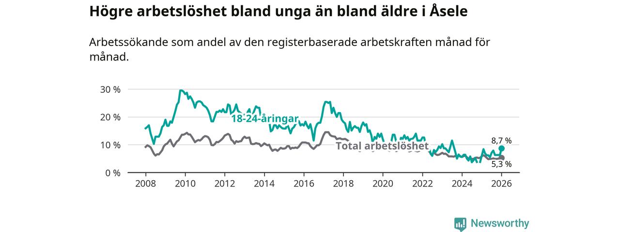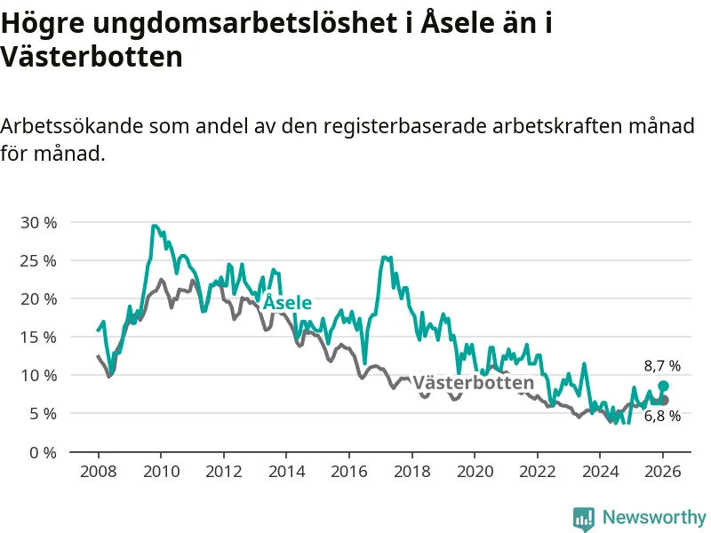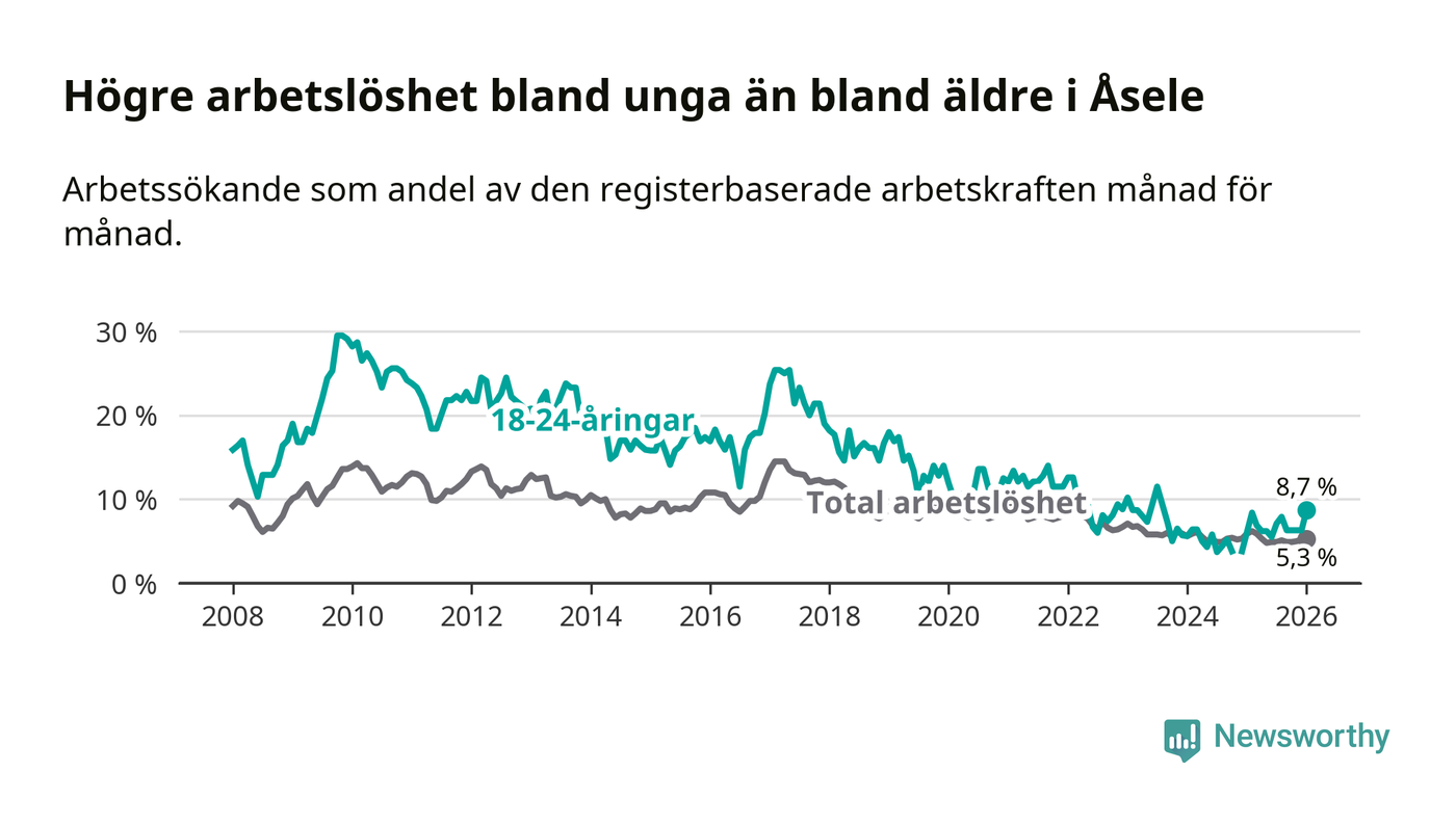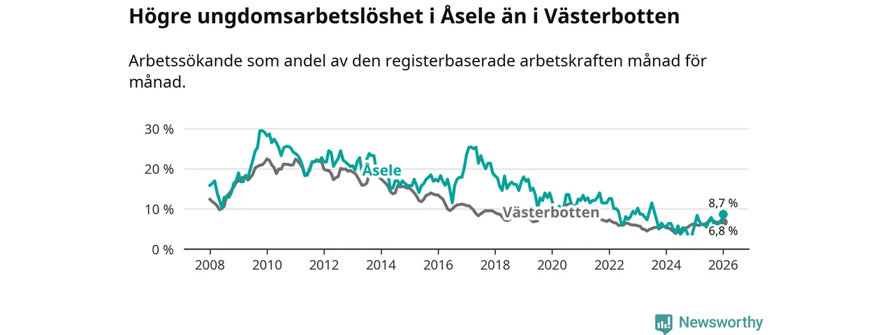 Precis som den totala arbetslösheten ligger ungdomsarbetslösheten i Åsele högre än i Västerbotten som helhet. Skillnaden mellan kommunen och länet är 1,9 procentenheter.