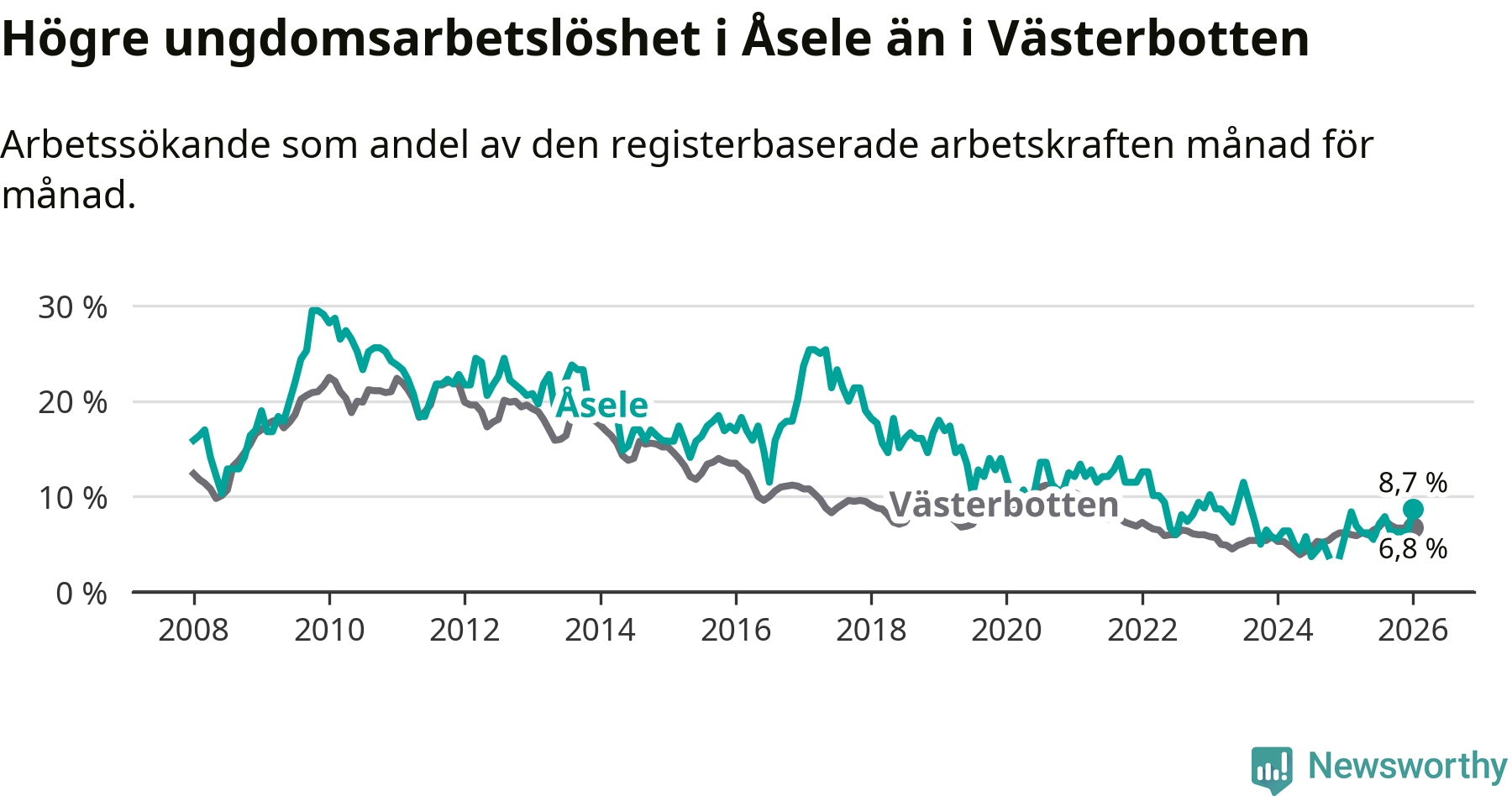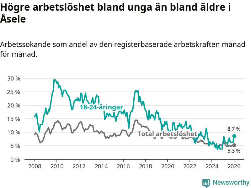 Graf: Arbetslöshet bland unga i Åsele kommun och Västerbottens län