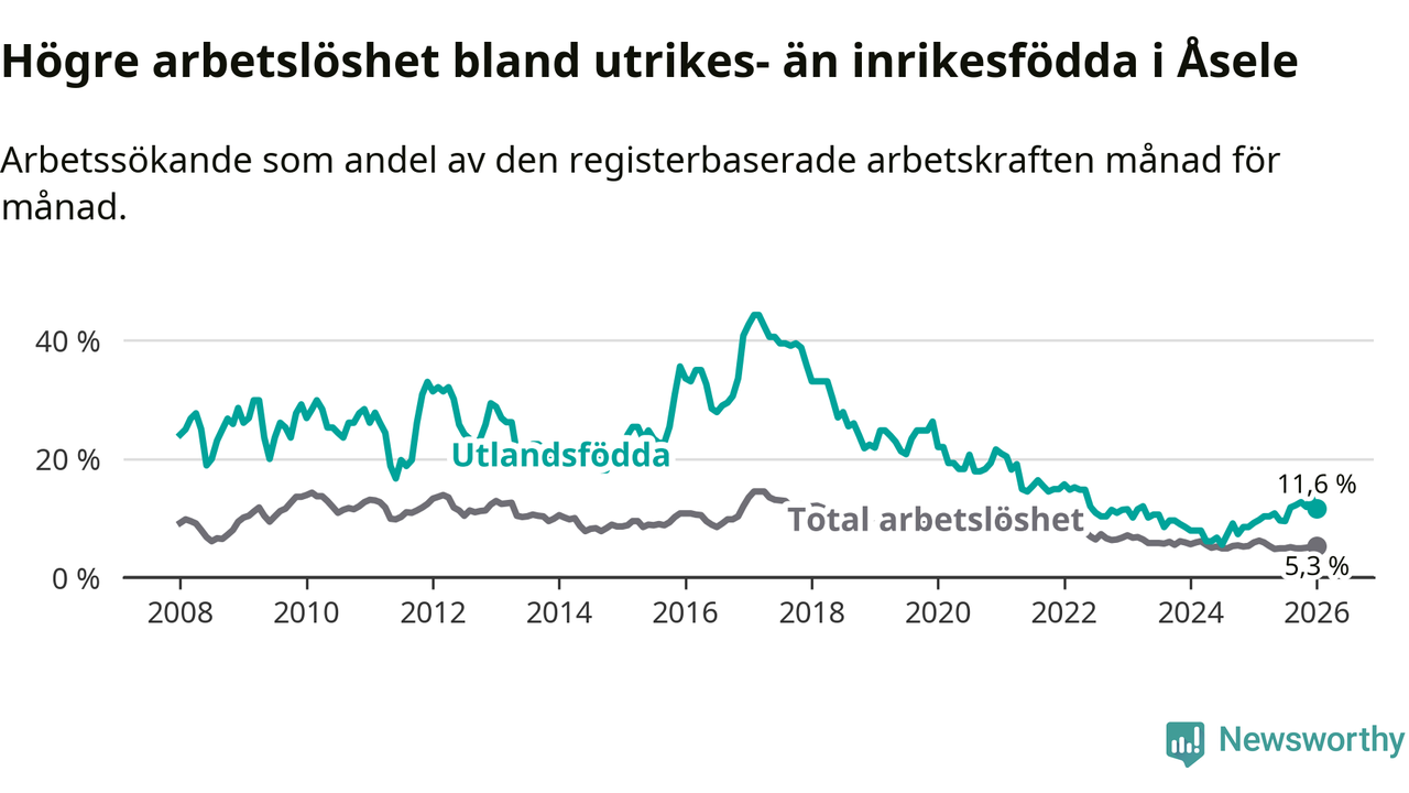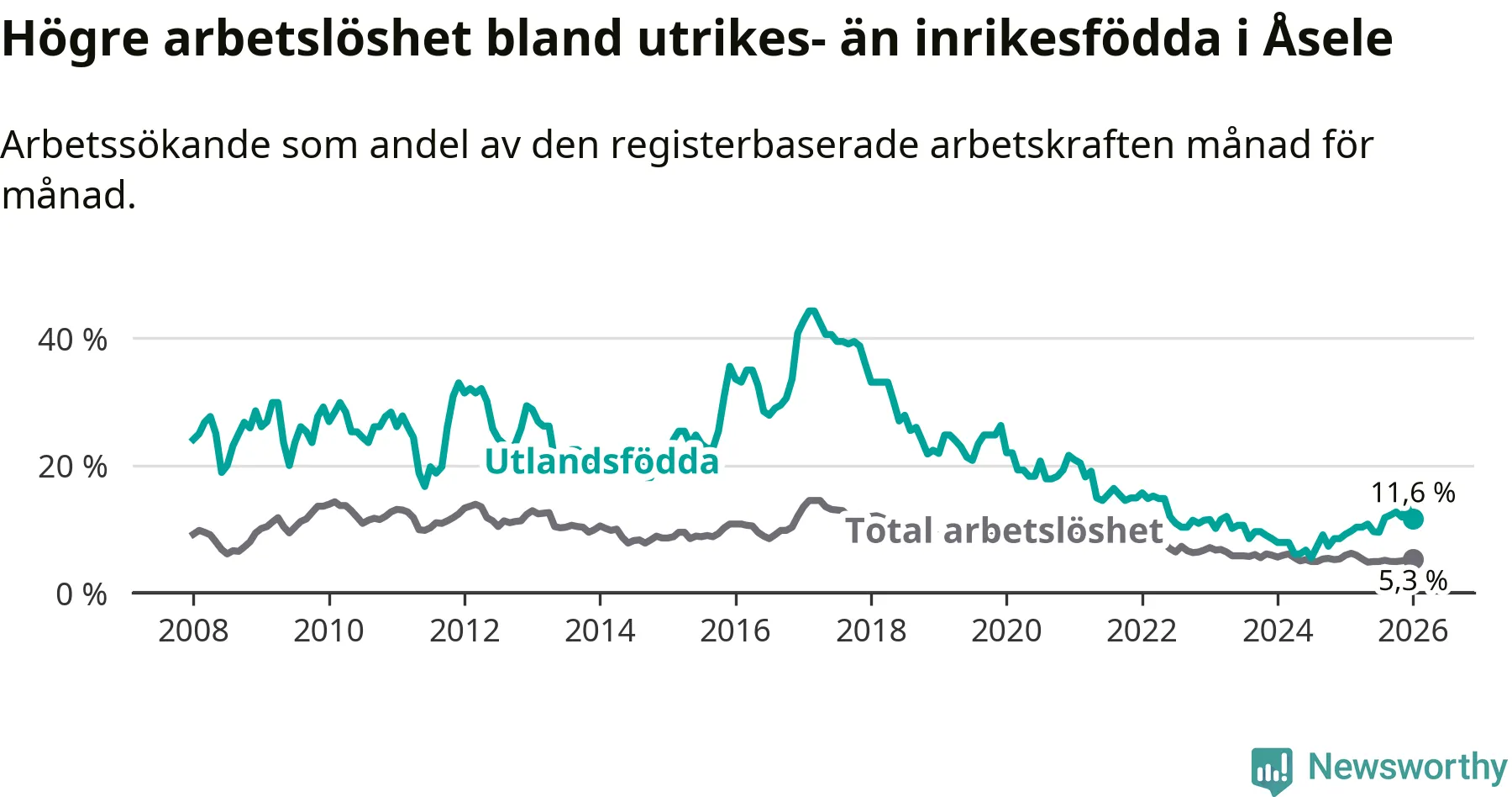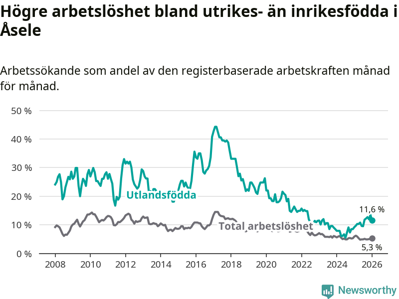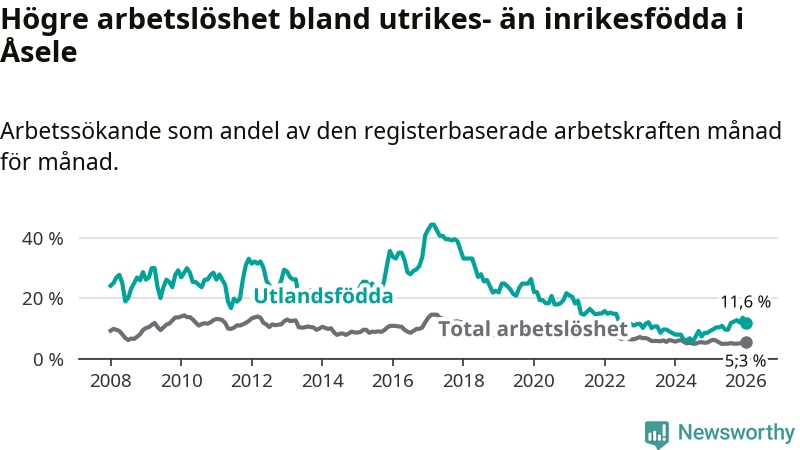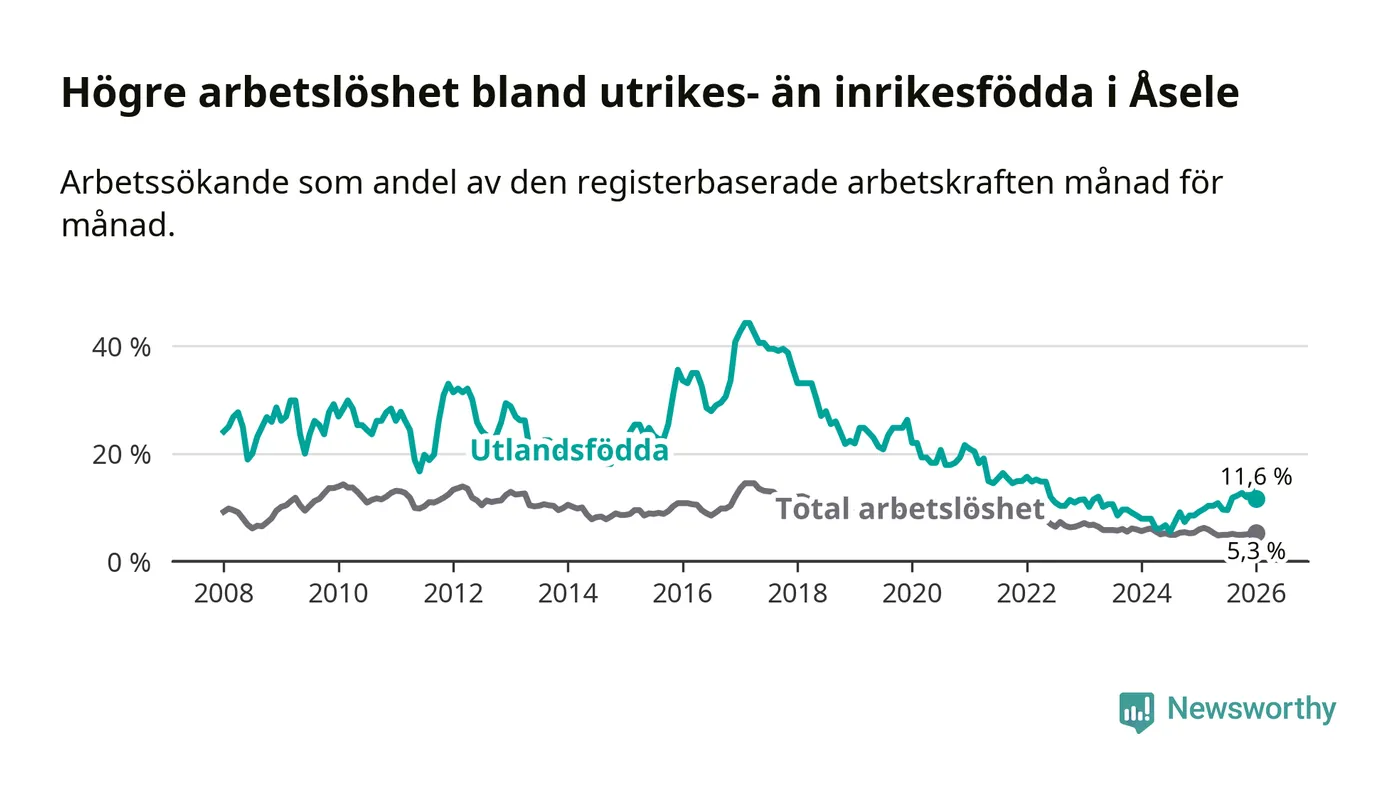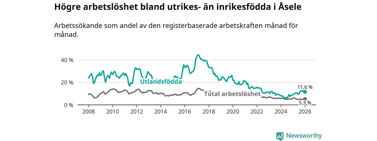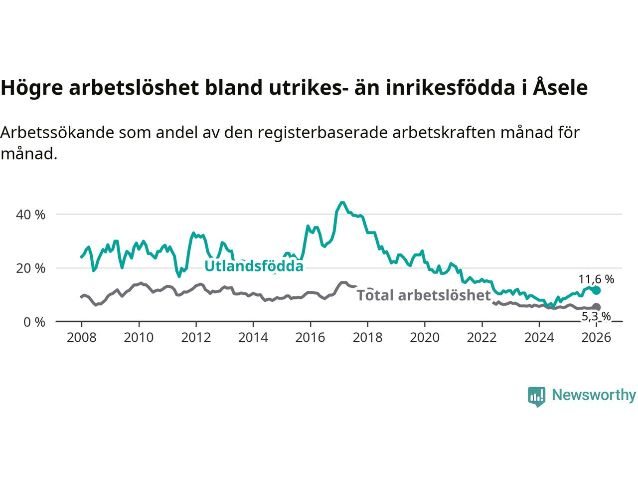 Arbetslösheten bland utlandsfödda var 11,6 procent i Åsele under januari månad, motsvarande 21 av 181 personer. Det är 2,4 procentenheter fler än vid samma tidpunkt i fjol (+6 om man räknar personer). Därmed är de utlandsföddas arbetslöshet högre än vid samma tidpunkt i fjol för 13:e månaden i följd. Sedan december 2024 har arbetslösheten bland utlandsfödda ökat från 8,5 till 11,6 procent.