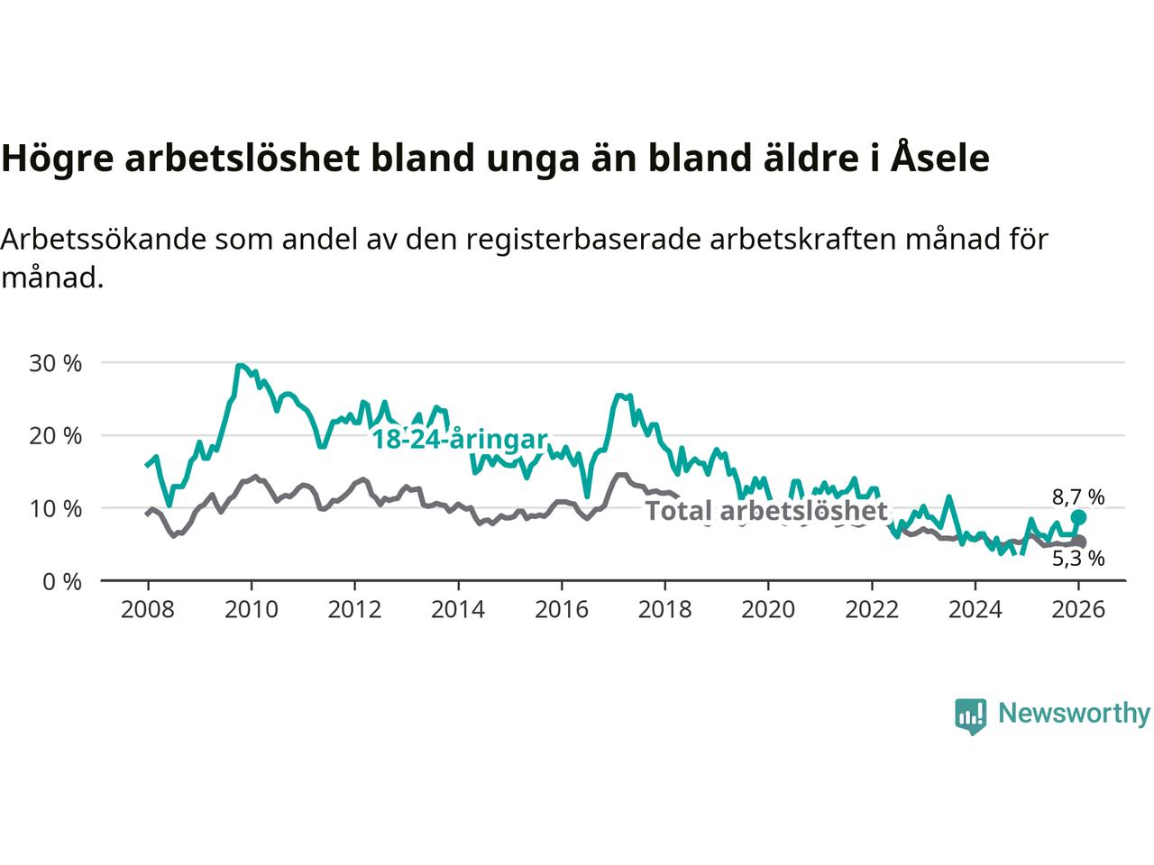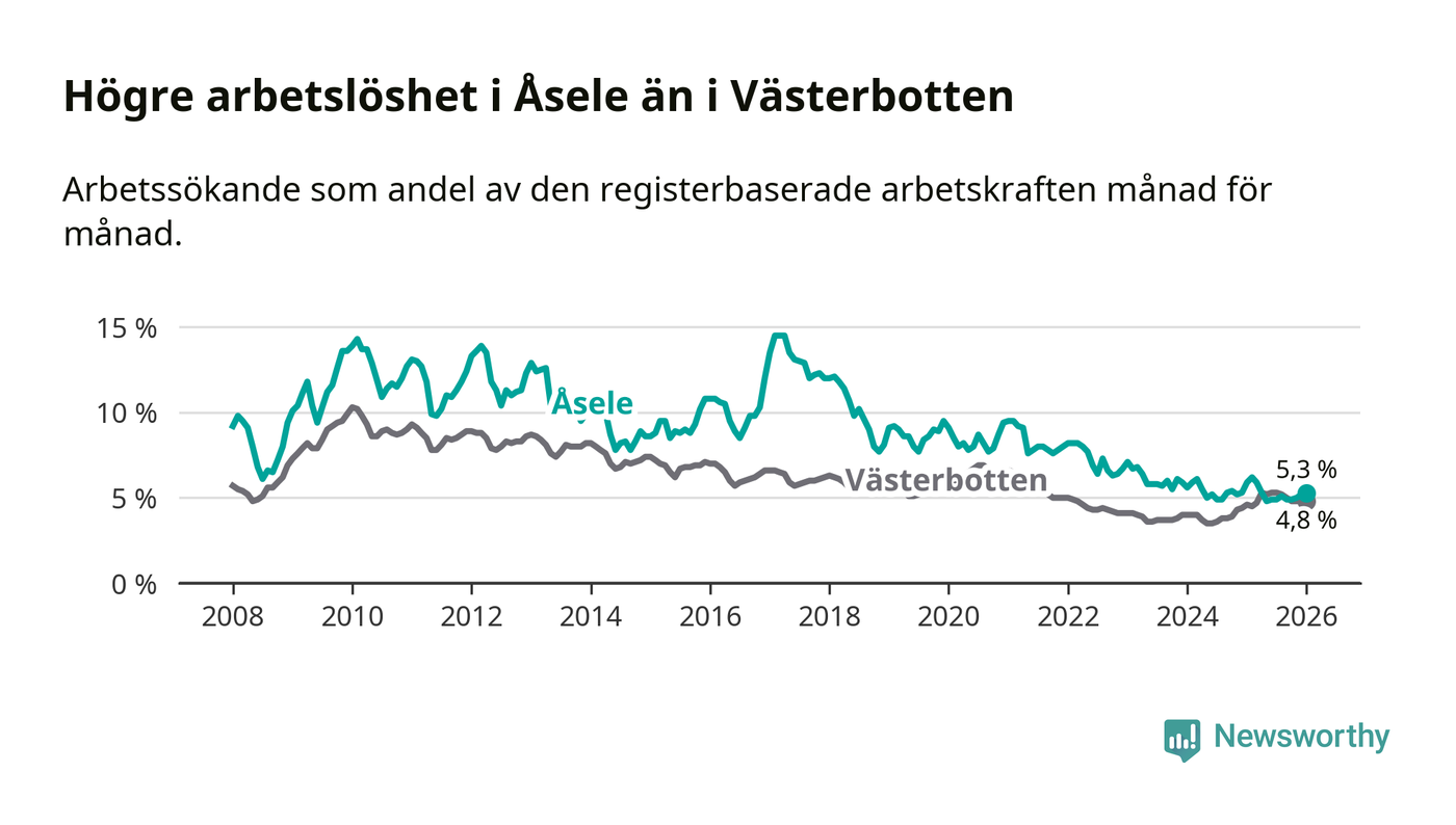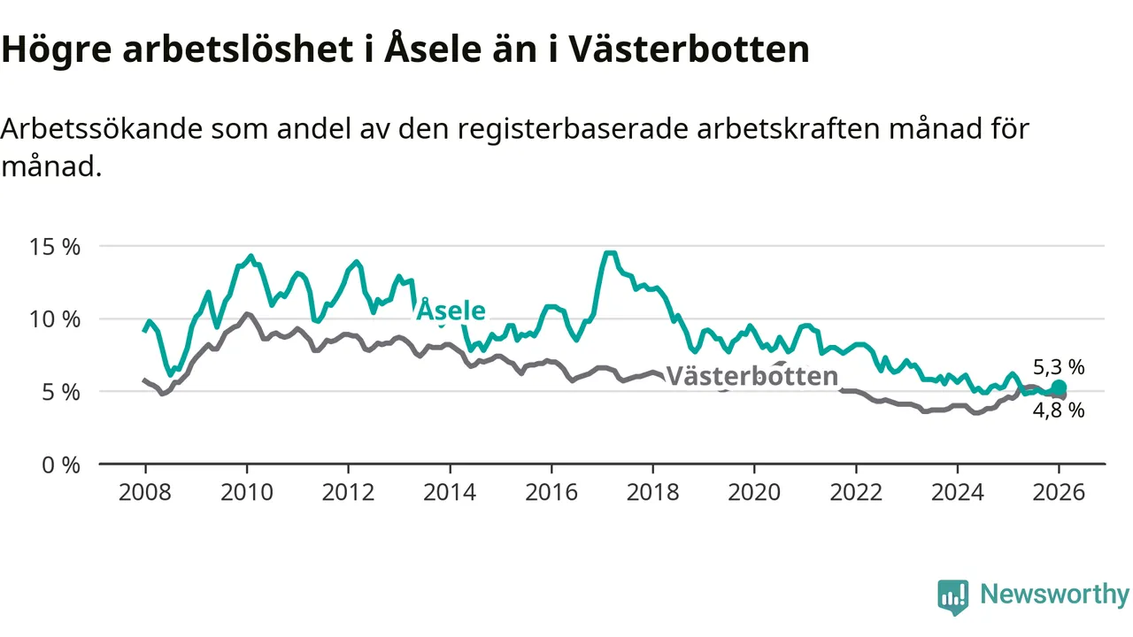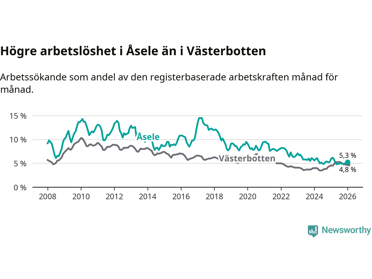 Under januari månad rapporterade Åsele kommun en total arbetslöshet på 5,3 procent. Det är en minskning jämfört med samma tidpunkt i fjol (−0,6 procentenheter). I Västerbottens län däremot stiger arbetslösheten .