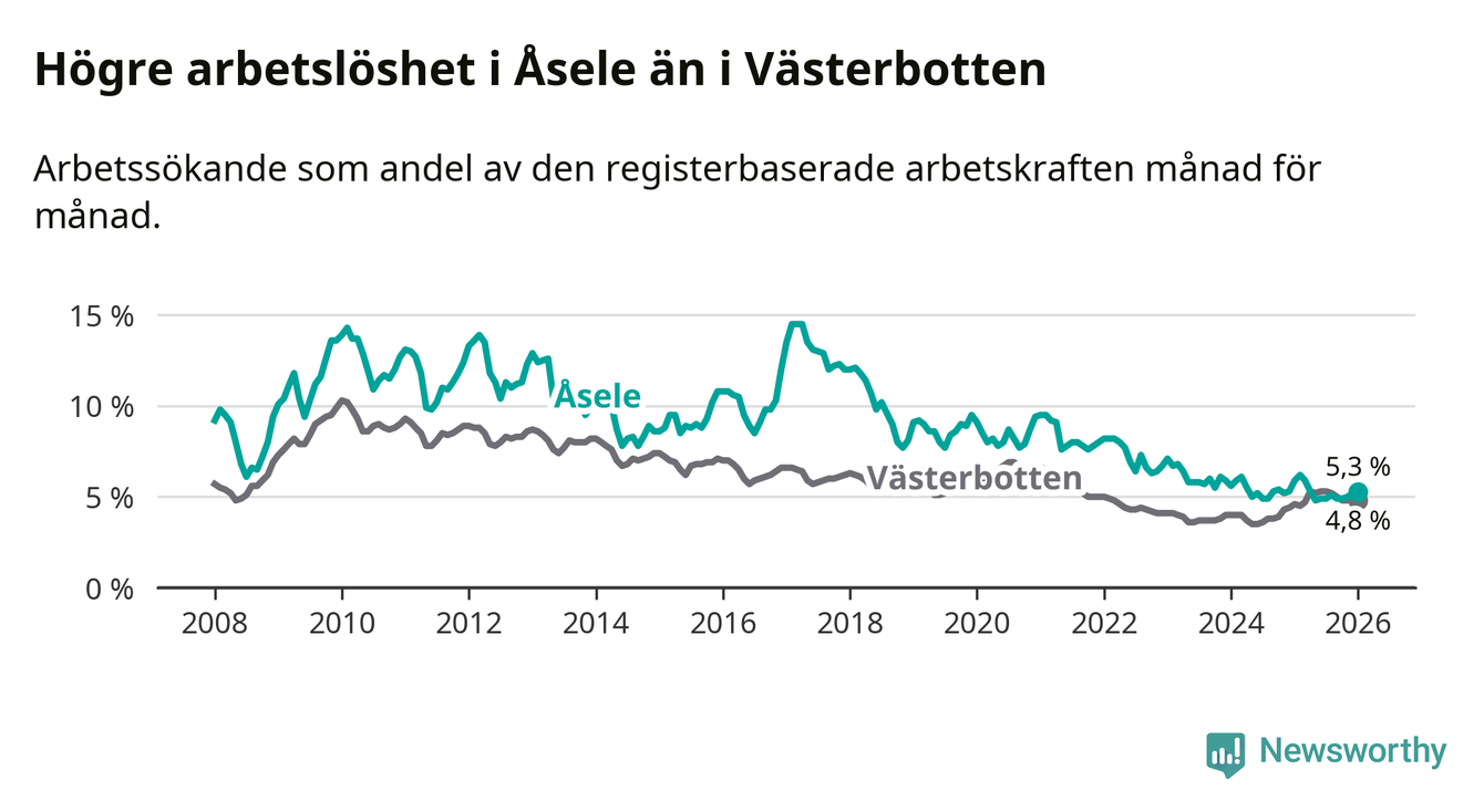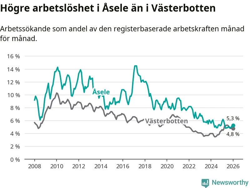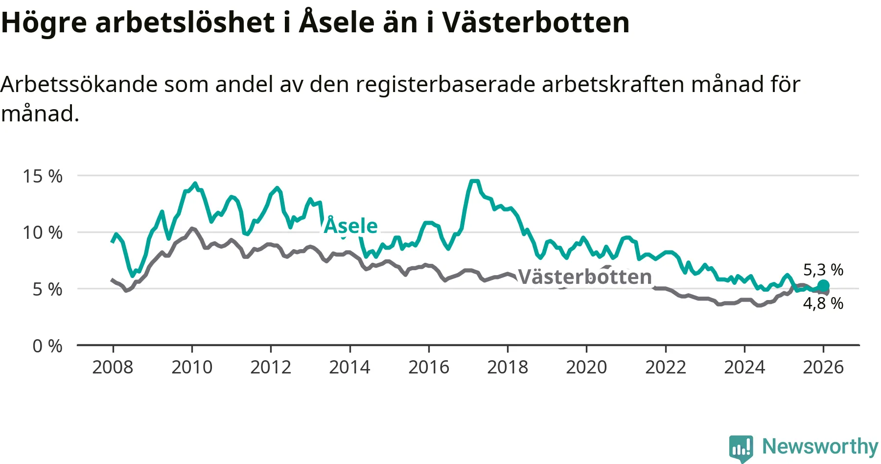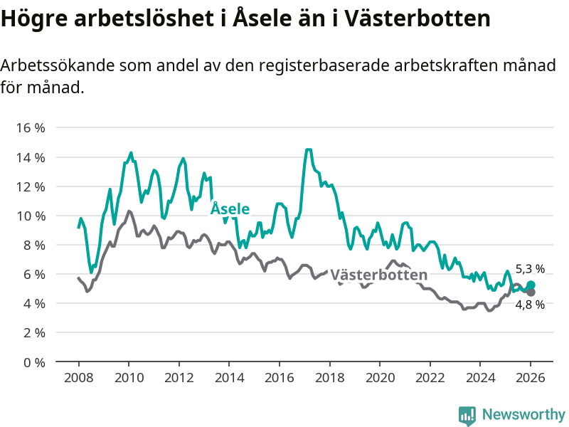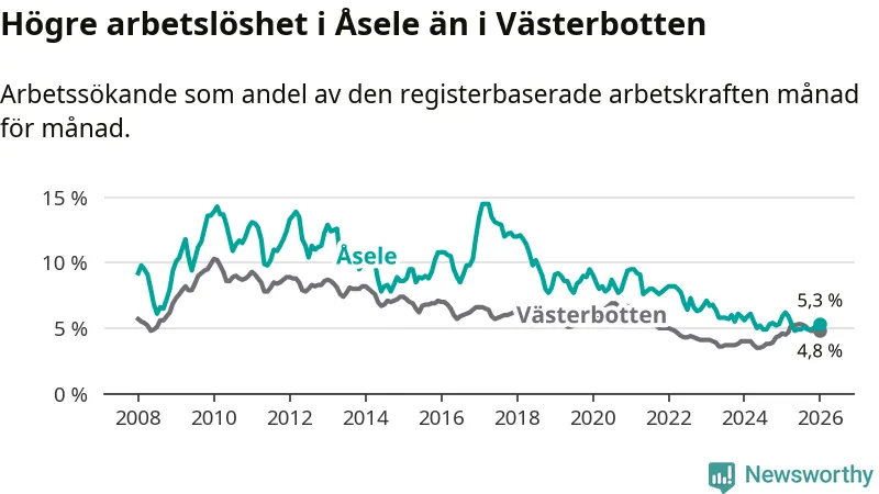 Under januari månad rapporterade Åsele kommun en total arbetslöshet på 5,3 procent. Det är en minskning jämfört med samma tidpunkt i fjol (−0,6 procentenheter). I Västerbottens län däremot stiger arbetslösheten .