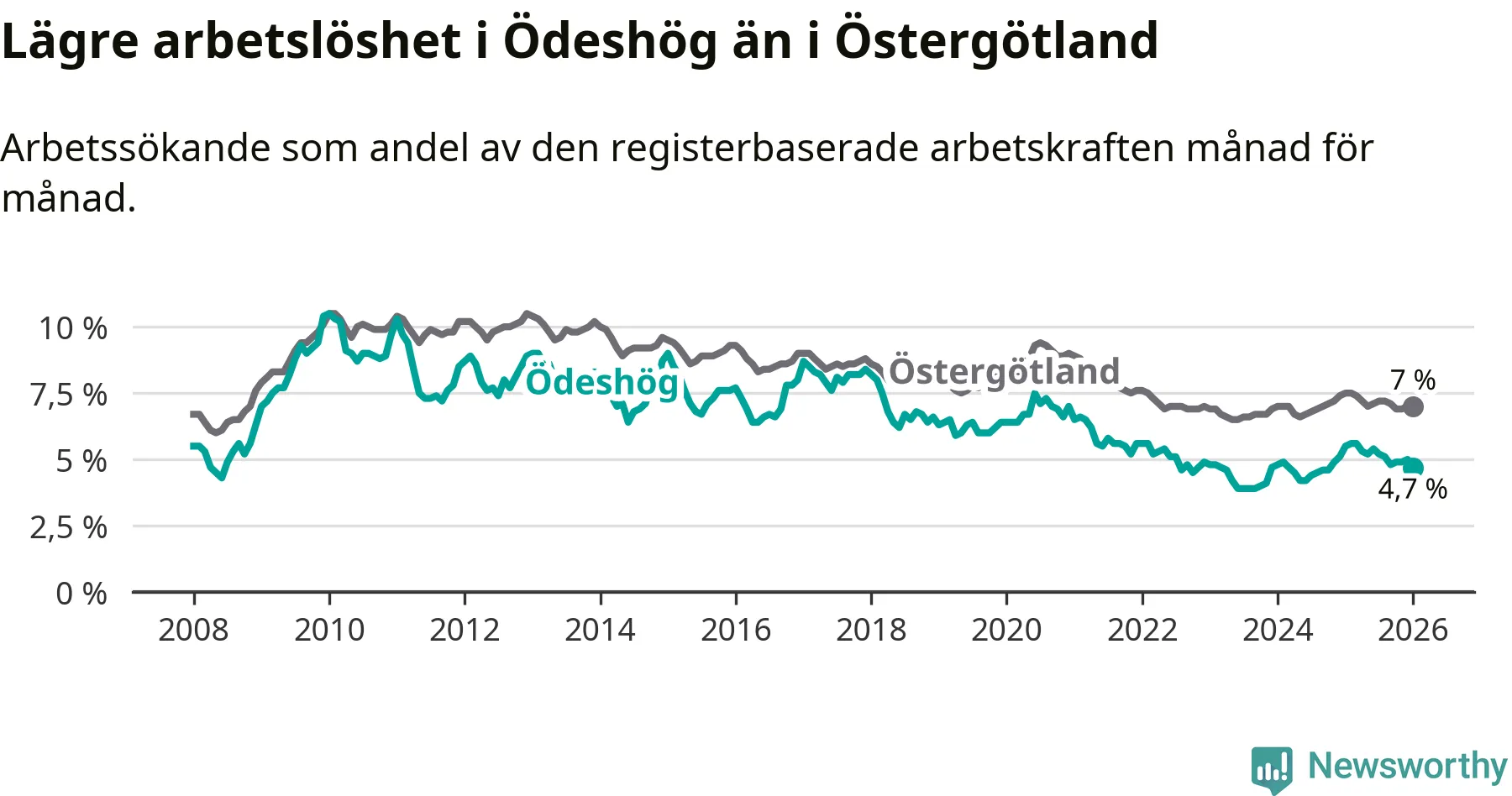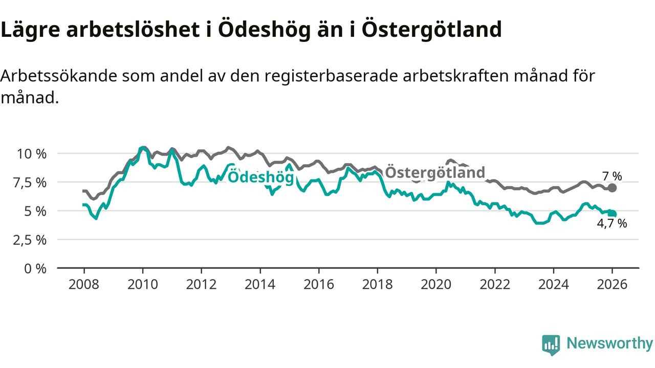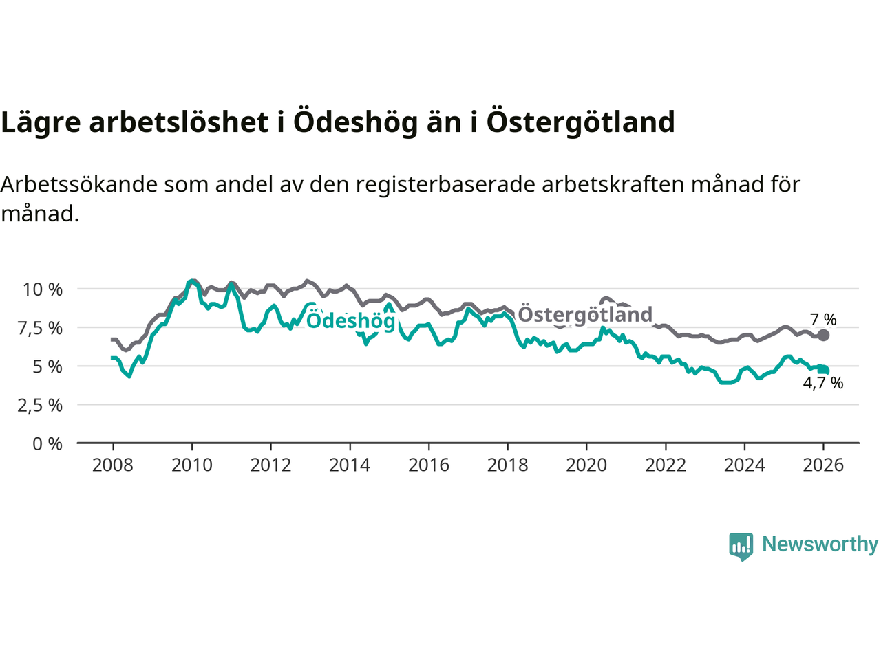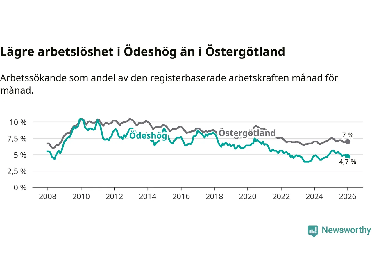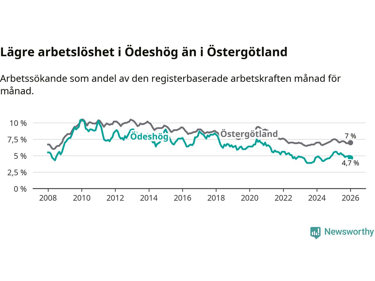 Under januari månad rapporterade Ödeshögs kommun en total arbetslöshet på 4,7 procent. Det är en minskning jämfört med samma tidpunkt i fjol (−0,8 procentenheter). Även i Östergötlands län sjunker arbetslösheten .