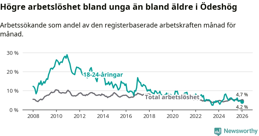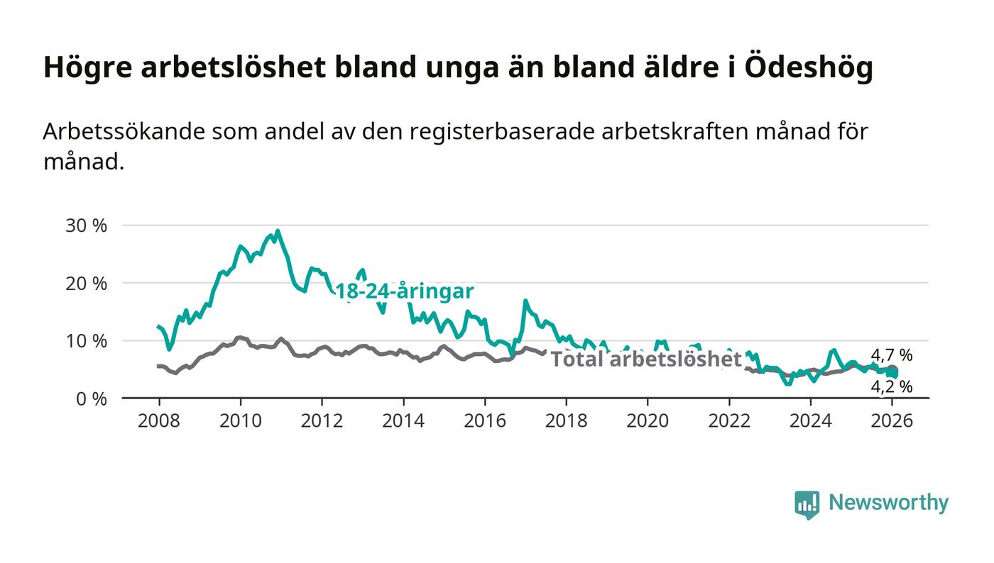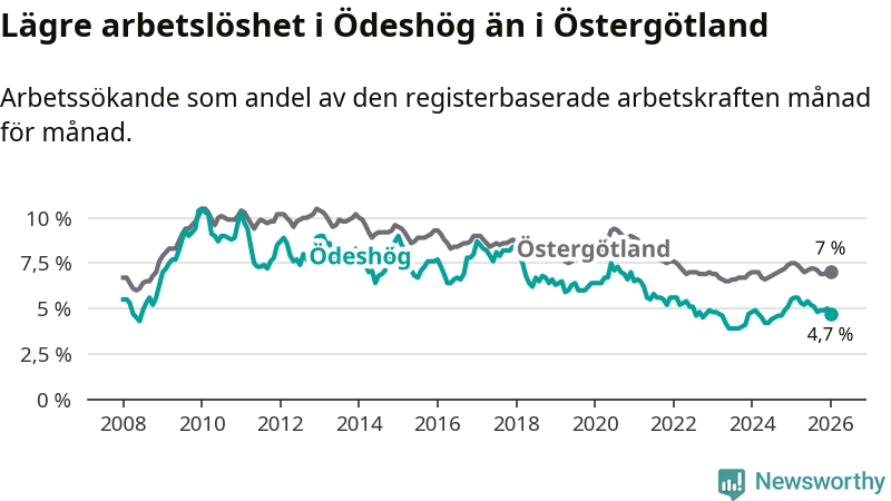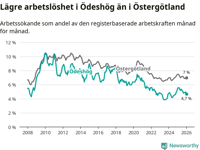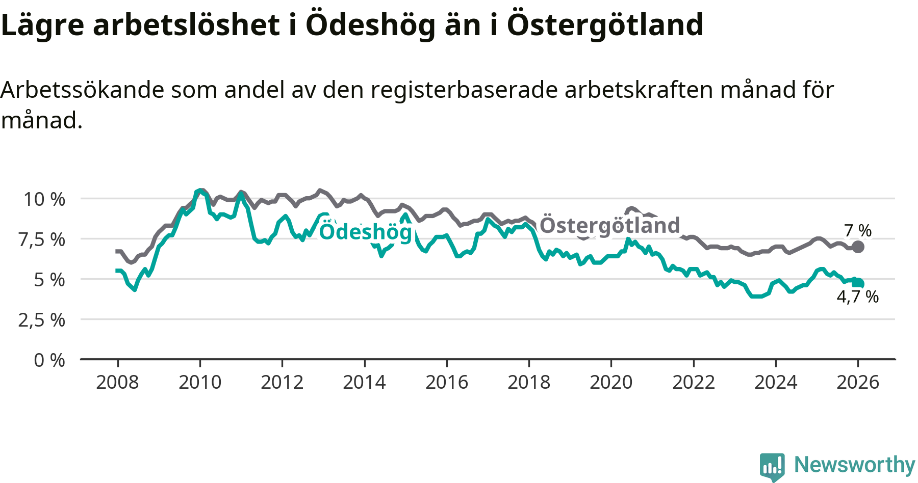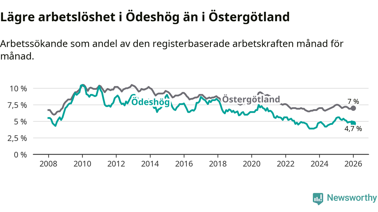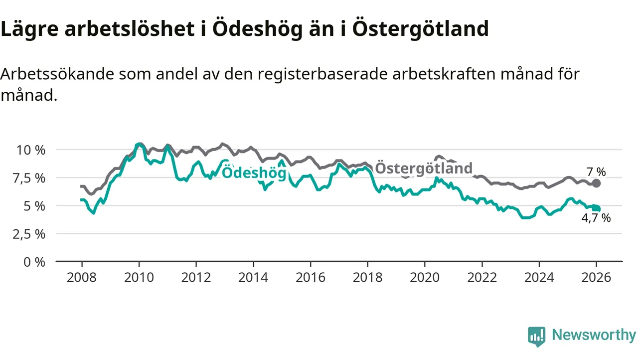 Under januari månad rapporterade Ödeshögs kommun en total arbetslöshet på 4,7 procent. Det är en minskning jämfört med samma tidpunkt i fjol (−0,8 procentenheter). Även i Östergötlands län sjunker arbetslösheten .