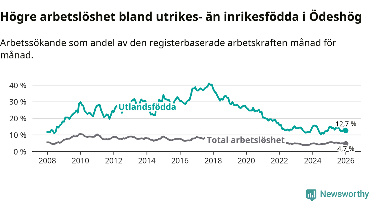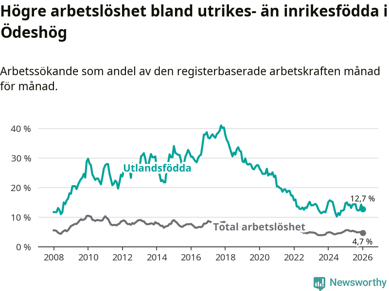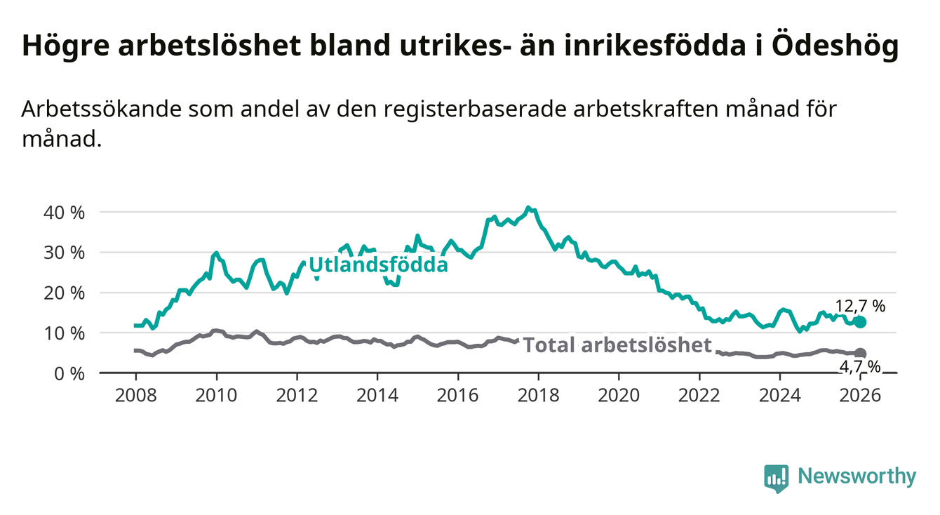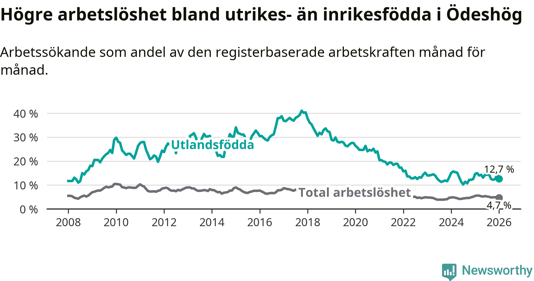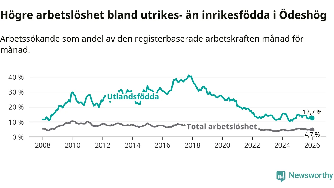 Arbetslösheten bland utlandsfödda var 12,7 procent i Ödeshög under januari månad, motsvarande 42 av 331 personer. Det är 2,0 procentenheter färre än vid samma tidpunkt i fjol (−6 om man räknar personer). Den senaste månadens nedgång innebär ett trendbrott. Under de två föregående månaderna hade arbetslösheten bland utlandsfödda varit högre än motsvarande tidpunkt året innan.