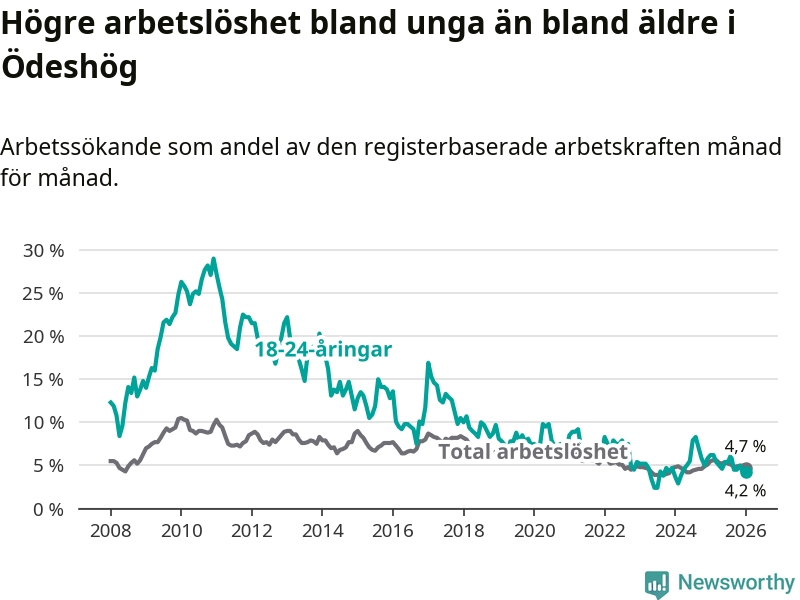 Precis som den totala arbetslösheten sjunker arbetslösheten bland unga (−2 procentenheter). I januari var 4,2 procent av 18–24-åringarna inskrivna som arbetssökande (motsvarande tio personer). Mäter vi antalet inskrivna ser vi en minskning med fem personer på ett års sikt.
