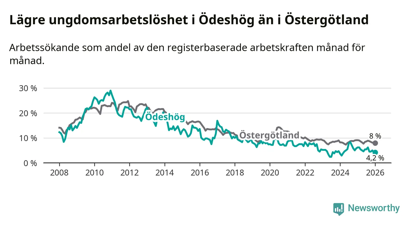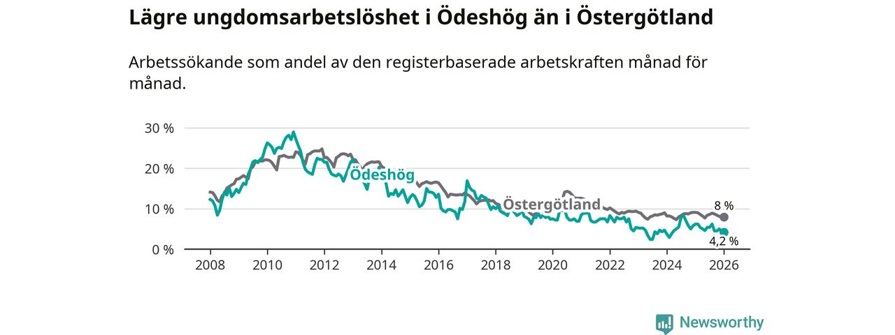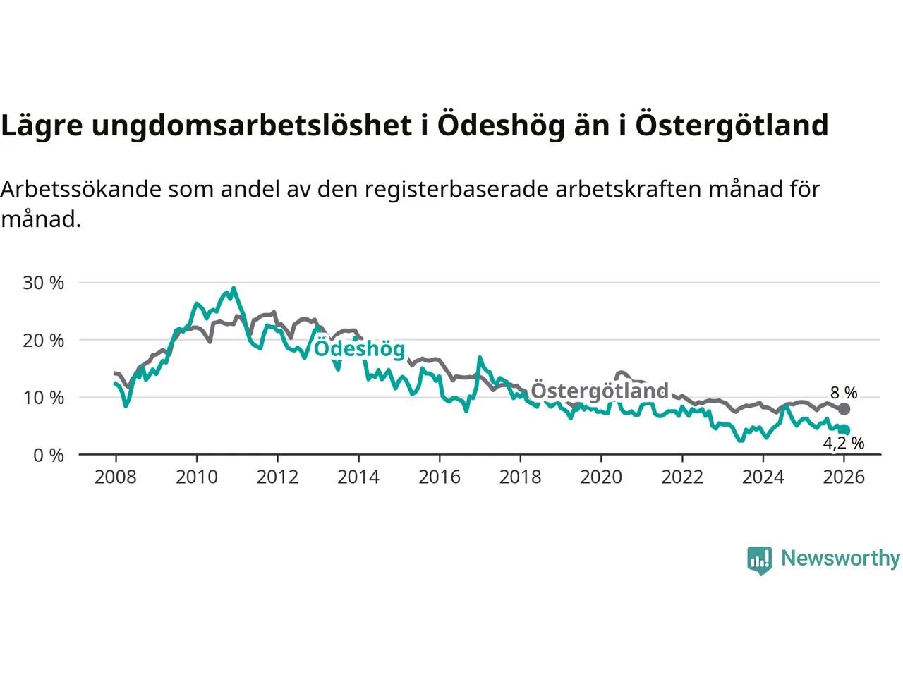 Precis som den totala arbetslösheten ligger ungdomsarbetslösheten i Ödeshög lägre än i Östergötland som helhet. Skillnaden mellan kommunen och länet är 3,8 procentenheter.