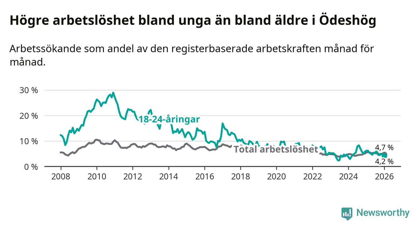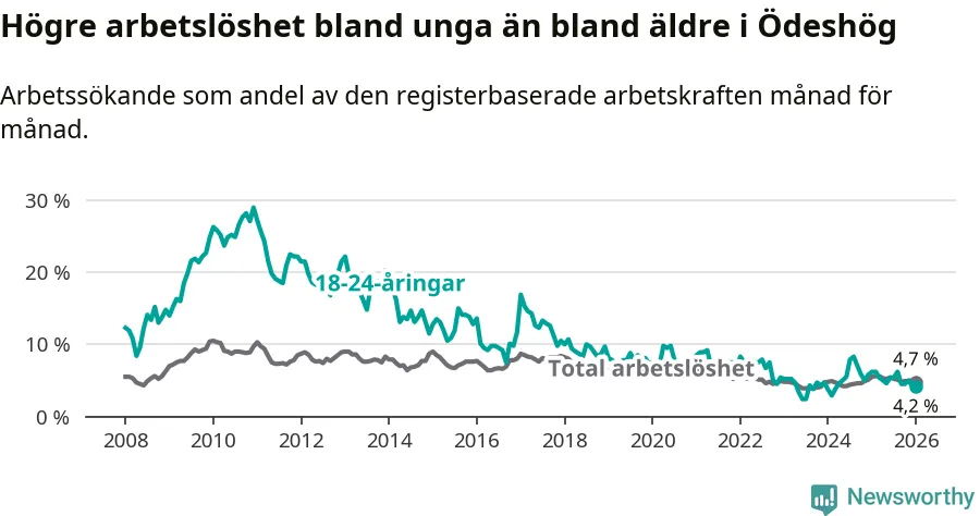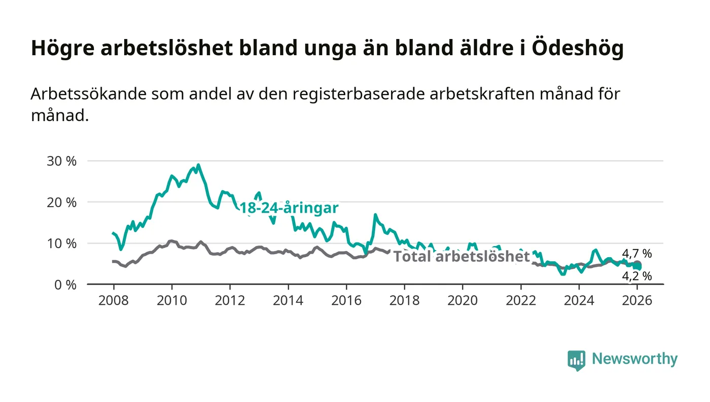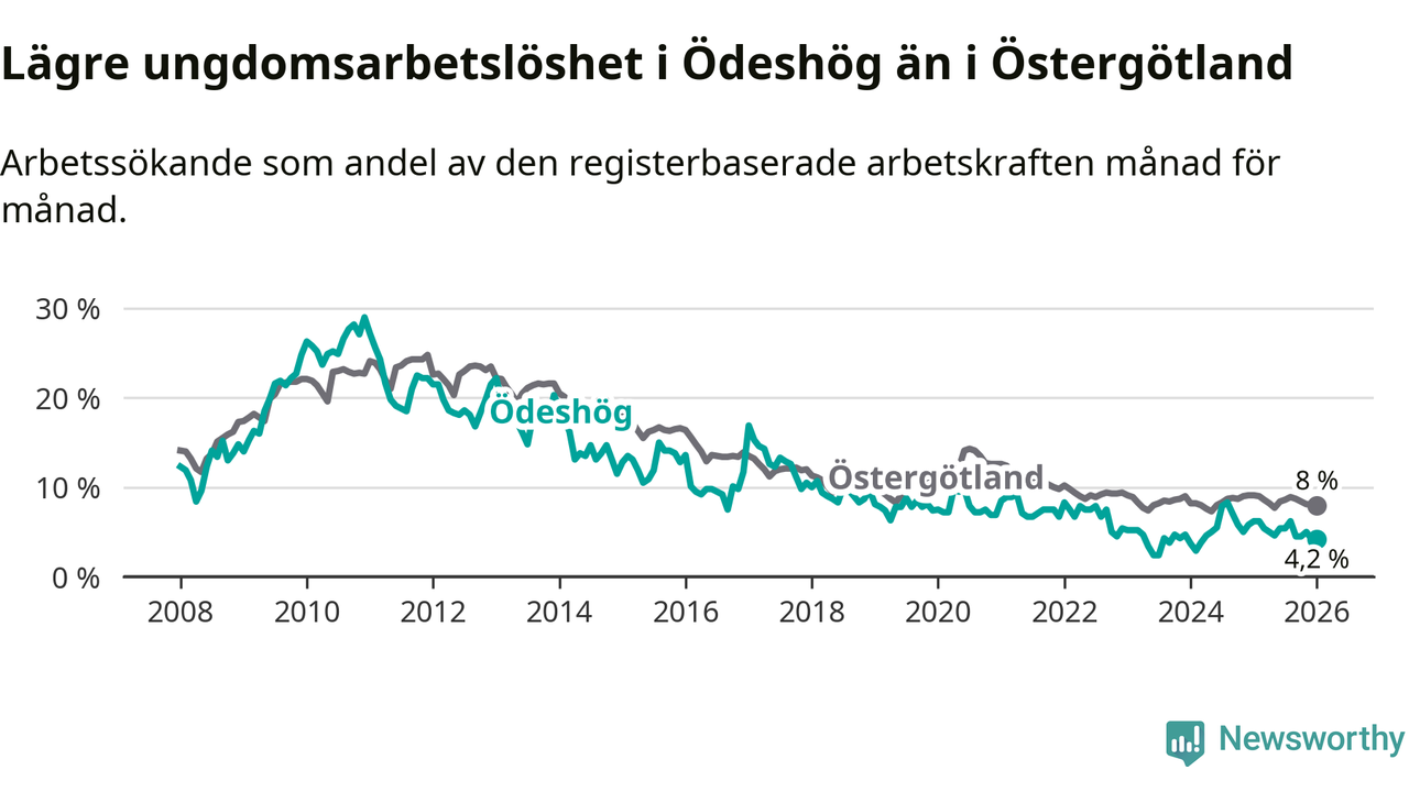 Precis som den totala arbetslösheten ligger ungdomsarbetslösheten i Ödeshög lägre än i Östergötland som helhet. Skillnaden mellan kommunen och länet är 3,8 procentenheter.