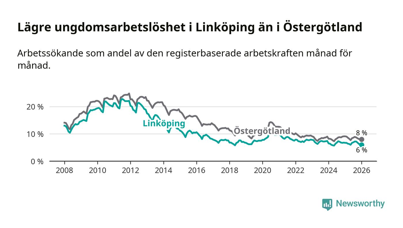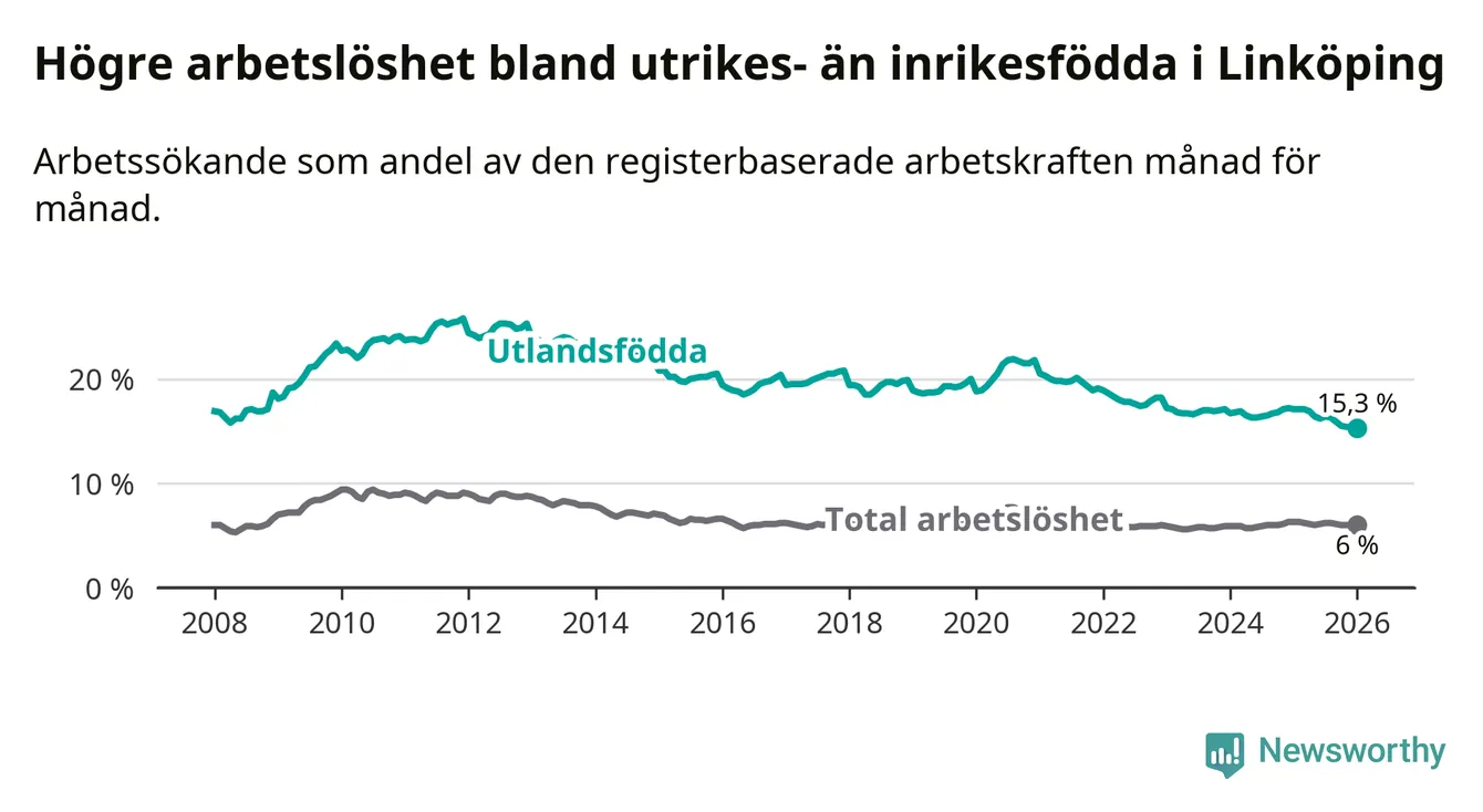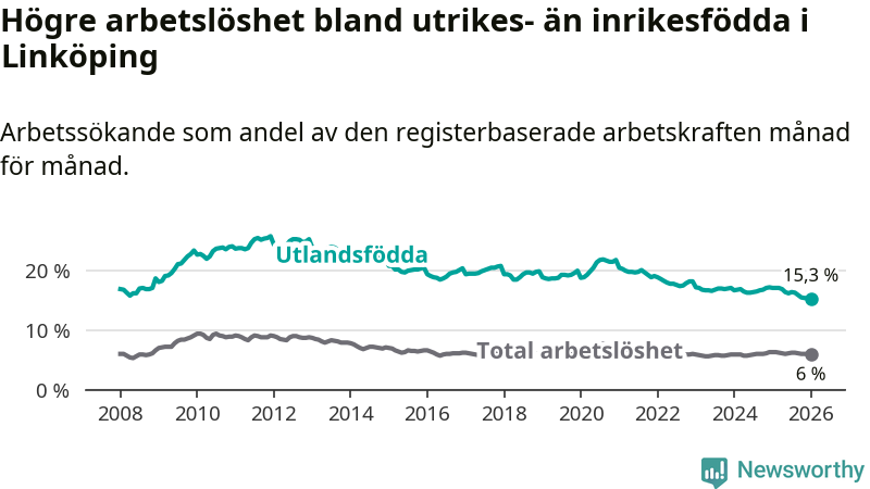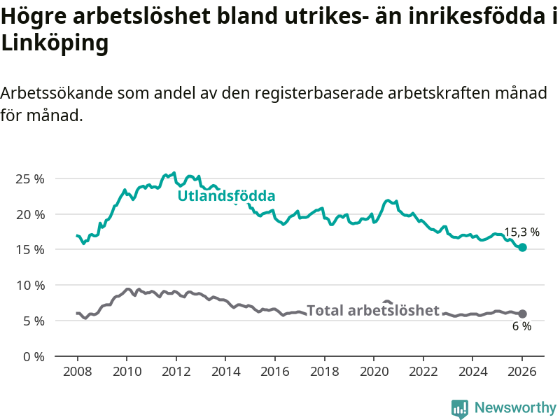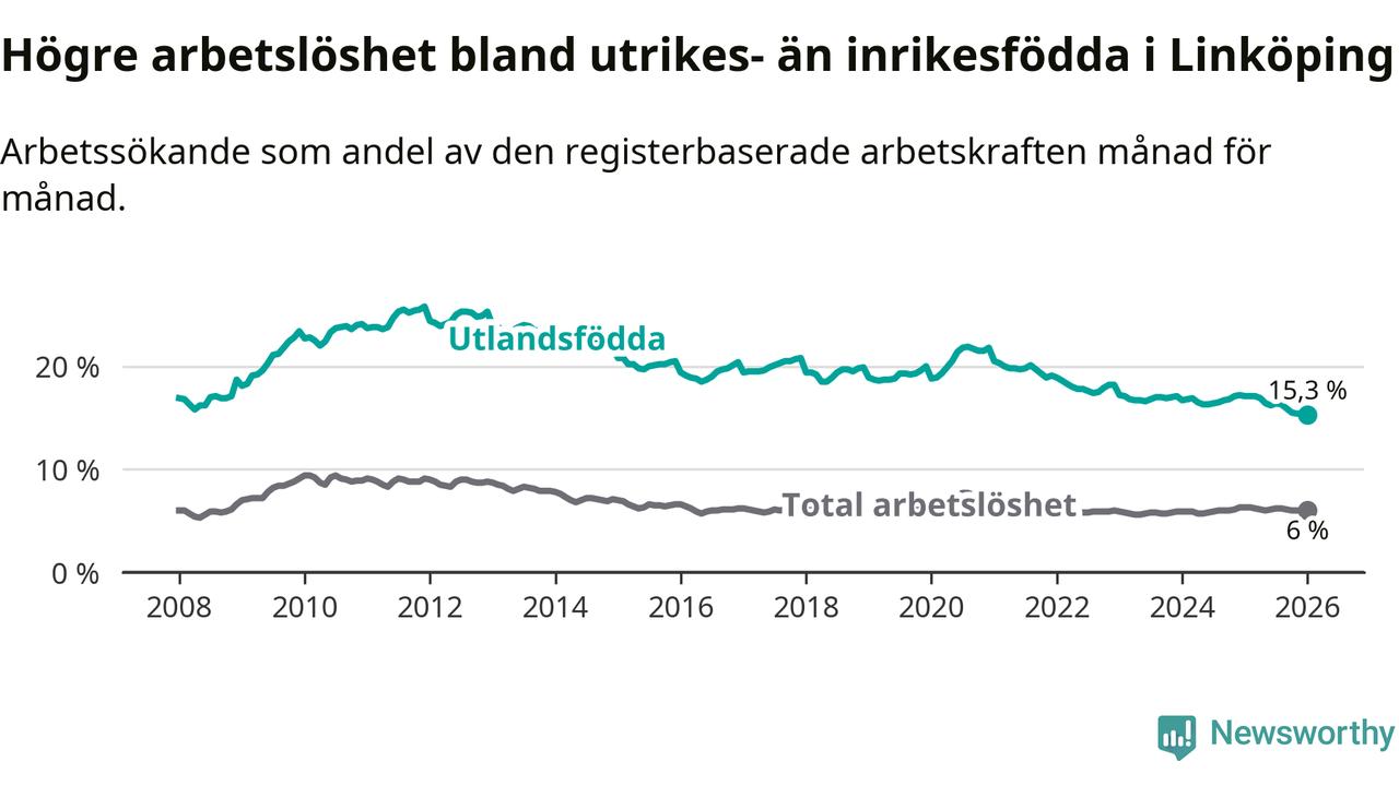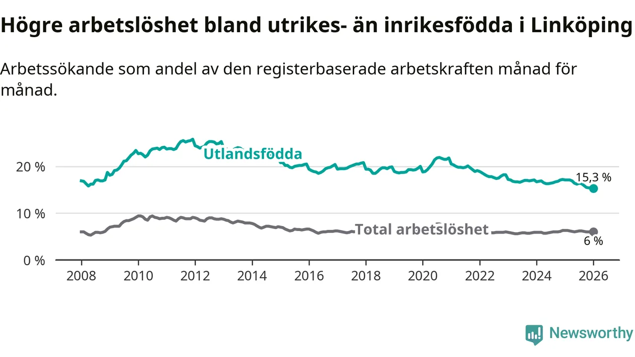 Arbetslösheten bland utlandsfödda var 15,3 procent i Linköping under januari månad, motsvarande 2 943 av 19 235 personer. Det är 1,8 procentenheter färre än vid samma tidpunkt i fjol (−271 om man räknar personer). Därmed är de utlandsföddas arbetslöshet lägre än vid samma tidpunkt i fjol för sjätte månaden i följd. Sedan juli 2025 har arbetslösheten bland utlandsfödda minskat från 16,4 till 15,3 procent. Den nuvarande arbetslöshetsnivån är den lägsta sedan januari 2008.