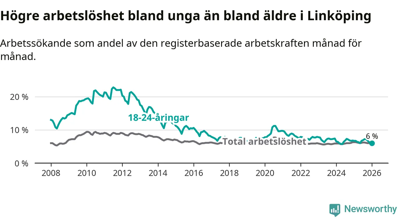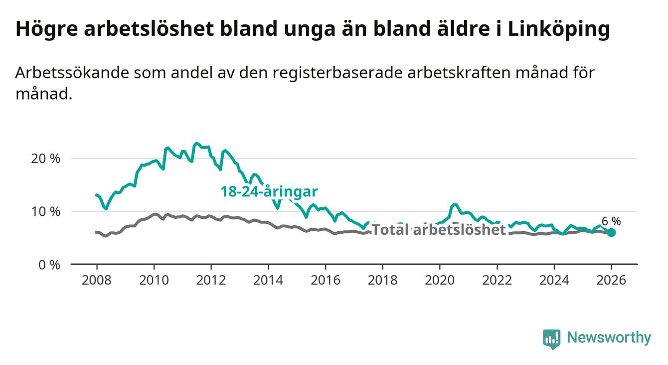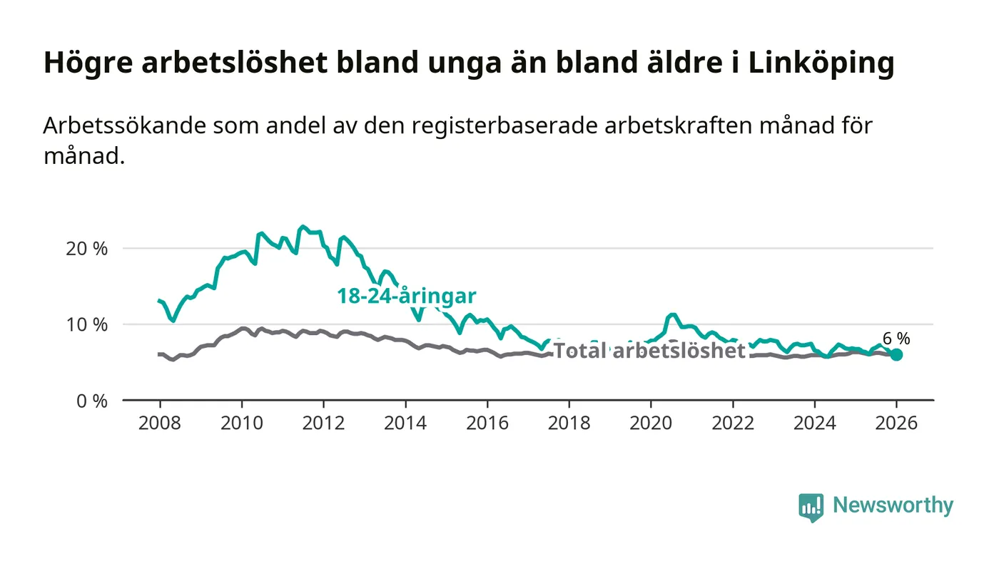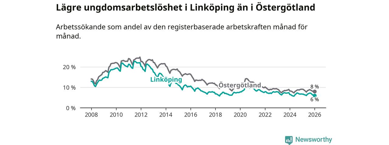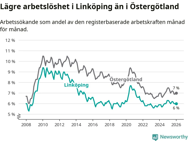 Arbetslösheten bland utlandsfödda var 15,3 procent i Linköping under januari månad, motsvarande 2 943 av 19 235 personer. Det är 1,8 procentenheter färre än vid samma tidpunkt i fjol (−271 om man räknar personer). Därmed är de utlandsföddas arbetslöshet lägre än vid samma tidpunkt i fjol för sjätte månaden i följd. Sedan juli 2025 har arbetslösheten bland utlandsfödda minskat från 16,4 till 15,3 procent. Den nuvarande arbetslöshetsnivån är den lägsta sedan januari 2008.