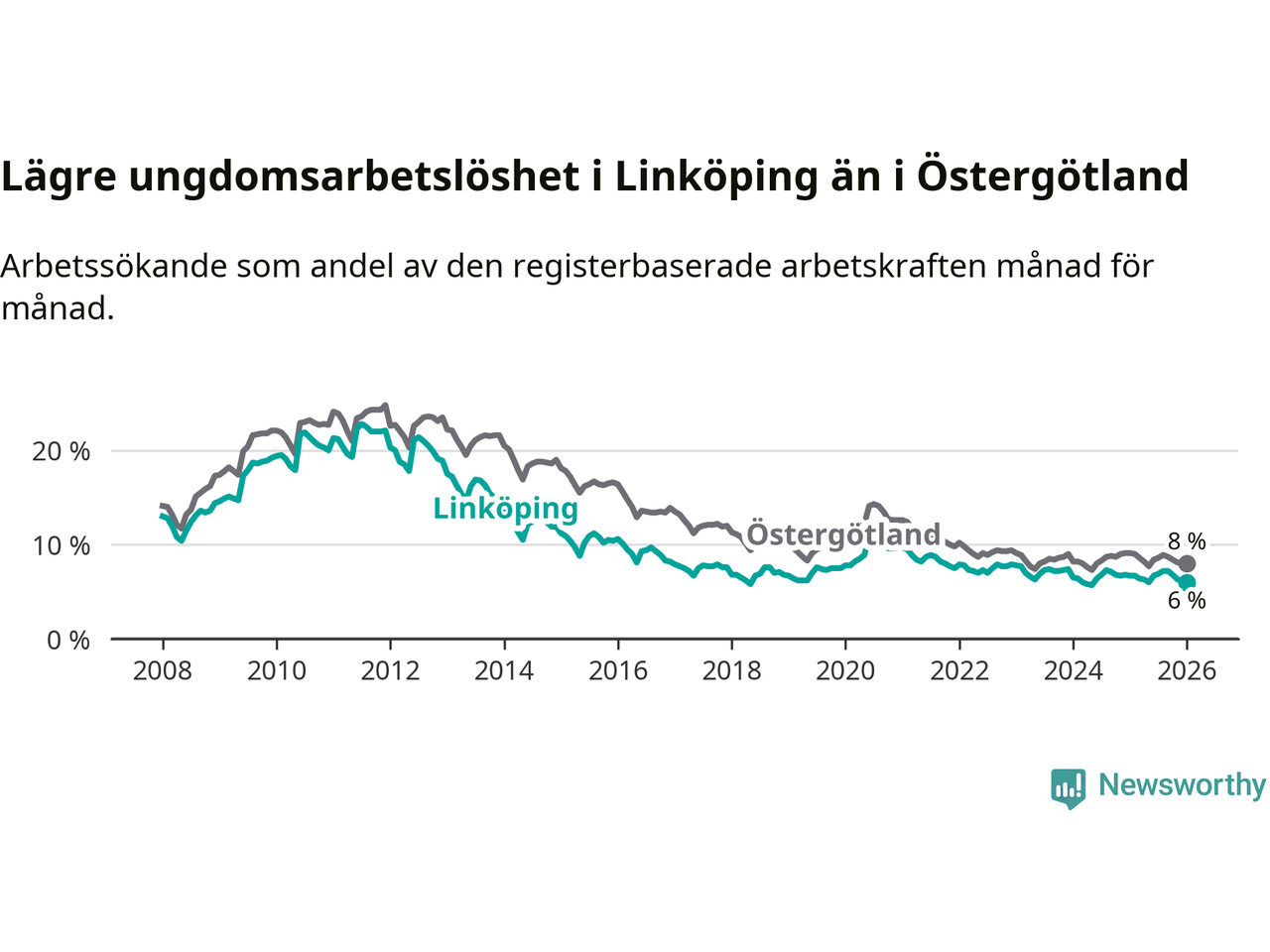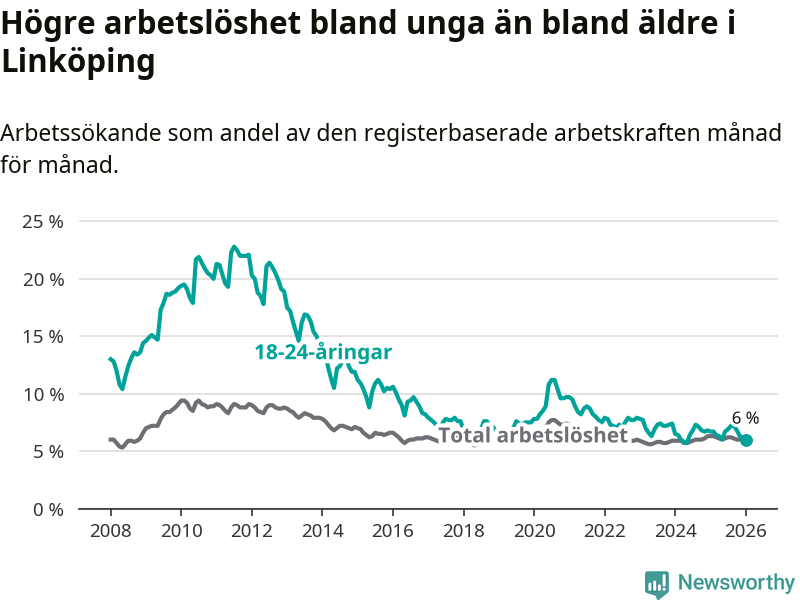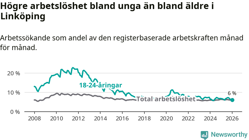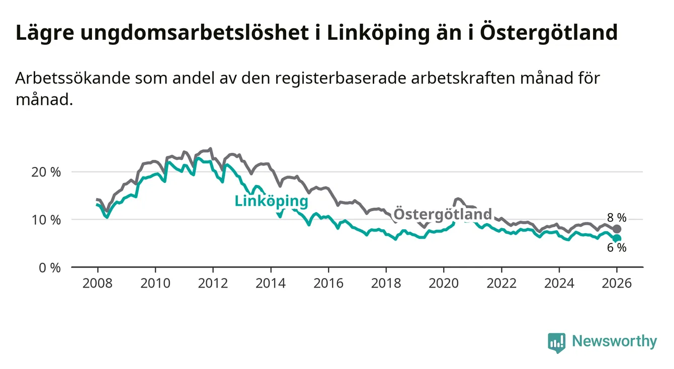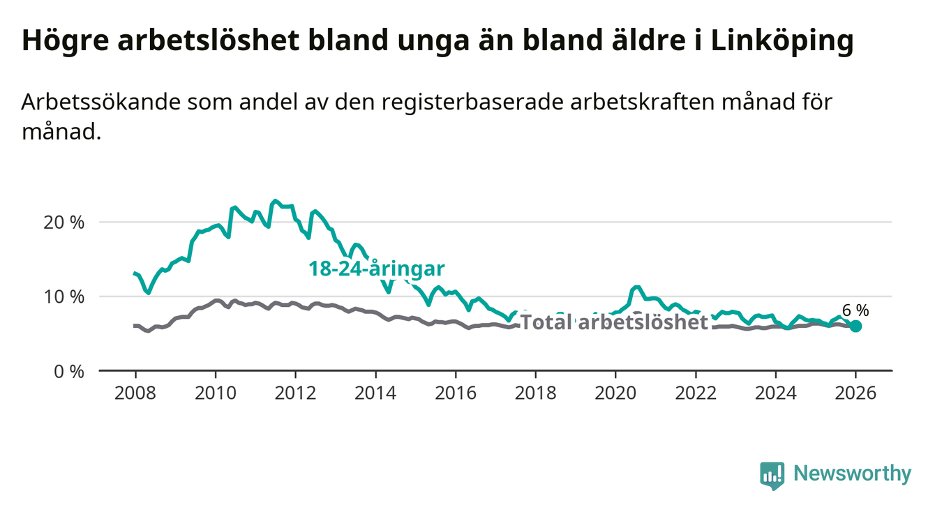 Arbetslösheten bland utlandsfödda var 15,3 procent i Linköping under januari månad, motsvarande 2 943 av 19 235 personer. Det är 1,8 procentenheter färre än vid samma tidpunkt i fjol (−271 om man räknar personer). Därmed är de utlandsföddas arbetslöshet lägre än vid samma tidpunkt i fjol för sjätte månaden i följd. Sedan juli 2025 har arbetslösheten bland utlandsfödda minskat från 16,4 till 15,3 procent. Den nuvarande arbetslöshetsnivån är den lägsta sedan januari 2008.