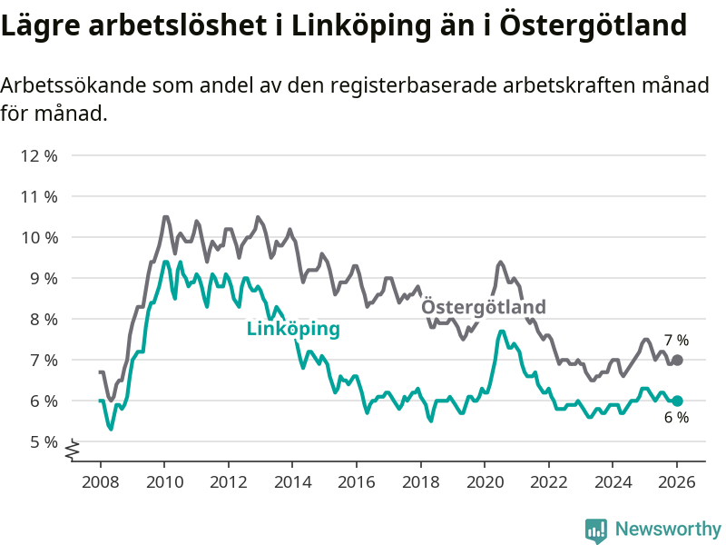 Under januari månad rapporterade Linköpings kommun en total arbetslöshet på 6,0 procent. Det är en minskning jämfört med samma tidpunkt i fjol (−0,3 procentenheter). Även i Östergötlands län sjunker arbetslösheten .