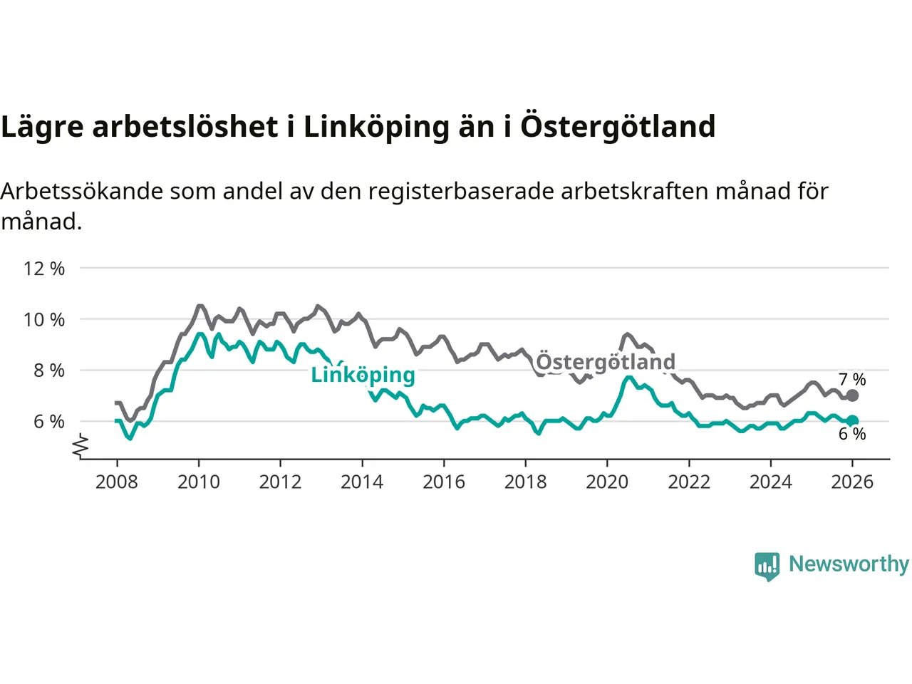 Linköping hade redan tidigare lägre arbetslöshet än snittet i hela Östergötlands län och nu växer klyftan (6,0 procent i kommunen, jämfört med 7,0 procent i hela länet). Ydre har den lägsta arbetslösheten i länet (3,2 procent), medan Norrköping har den högsta (9,2 procent). För att Linköping skulle komma ner i samma arbetslöshetsnivå som Ydre skulle 2 413 personer behöva sysselsättas.