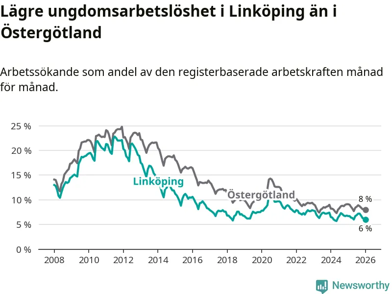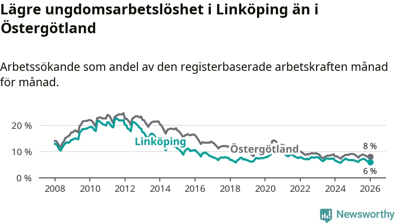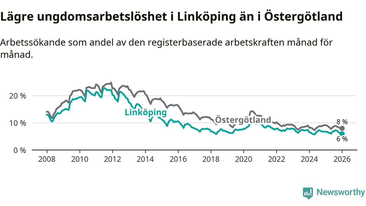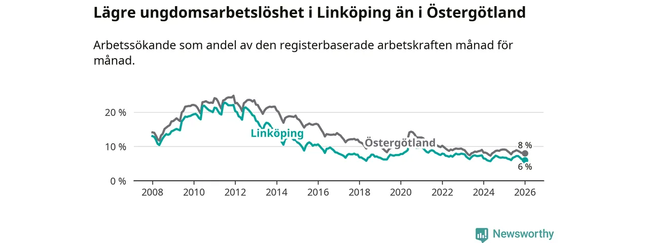 Precis som den totala arbetslösheten ligger ungdomsarbetslösheten i Linköping lägre än i Östergötland som helhet. Skillnaden mellan kommunen och länet är 2,0 procentenheter.
