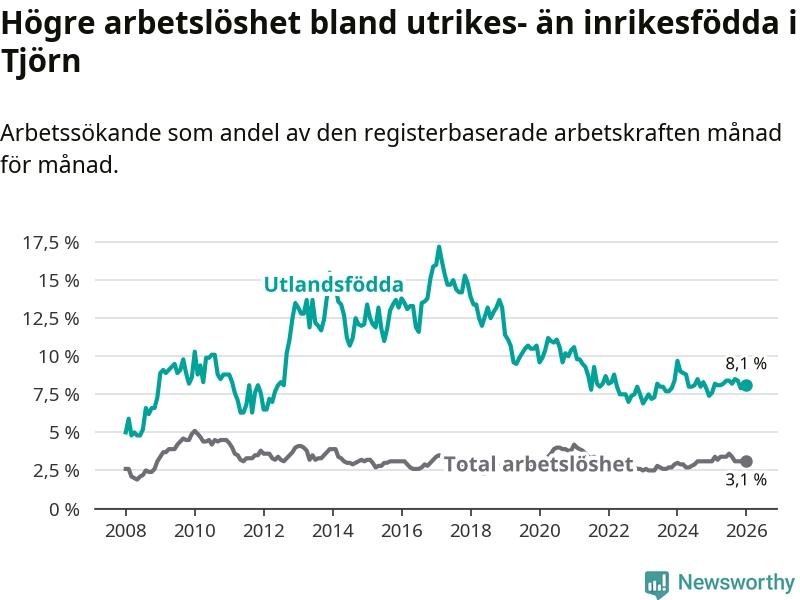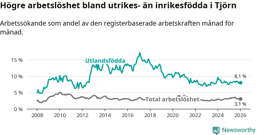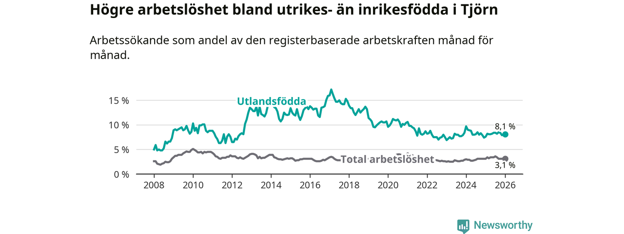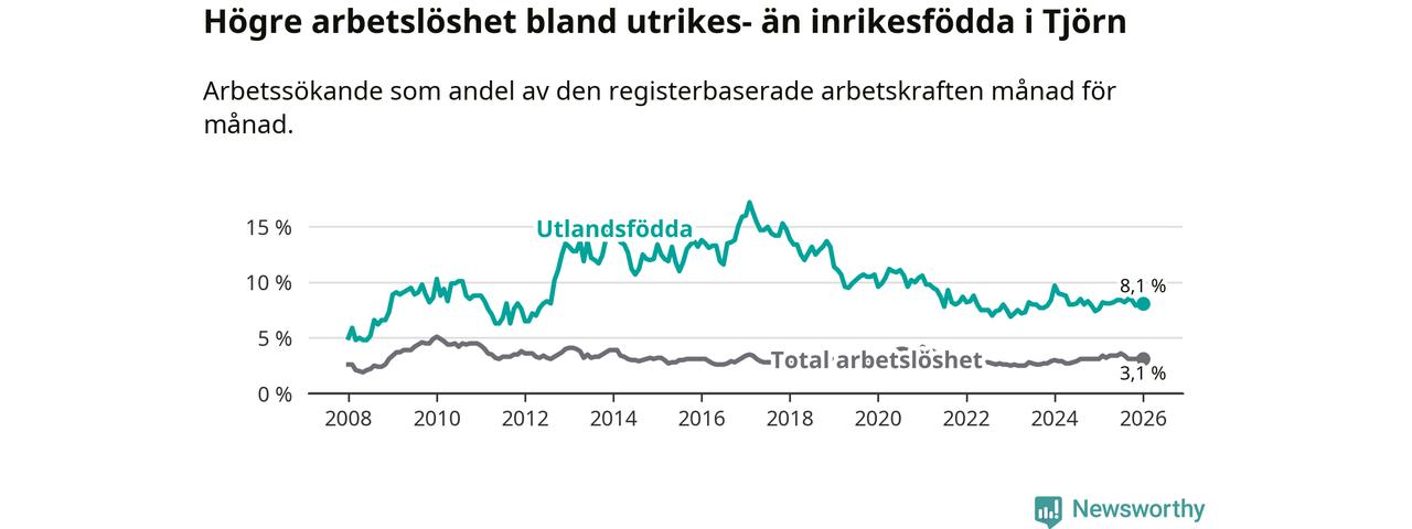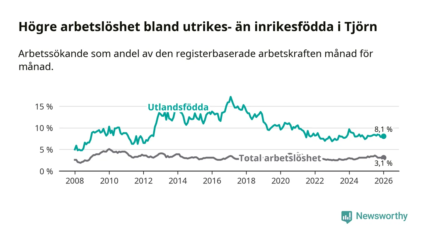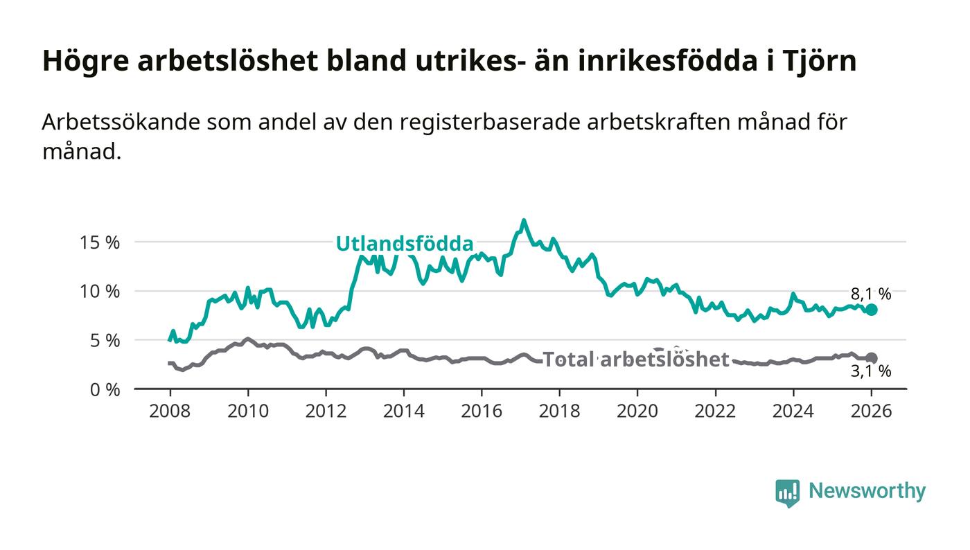 Arbetslösheten bland utlandsfödda var 8,1 procent på Tjörn under januari månad, motsvarande 66 av 815 personer. Det är 0,5 procentenheter fler än vid samma tidpunkt i fjol (+4 om man räknar personer).