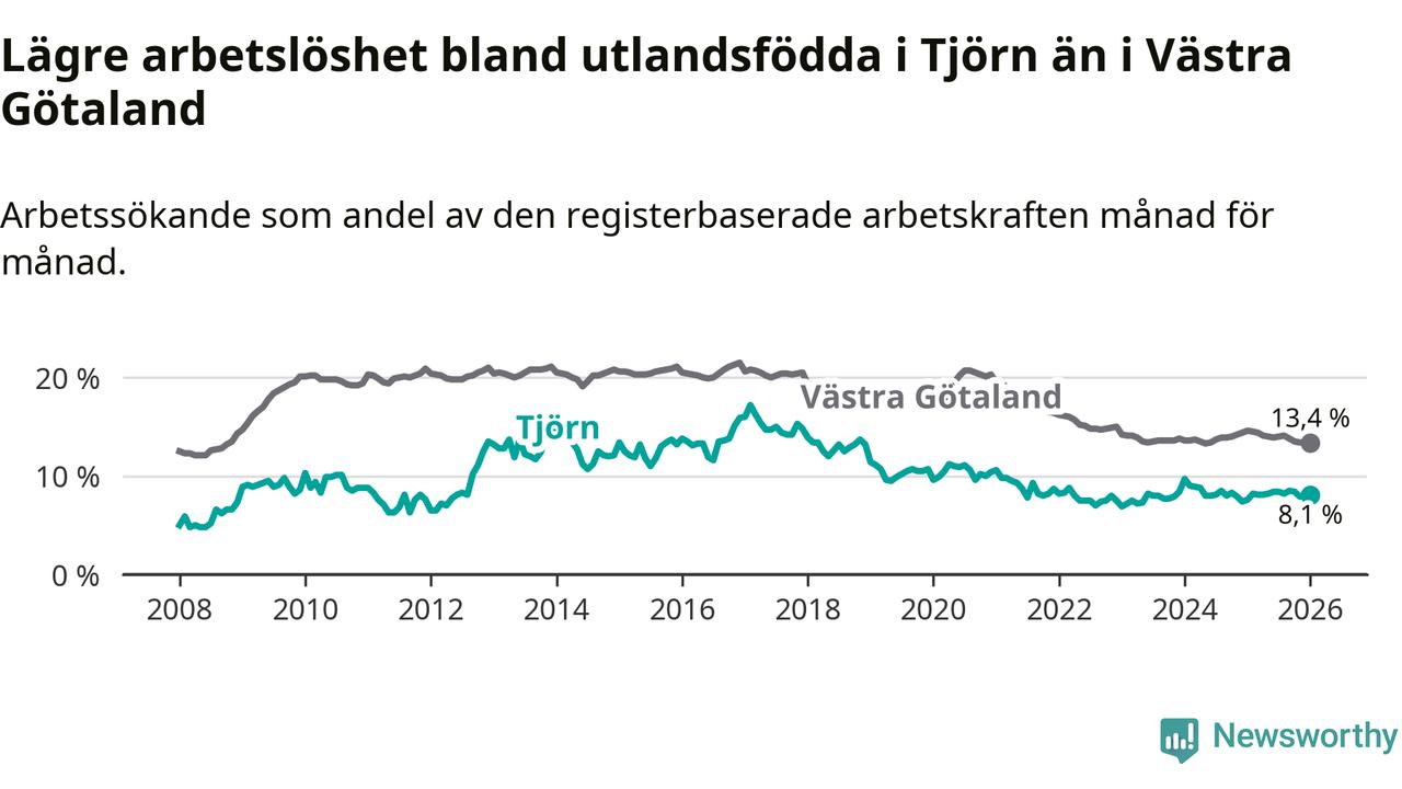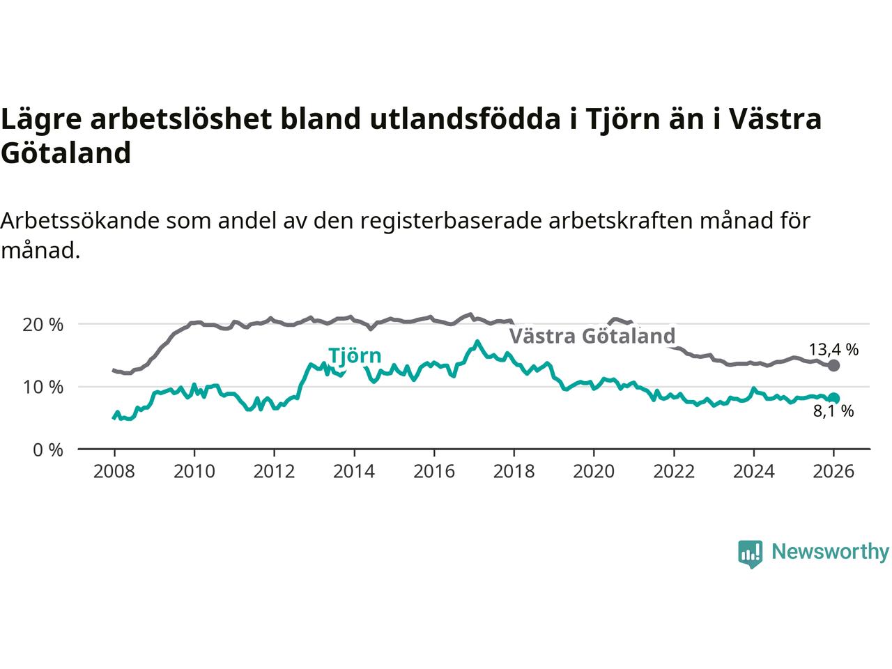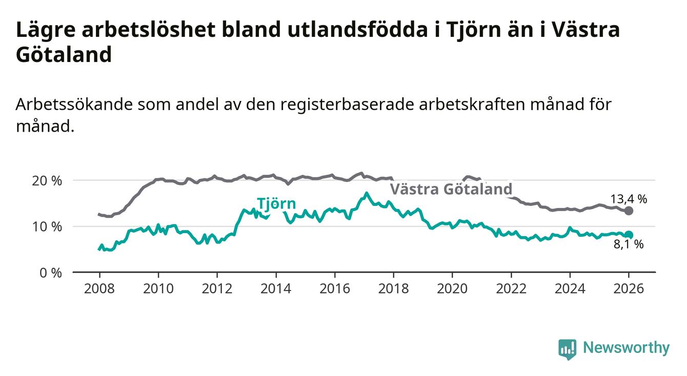 Medan arbetslösheten bland utlandsfödda alltså ökar på Tjörn så minskar den i Västra Götaland. Jämfört med januari förra året har andelen arbetslösa utlandsfödda i länet minskat med 1,2 procentenheter (till 13,4 procent). Trots den senaste uppgången har Tjörn med andra ord fortfarande lägre arbetslöshet bland utlandsfödda än Västra Götaland.