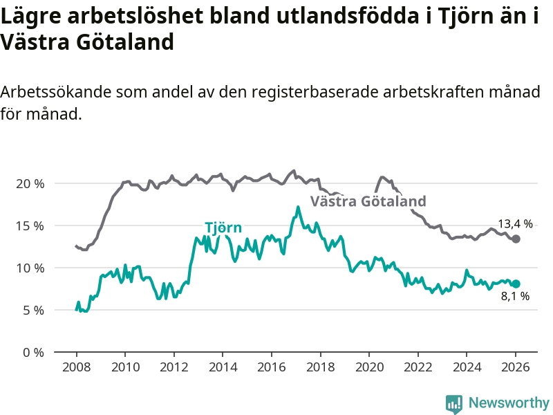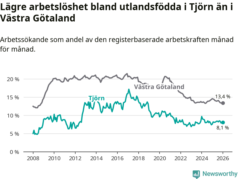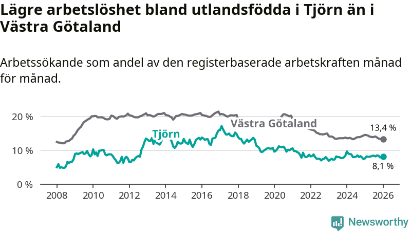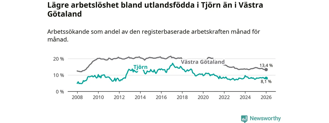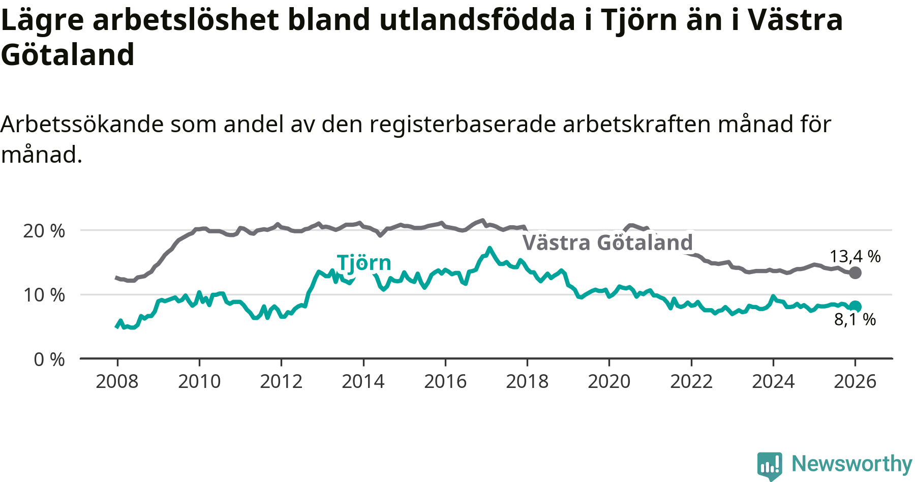 Medan arbetslösheten bland utlandsfödda alltså ökar på Tjörn så minskar den i Västra Götaland. Jämfört med januari förra året har andelen arbetslösa utlandsfödda i länet minskat med 1,2 procentenheter (till 13,4 procent). Trots den senaste uppgången har Tjörn med andra ord fortfarande lägre arbetslöshet bland utlandsfödda än Västra Götaland.
