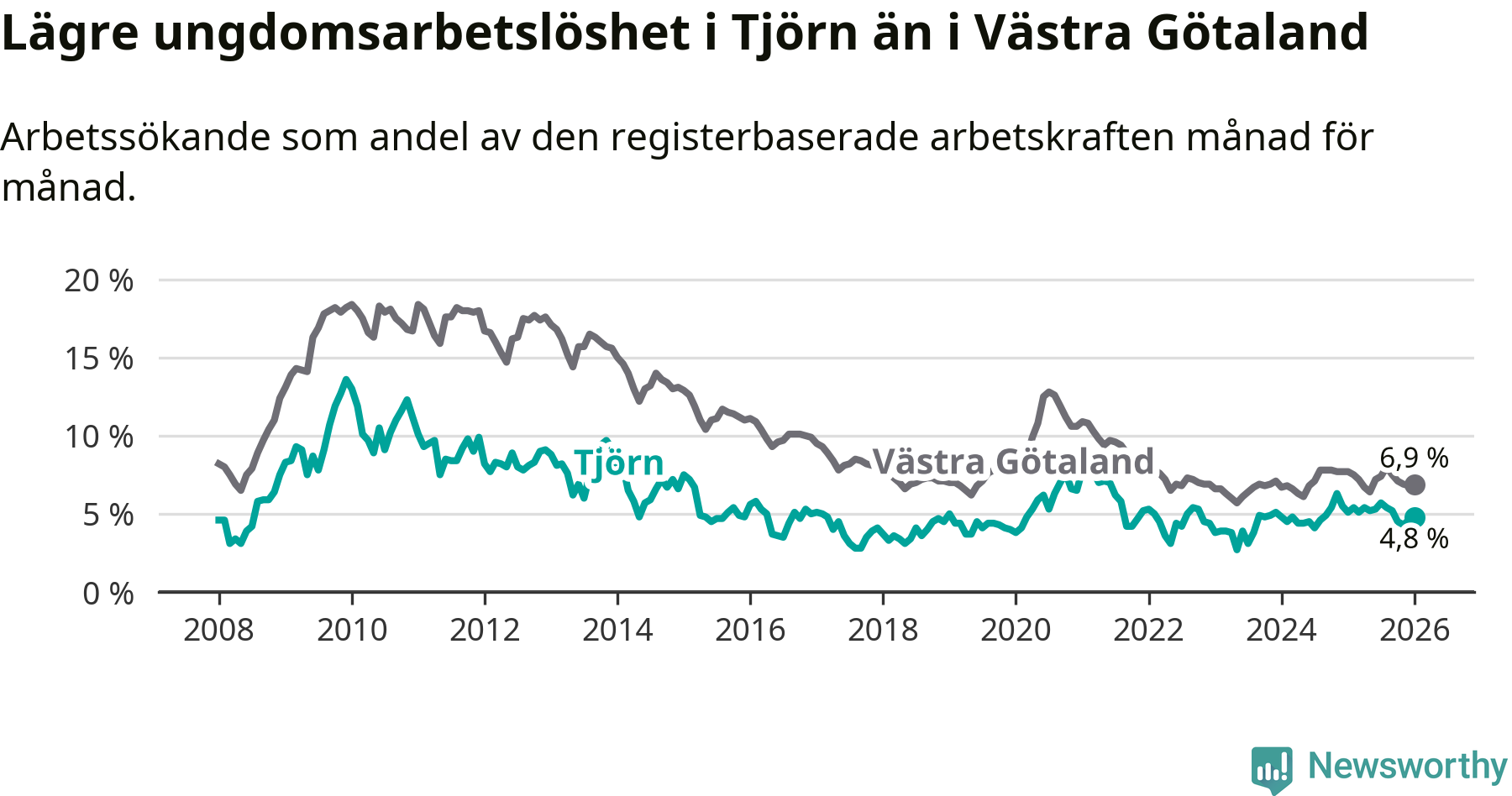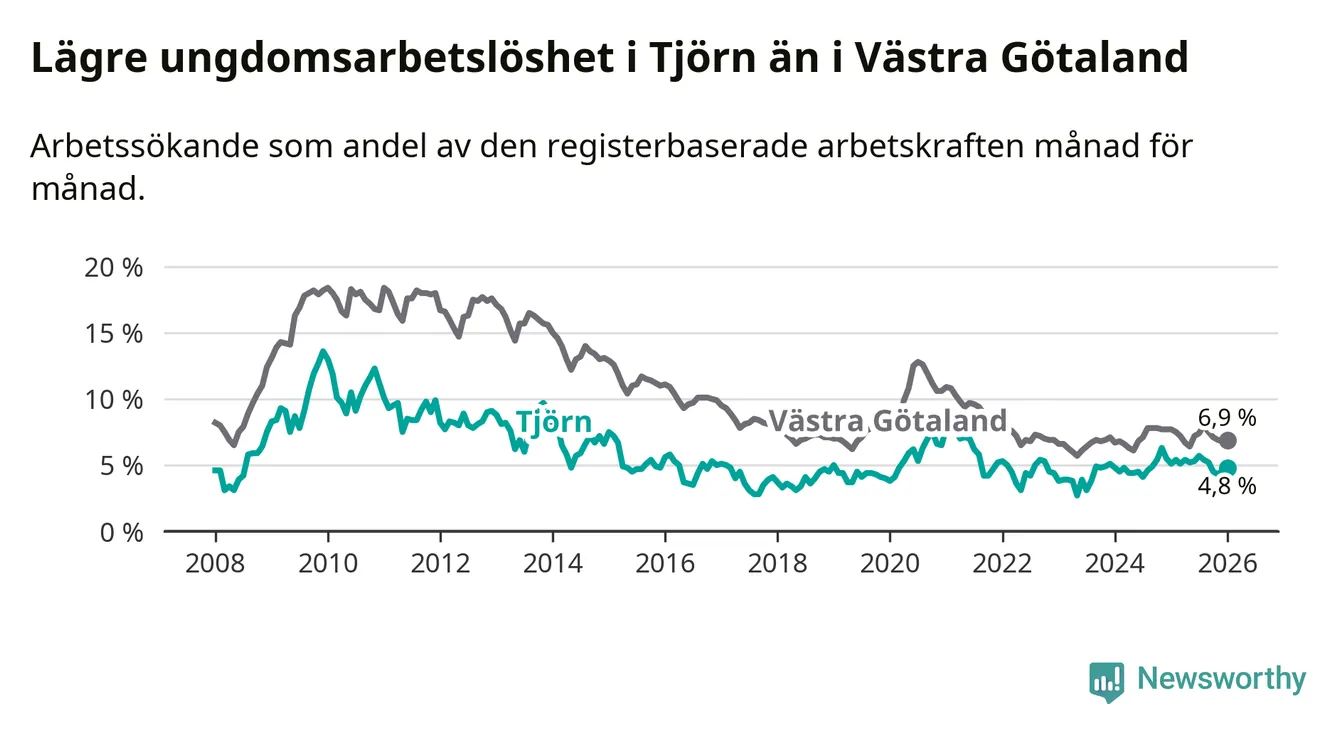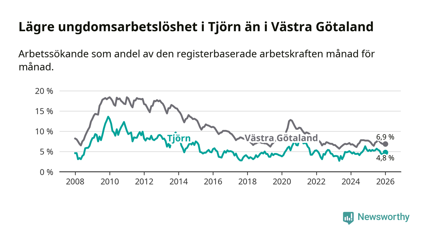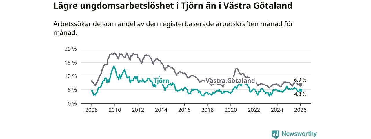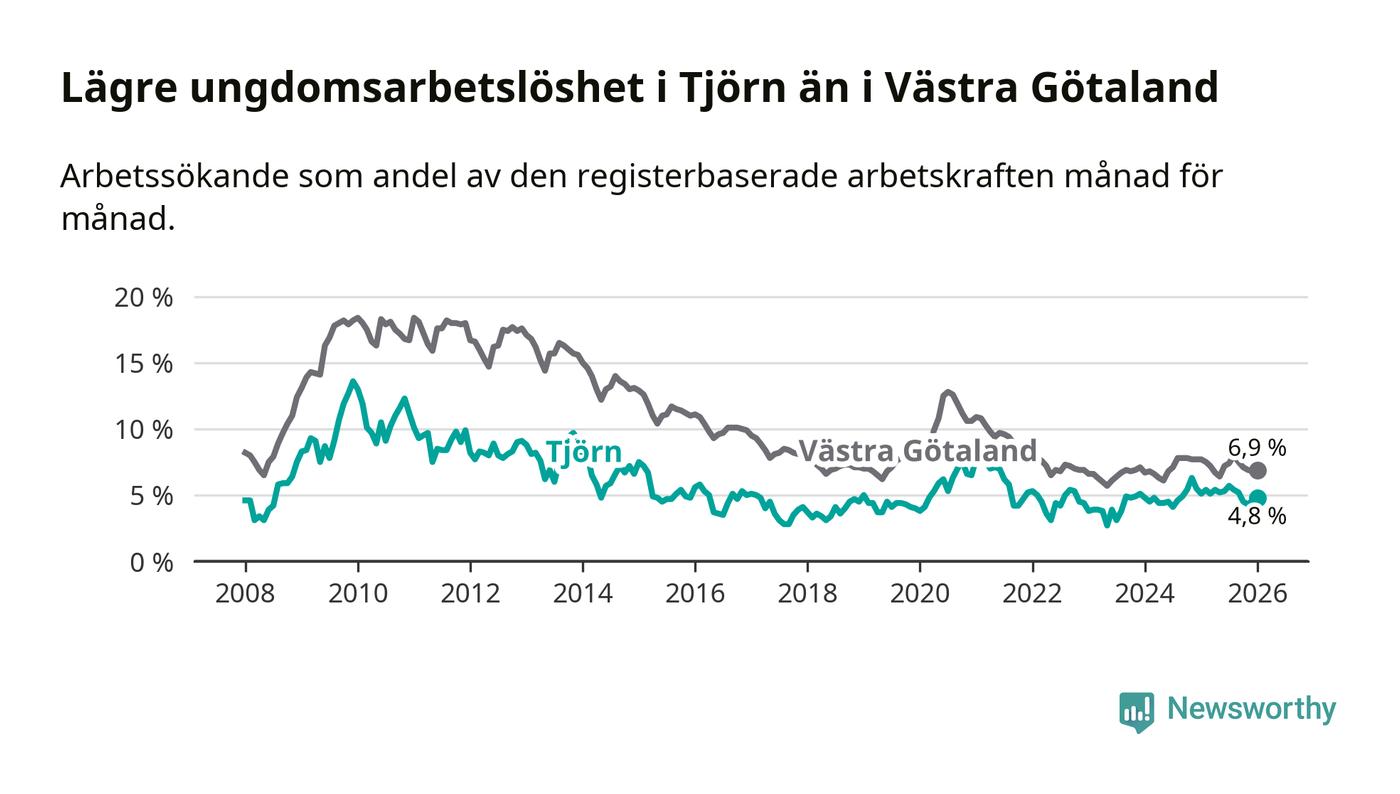 Graf: Arbetslöshet bland unga i Tjörns kommun och Västra Götalands län