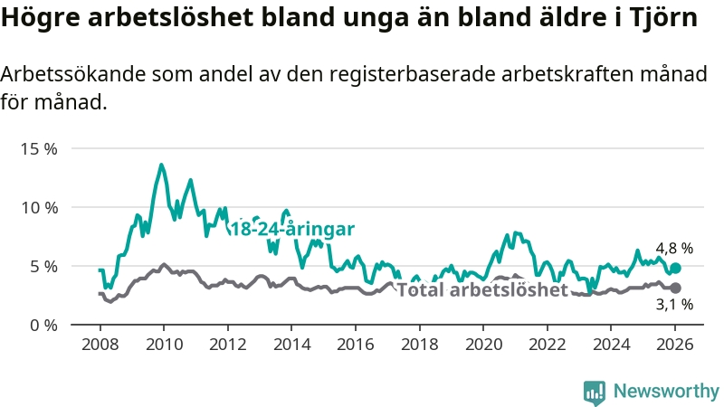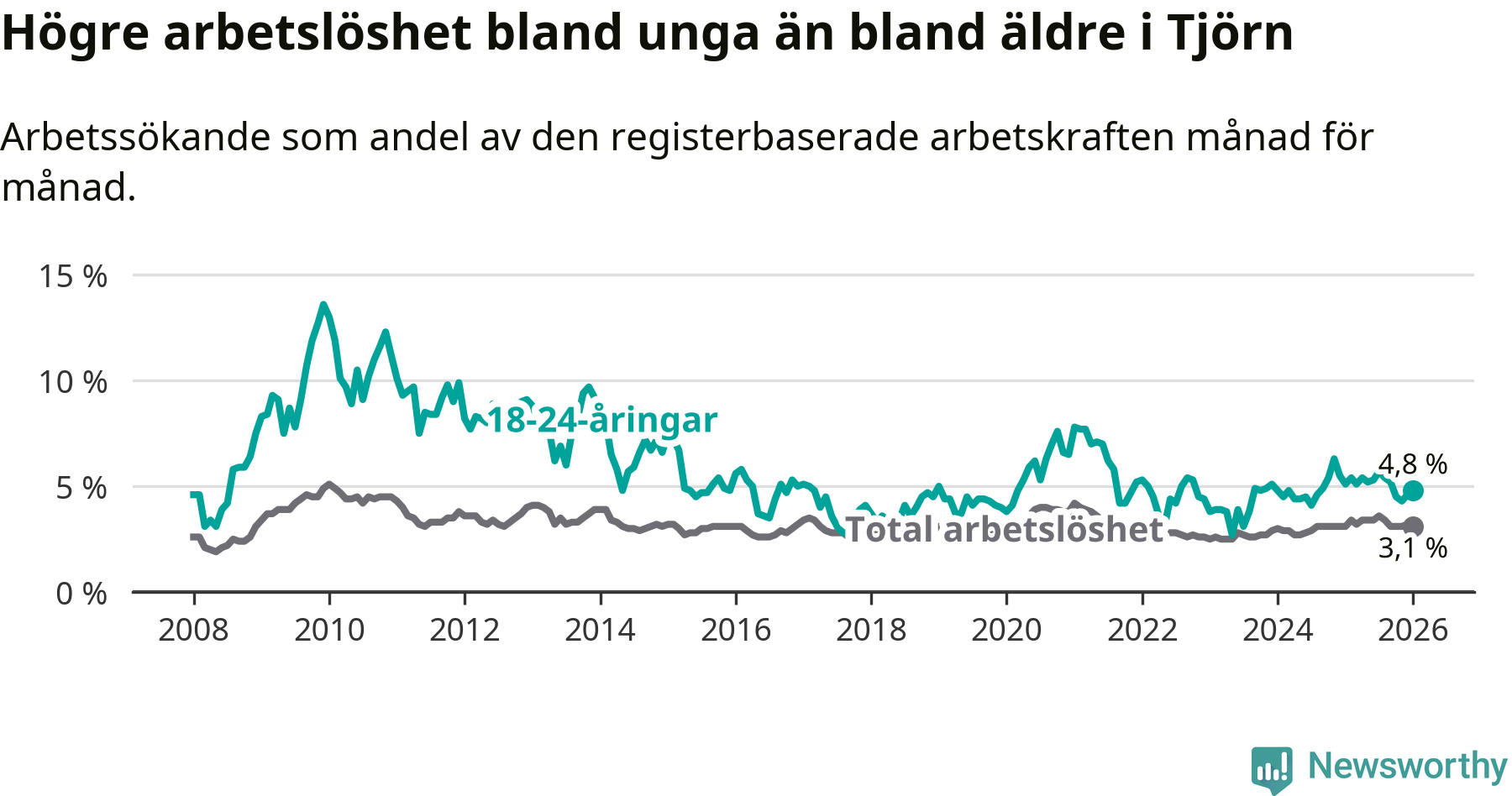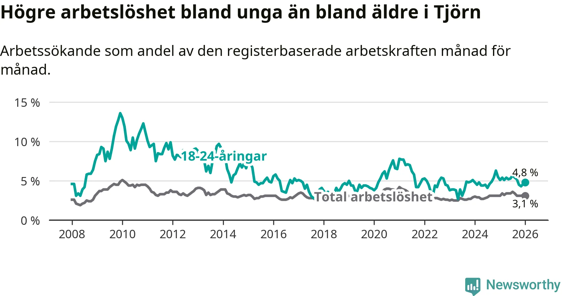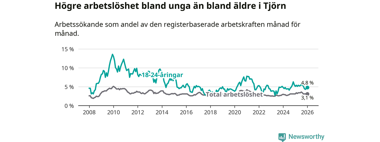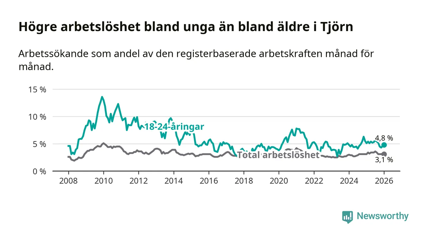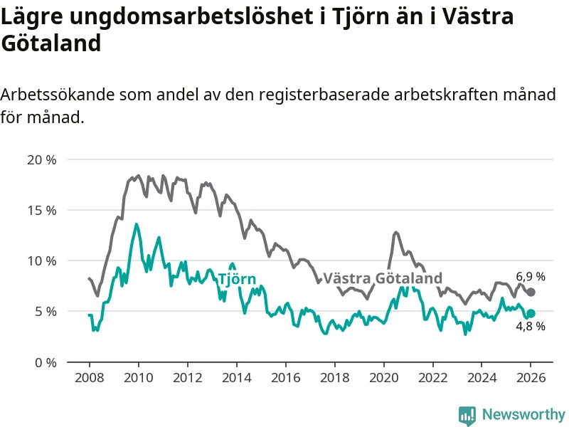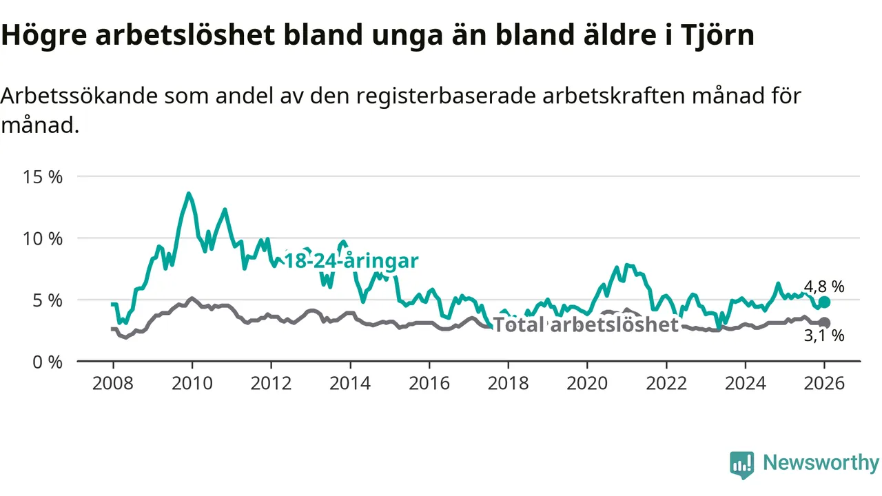Graf: Arbetslöshet bland unga i Tjörns kommun och Västra Götalands län