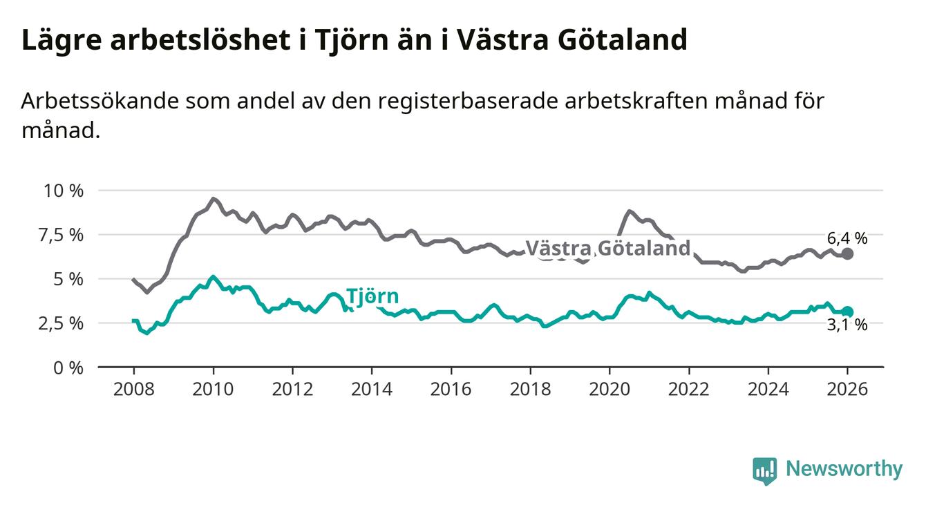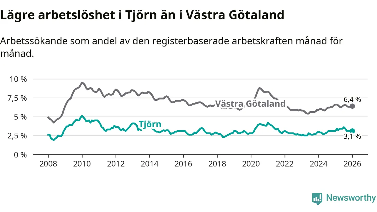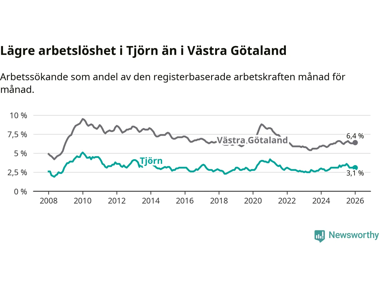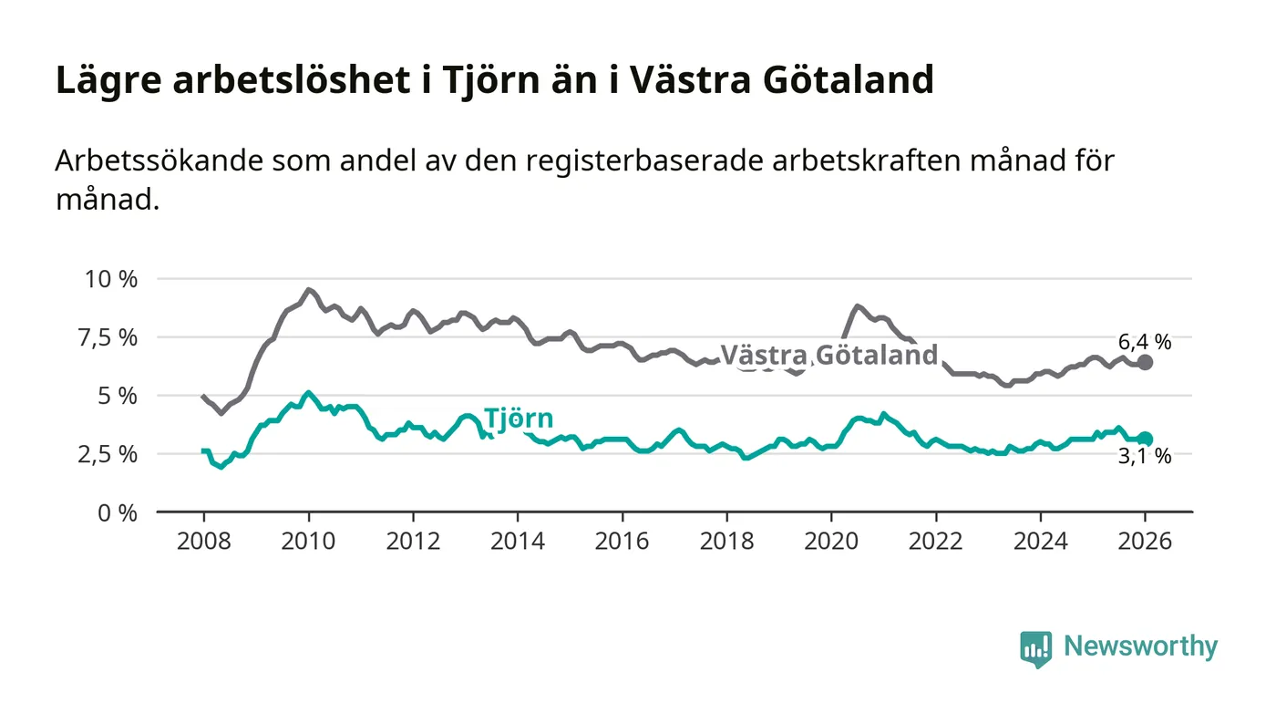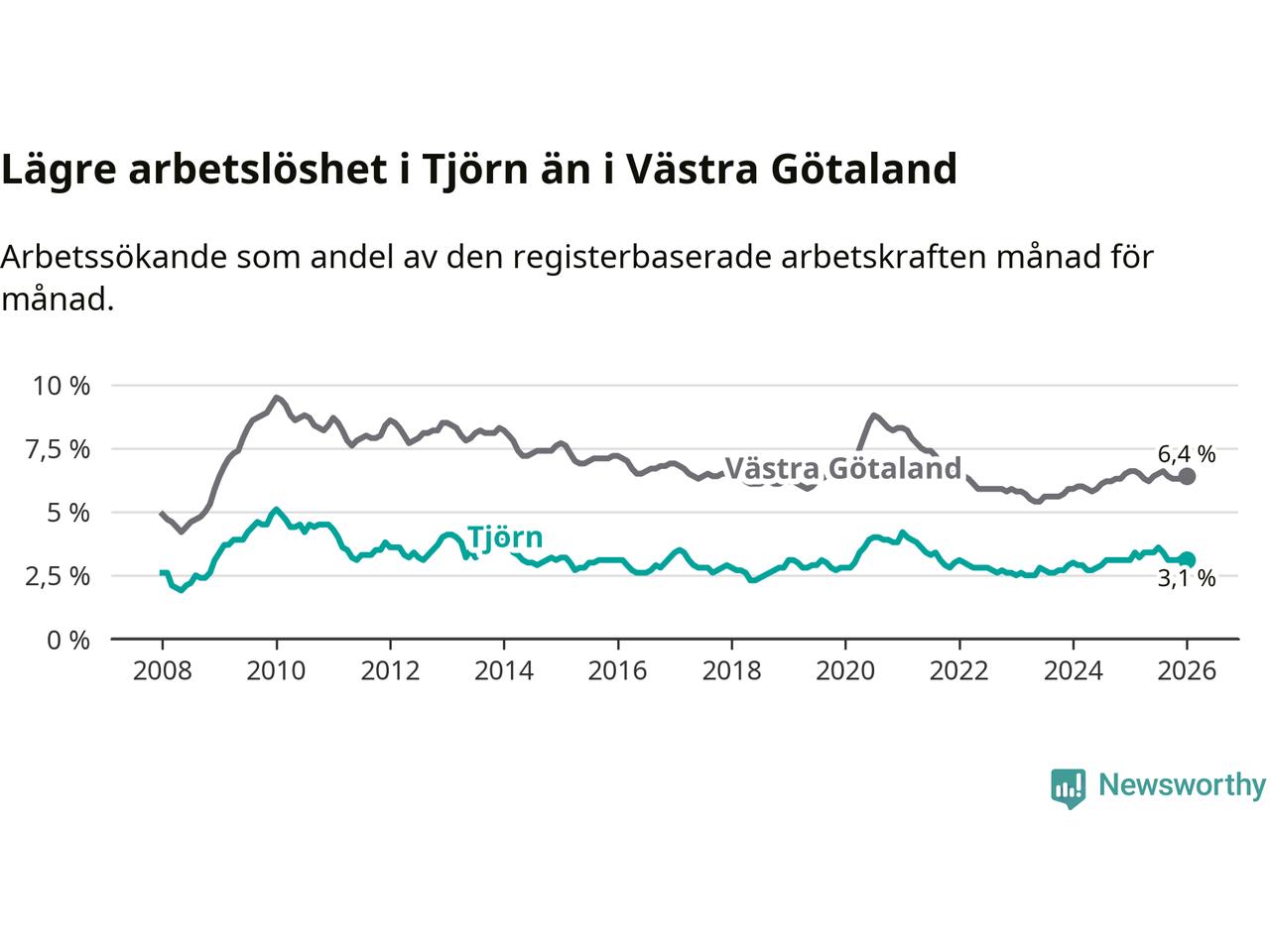 Under januari månad rapporterade Tjörns kommun en total arbetslöshet på 3,1 procent. Det är i samma nivå som i januari i fjol. I Västra Götalands län däremot sjunker arbetslösheten