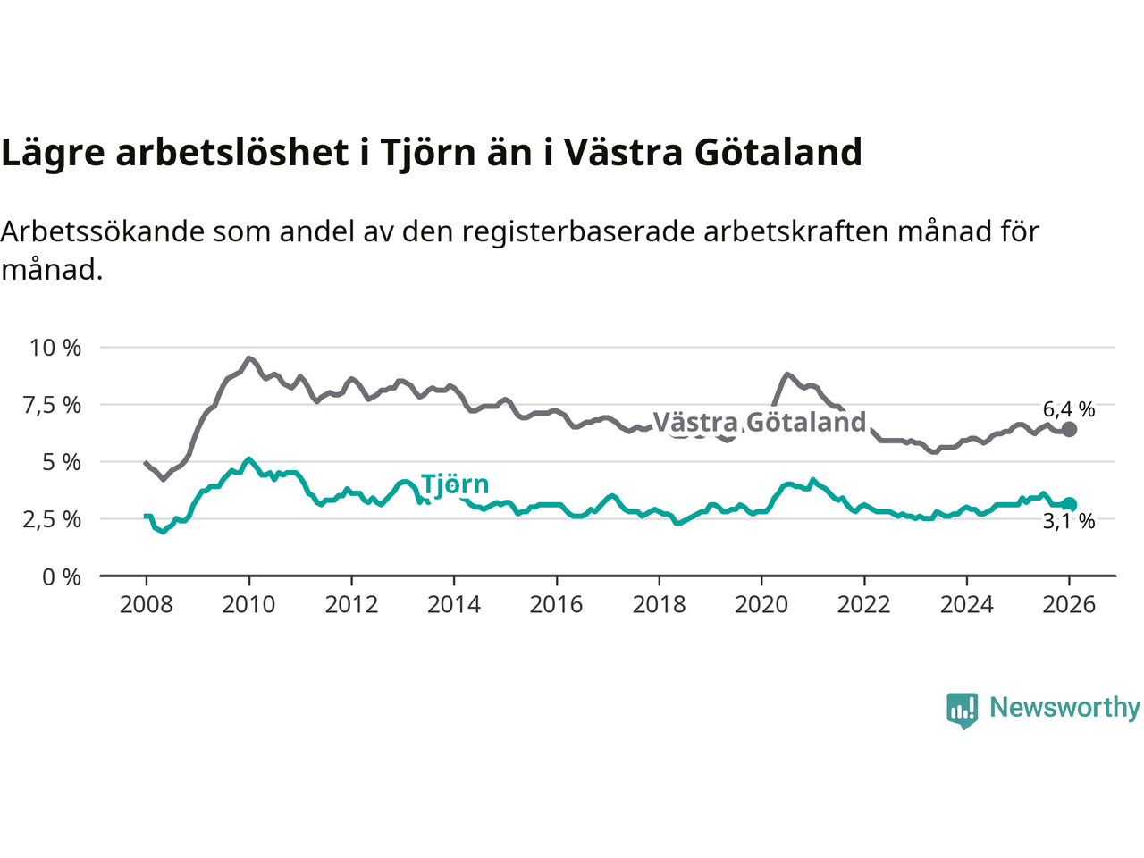 Tjörn går därmed mot strömmen i förhållande till andra kommuner i Västra Götalands län. I de flesta andra kommuner i länet går arbetslösheten nedåt. Störst är minskningen i Mellerud, där arbetslösheten sjunker med 1,7 procentenheter. I tabellen längre ner ser du utvecklingen i samtliga kommuner i länet.