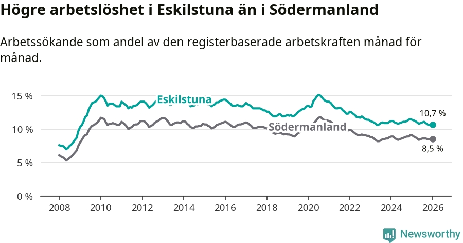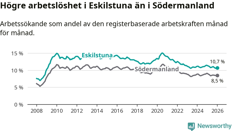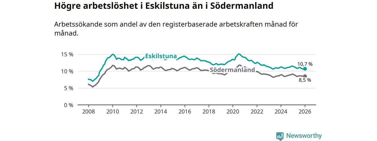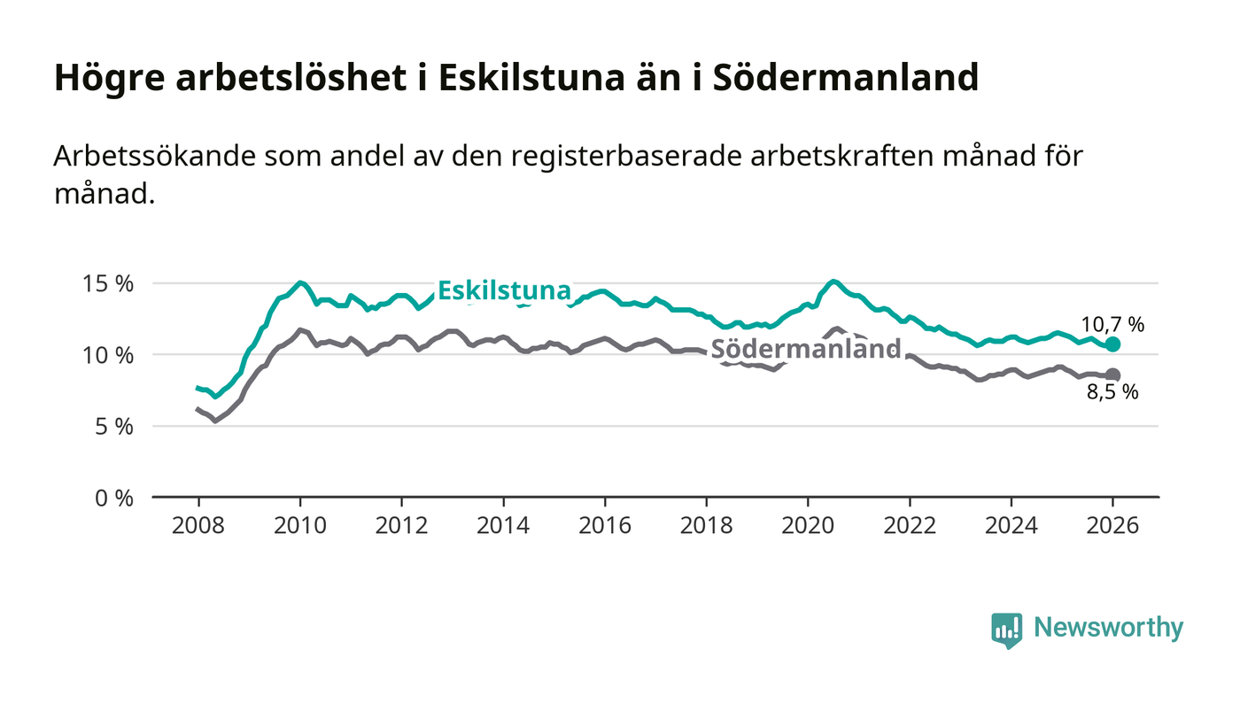 Under januari månad rapporterade Eskilstuna kommun en total arbetslöshet på 10,7 procent. Det är en minskning jämfört med samma tidpunkt i fjol (−0,7 procentenheter). Även i Södermanlands län sjunker arbetslösheten .