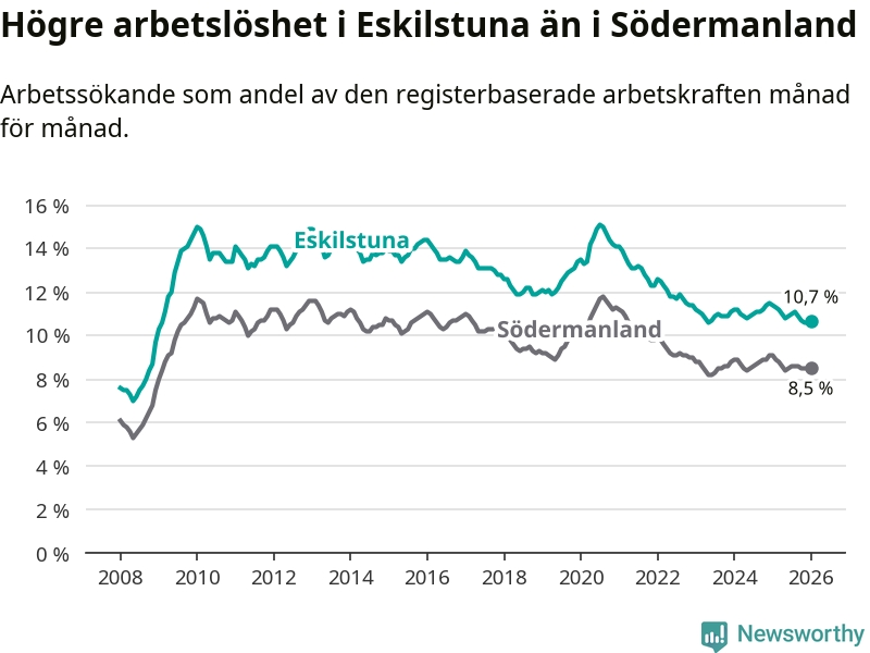 Perstorp är den kommun som har högst arbetslöshet just nu (13,4 procent) i landet som helhet, medan Gällivare, Kiruna och Sorsele har den lägsta (2,4 procent). Eskilstunas arbetslöshet sticker ut som den sjätte högsta i hela landet.