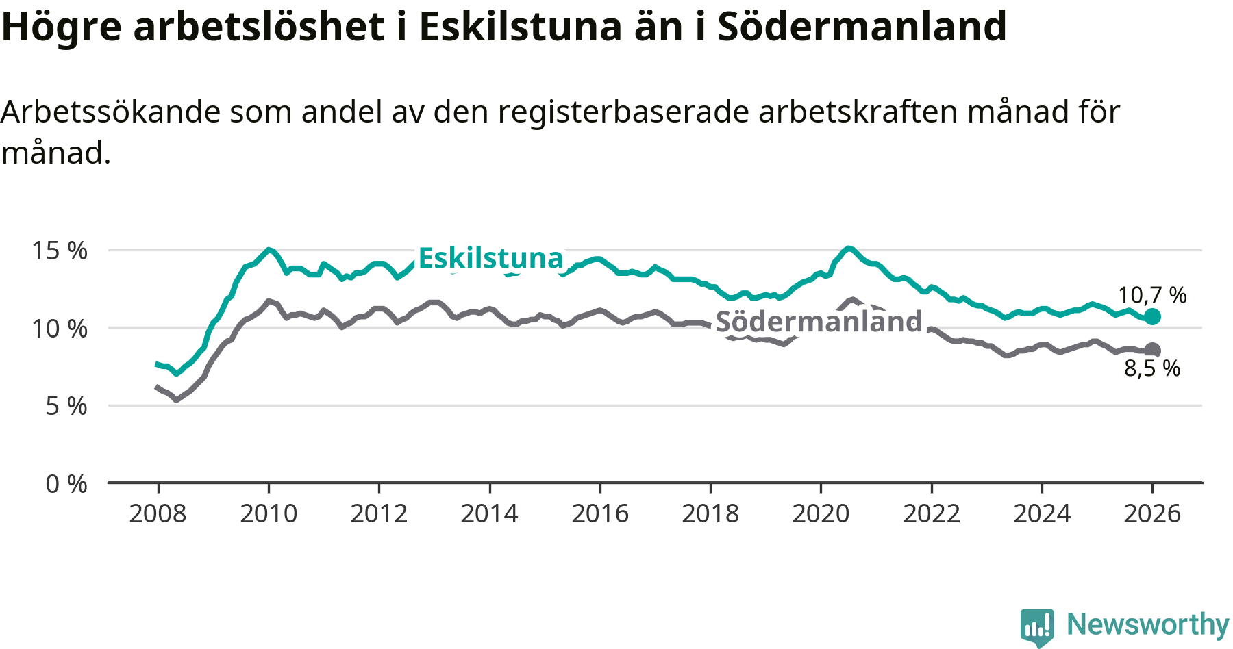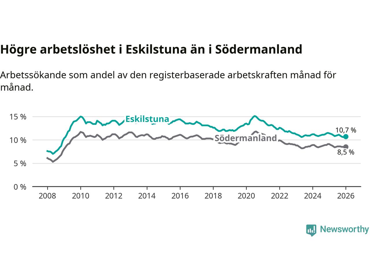 Graf: Arbetslöshet i Eskilstuna kommun och Södermanlands län