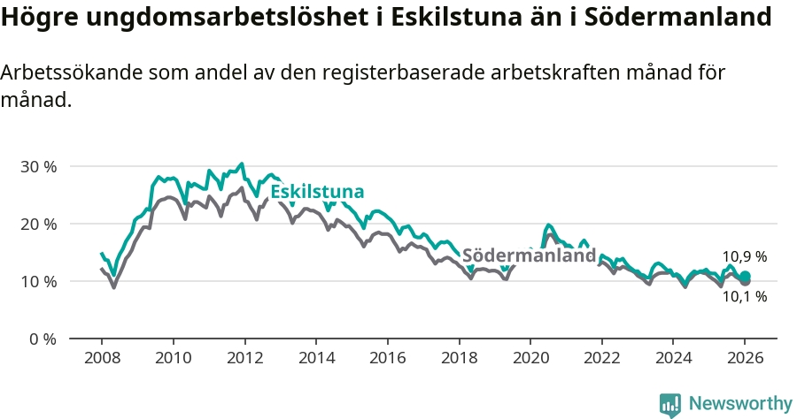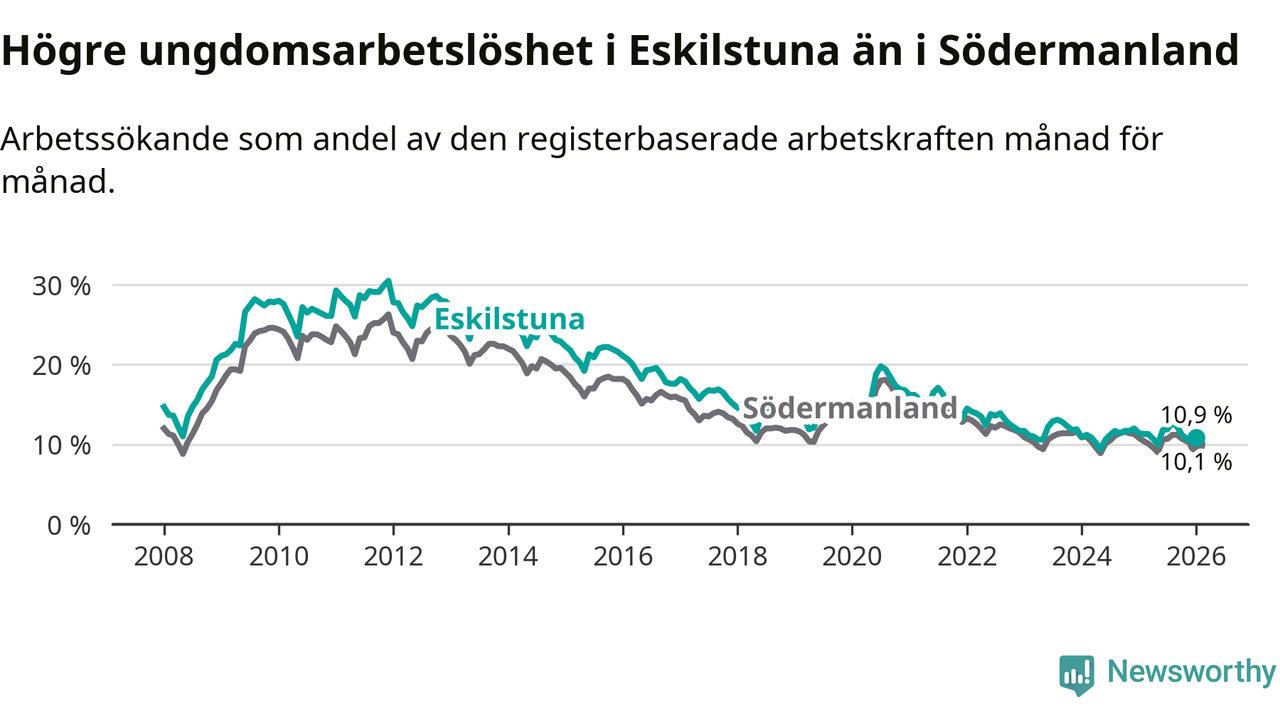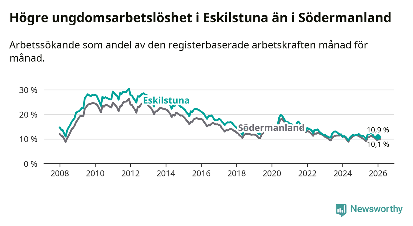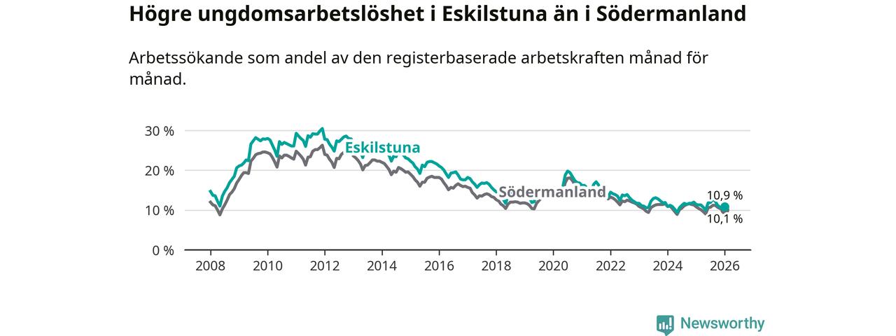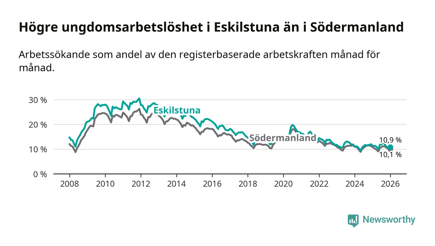 Precis som den totala arbetslösheten ligger ungdomsarbetslösheten i Eskilstuna högre än i Södermanland som helhet. Skillnaden mellan kommunen och länet är 0,8 procentenheter.