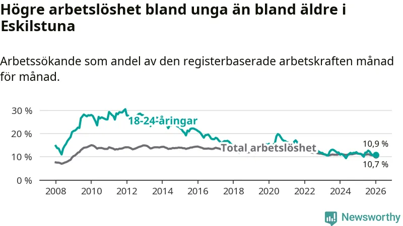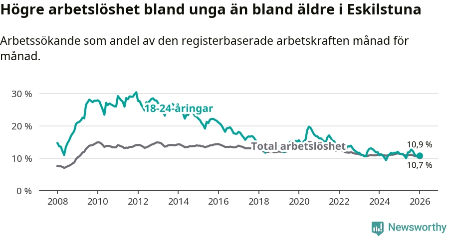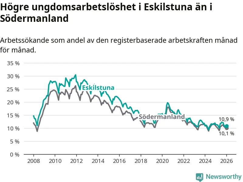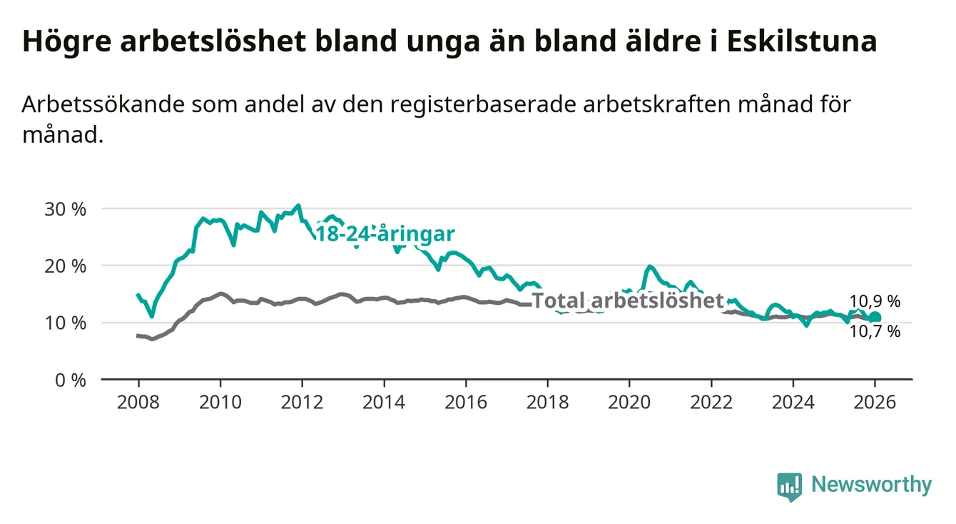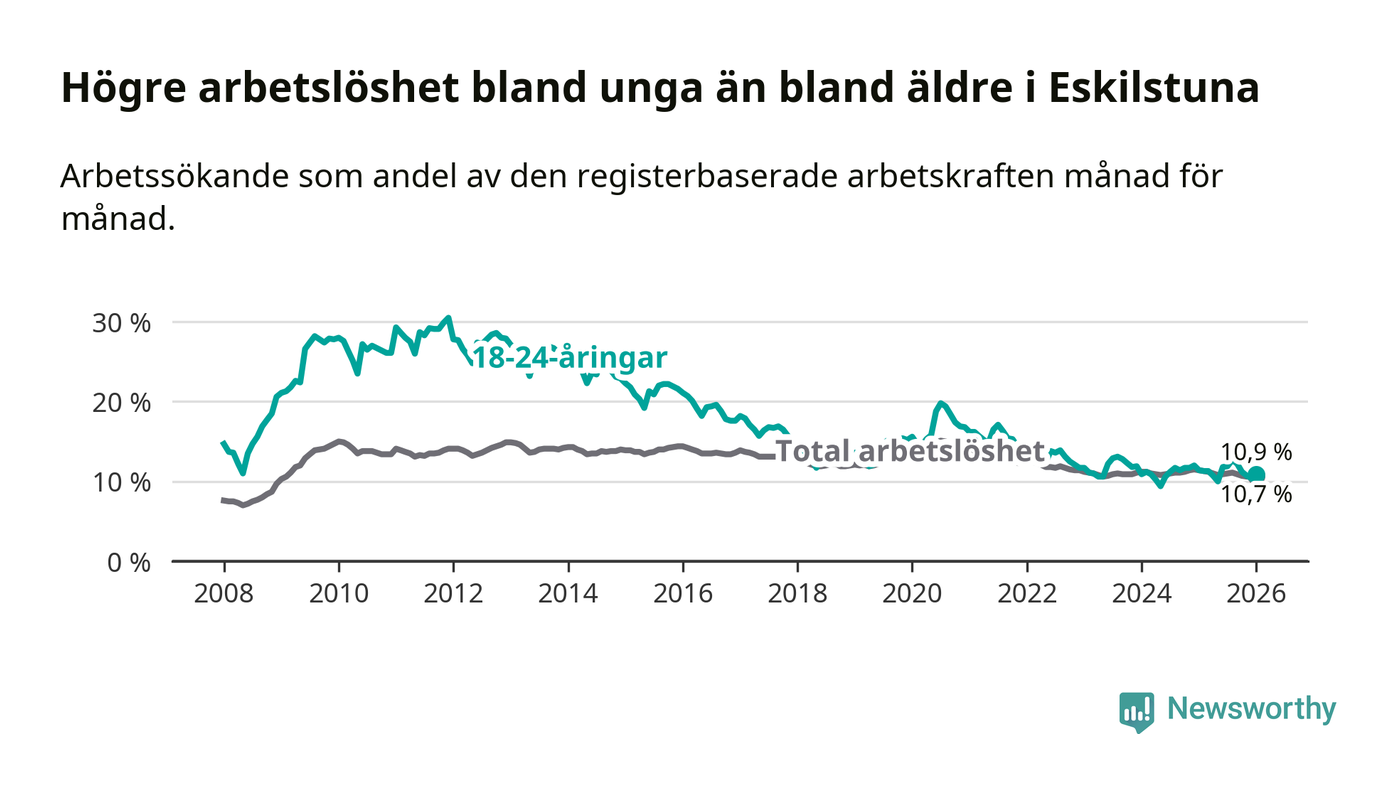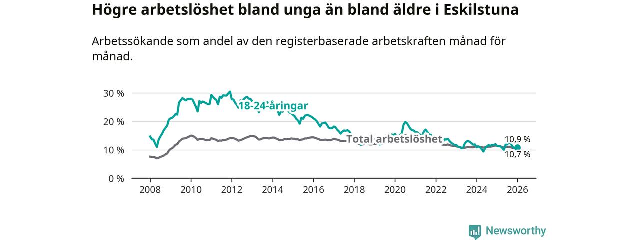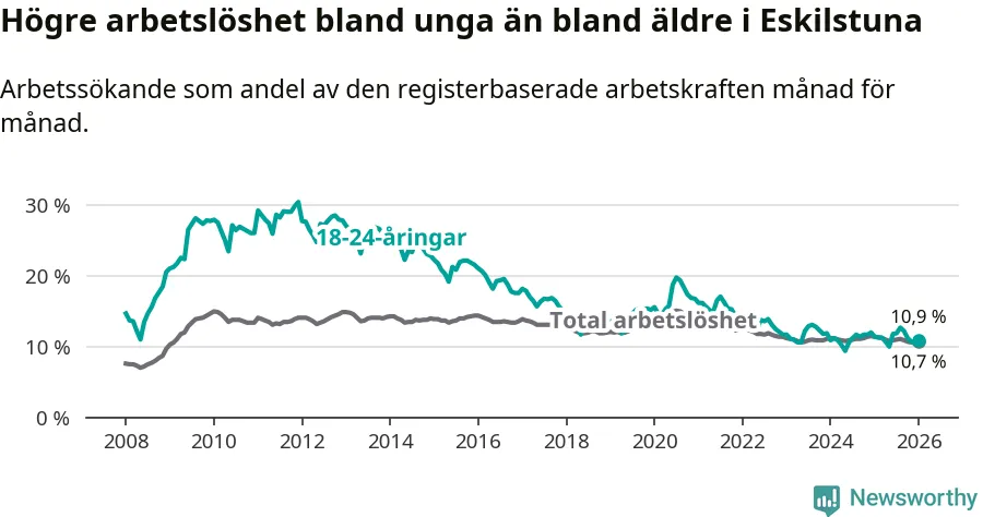 Precis som den totala arbetslösheten ligger ungdomsarbetslösheten i Eskilstuna högre än i Södermanland som helhet. Skillnaden mellan kommunen och länet är 0,8 procentenheter.