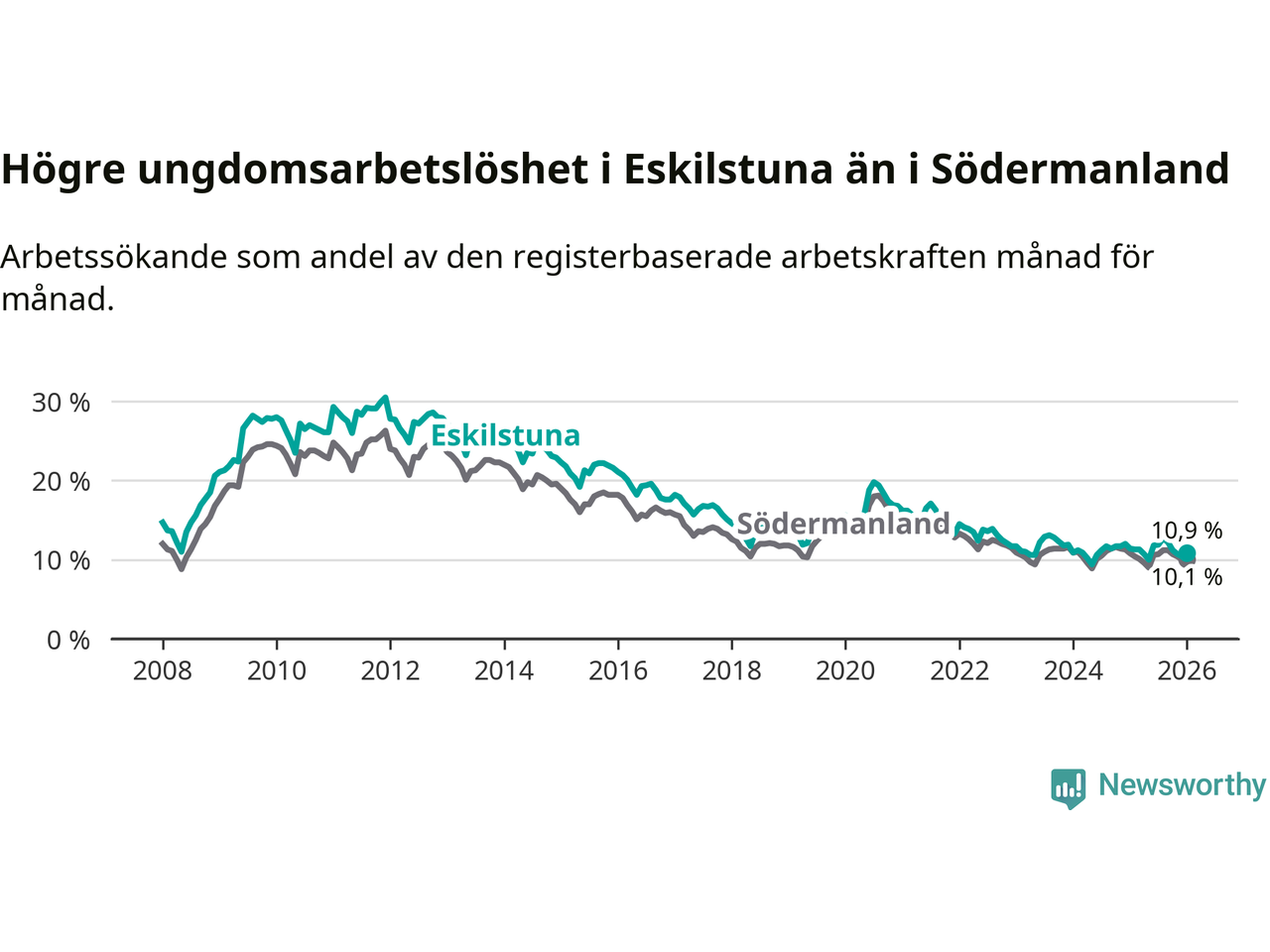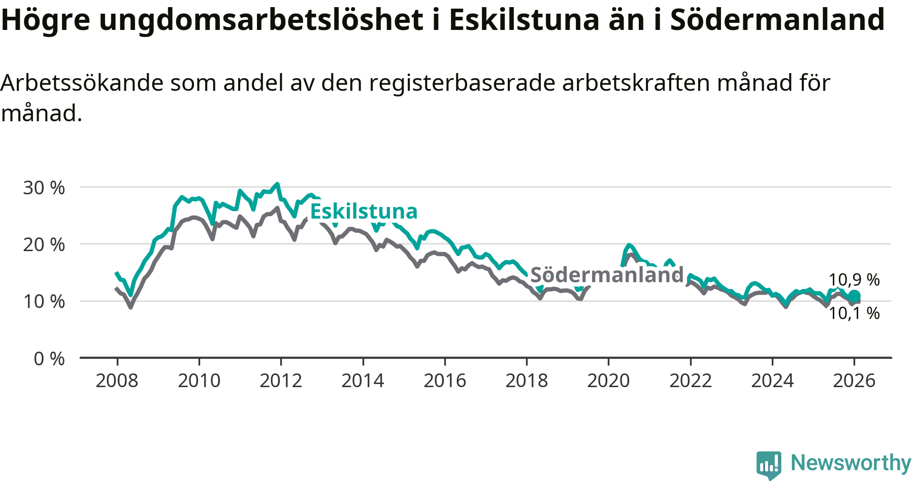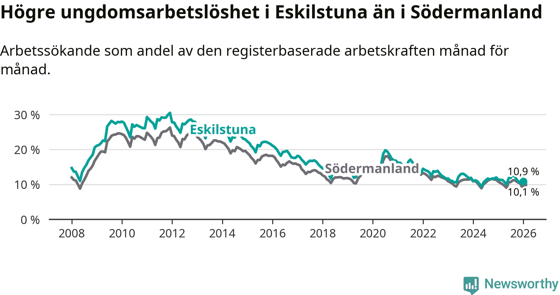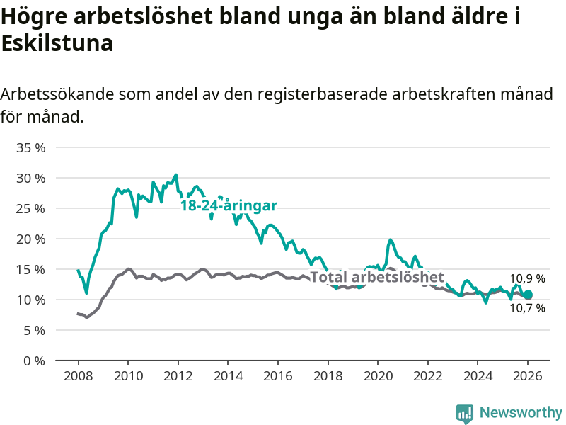 Precis som den totala arbetslösheten ligger ungdomsarbetslösheten i Eskilstuna högre än i Södermanland som helhet. Skillnaden mellan kommunen och länet är 0,8 procentenheter.
