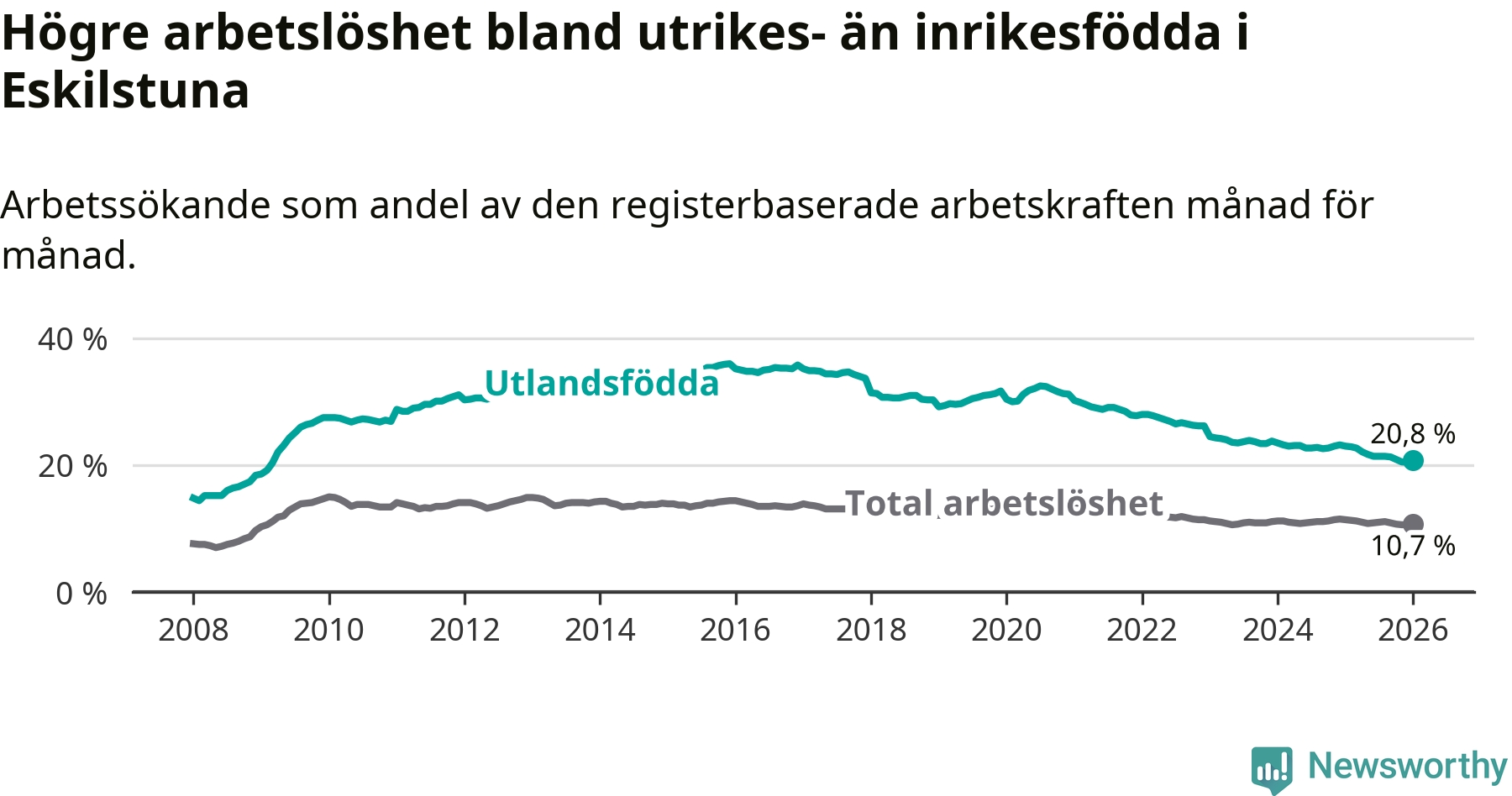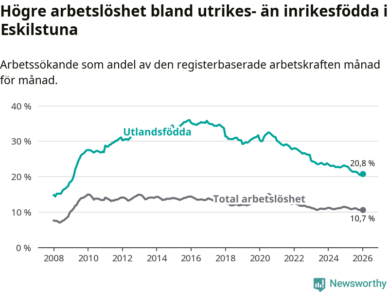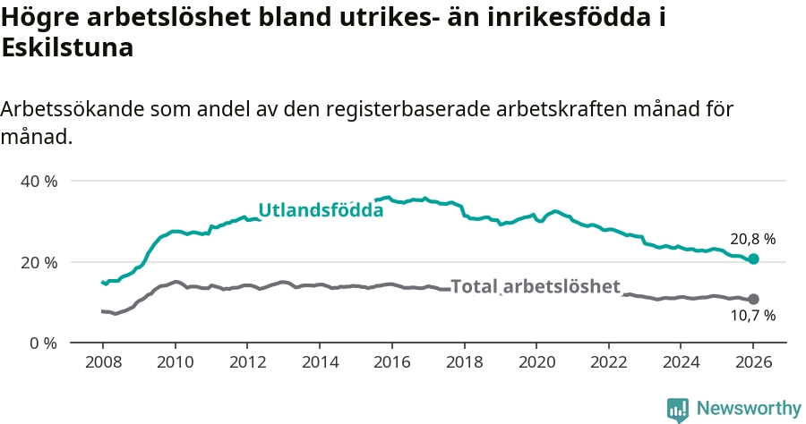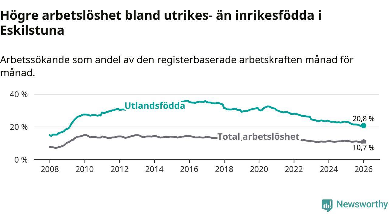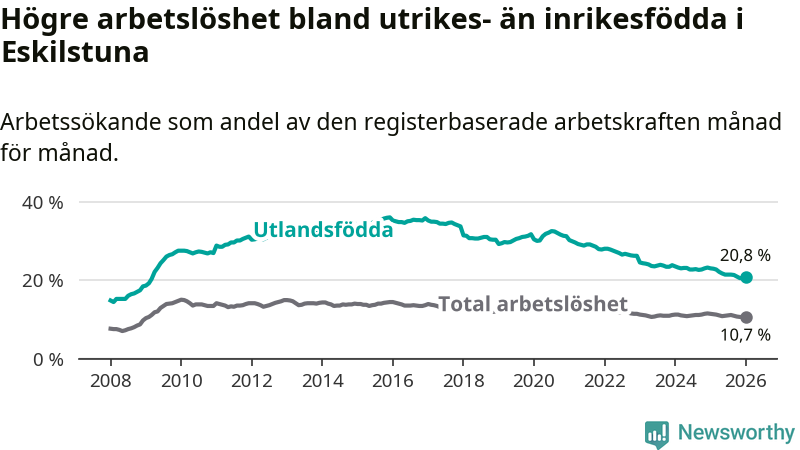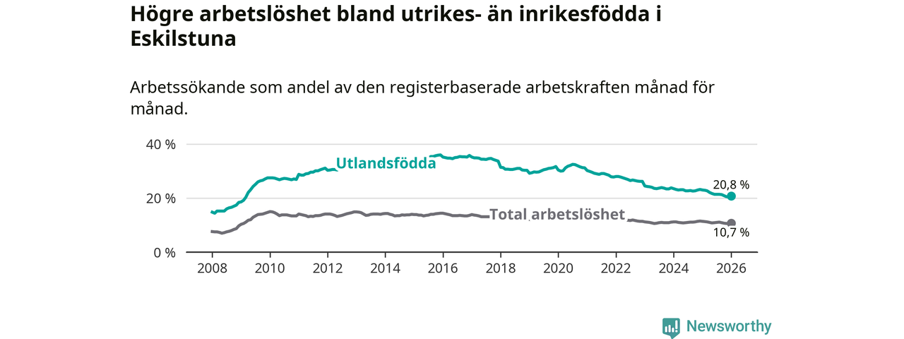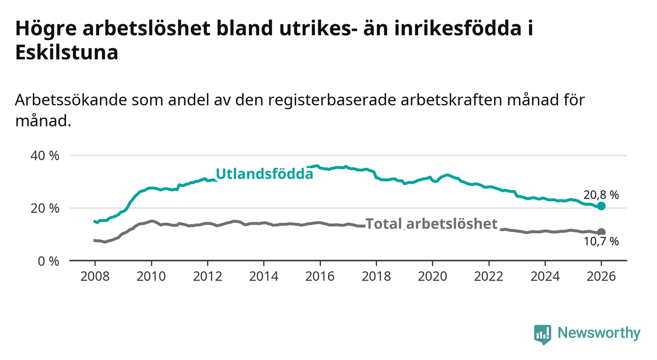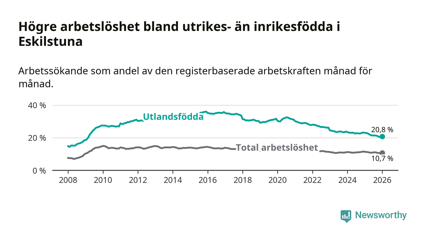 Arbetslösheten bland utlandsfödda var 20,8 procent i Eskilstuna under januari månad, motsvarande 3 573 av 17 178 personer. Det är 2,2 procentenheter färre än vid samma tidpunkt i fjol (−364 om man räknar personer). Därmed har de utlandsföddas arbetslöshet varit lägre än vid samma tidpunkt i fjol i över fem år i sträck. Sedan november 2020 har arbetslösheten bland utlandsfödda minskat från 31,3 till 20,8 procent.
