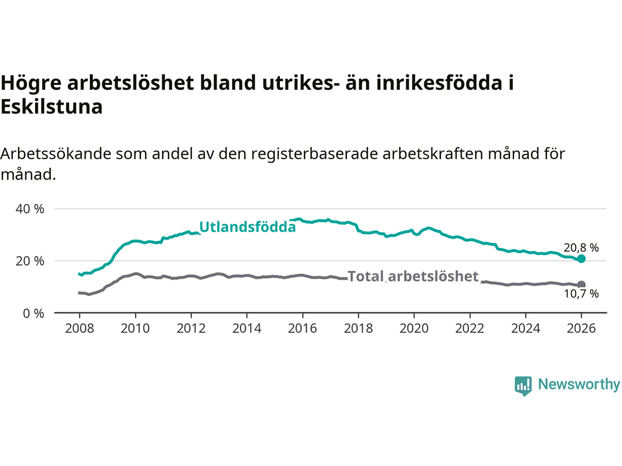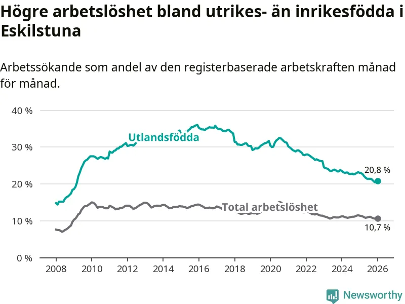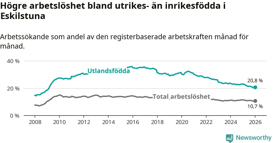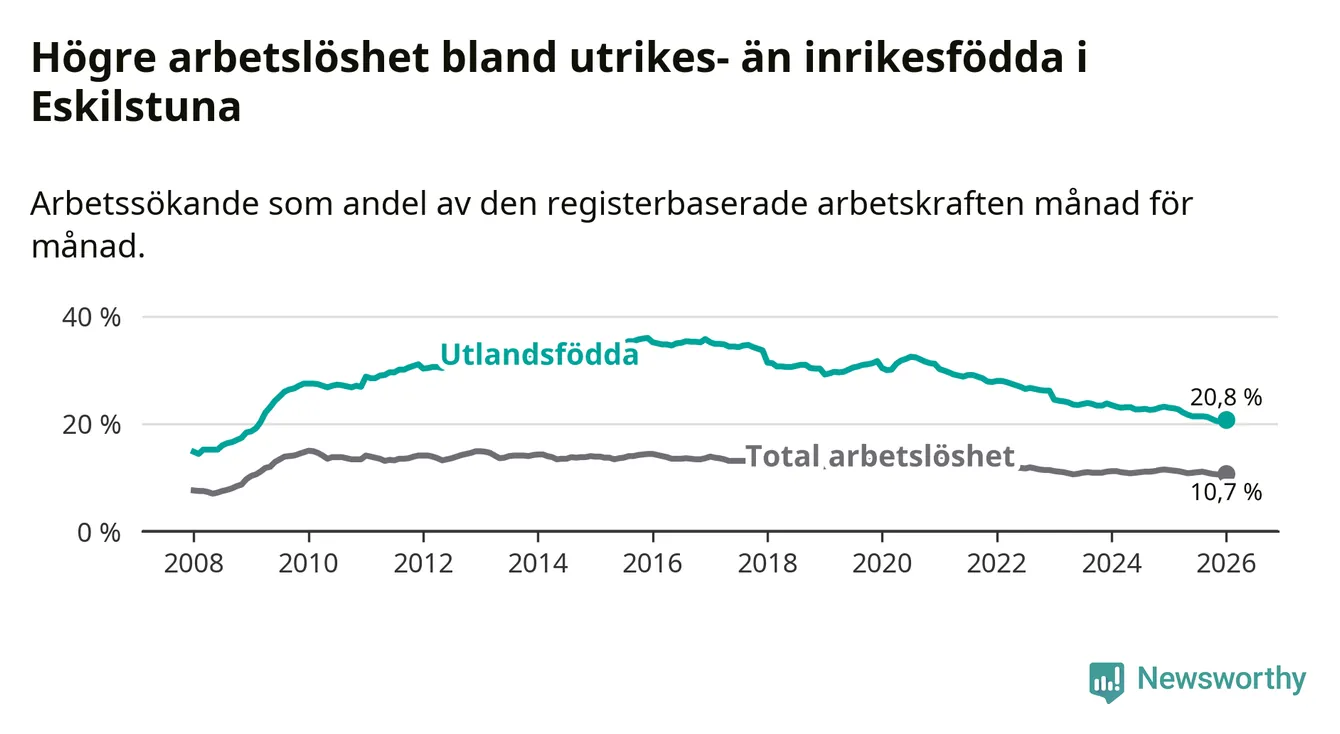 Skillnaden i arbetslöshet mellan utrikesfödda och hela befolkningen är 10,1 procentenheter i Eskilstuna. Det är en betydligt mindre skillnad än för ett år sedan (−1,5 procentenheter).