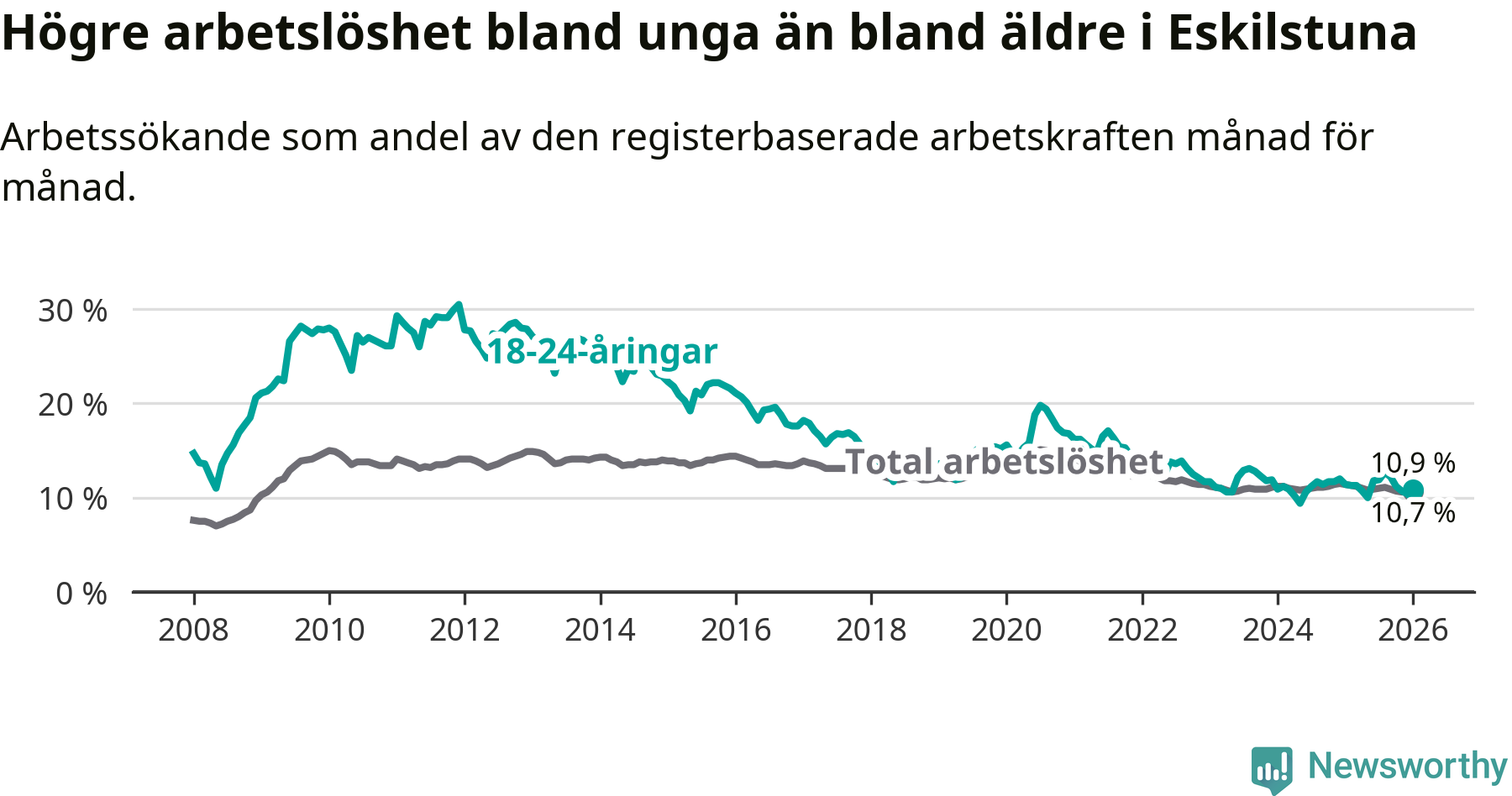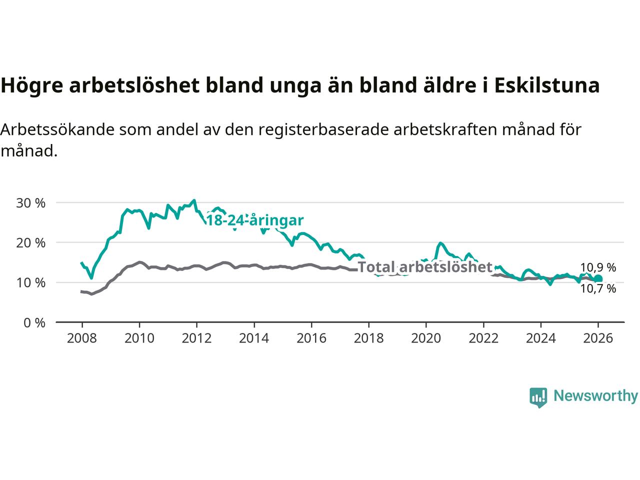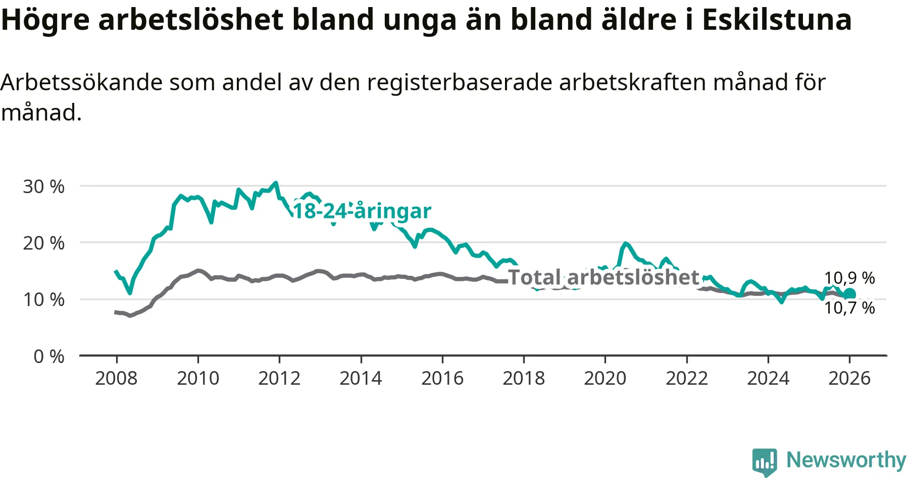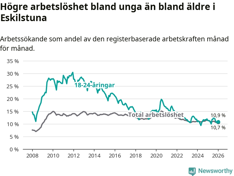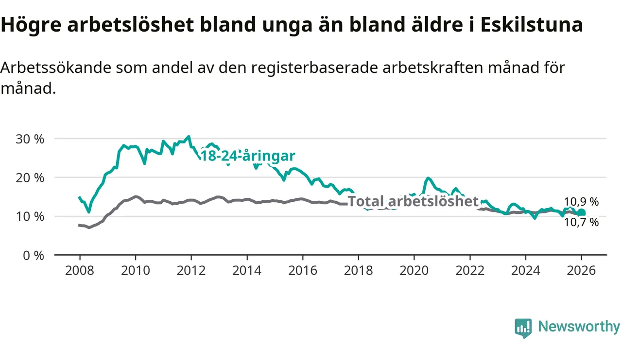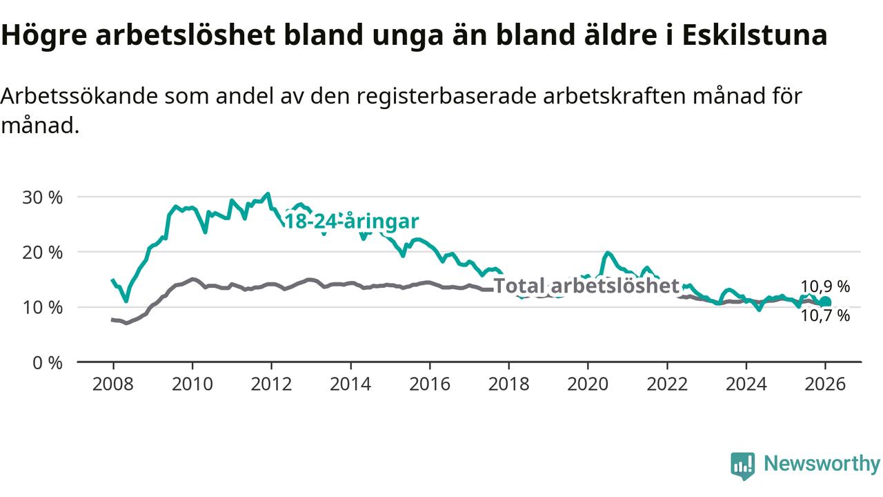Graf: Arbetslöshet bland unga i Eskilstuna kommun och Södermanlands län