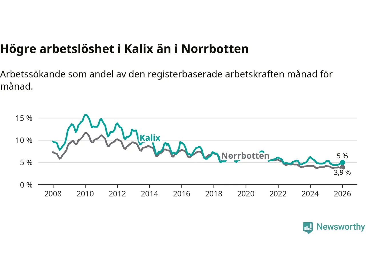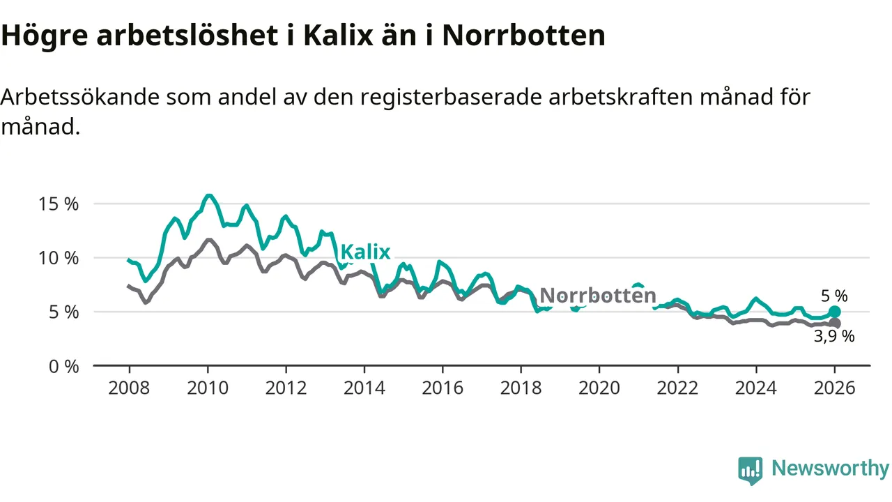 Under januari månad rapporterade Kalix kommun en total arbetslöshet på 5,0 procent. Det är en minskning jämfört med samma tidpunkt i fjol (−0,3 procentenheter). Även i Norrbottens län sjunker arbetslösheten .