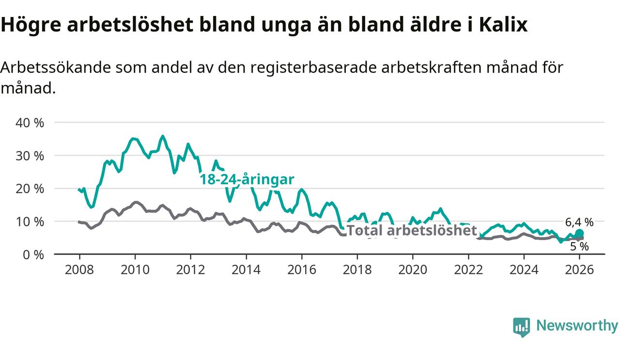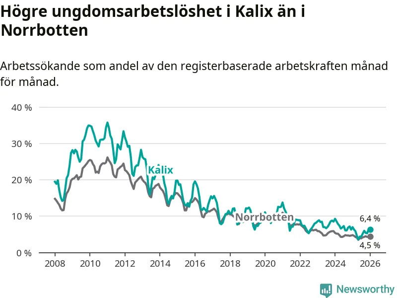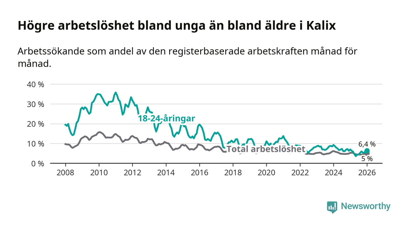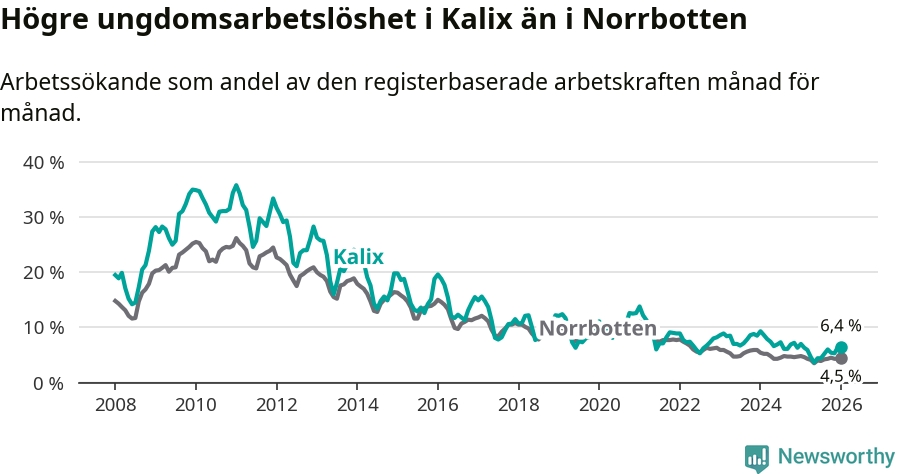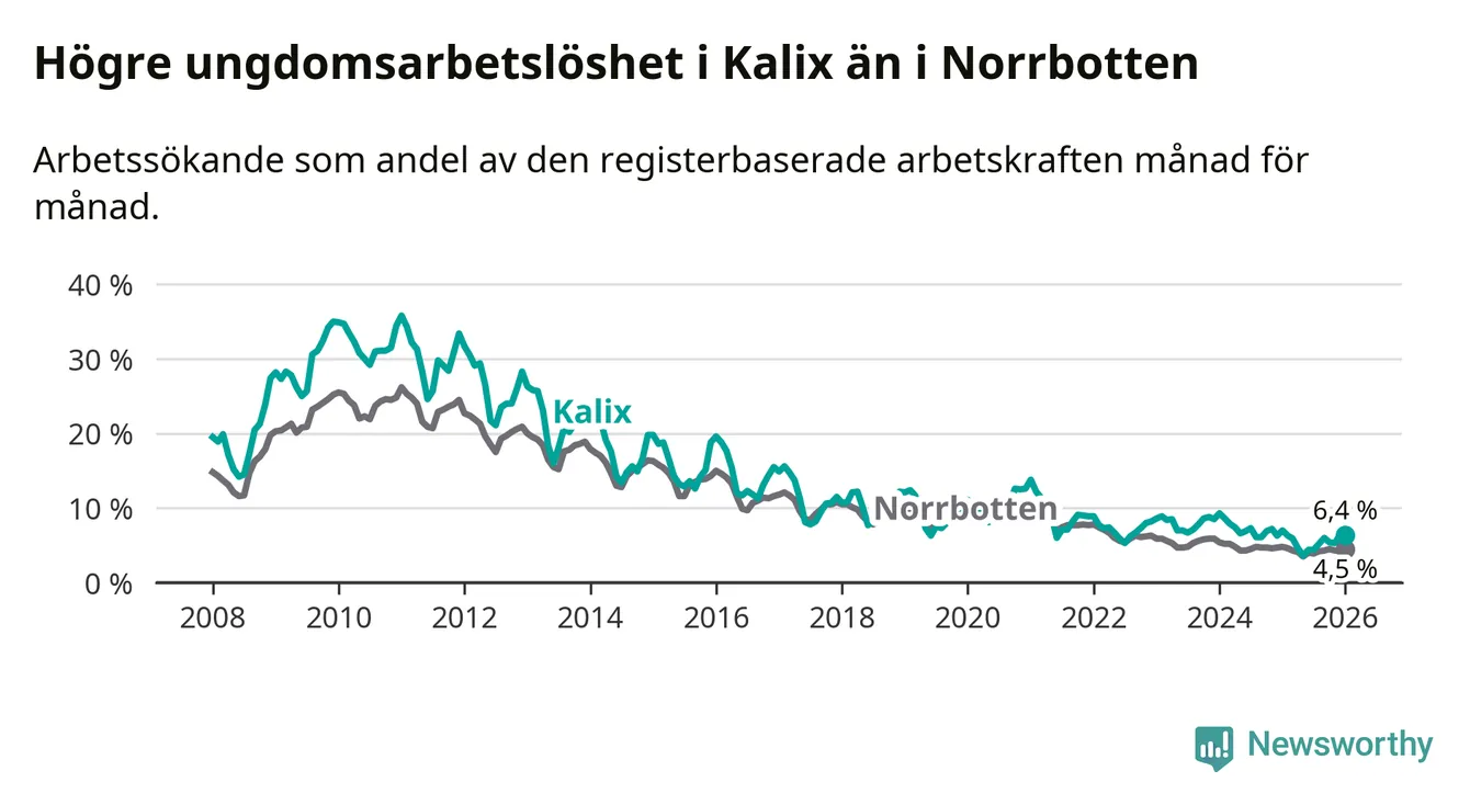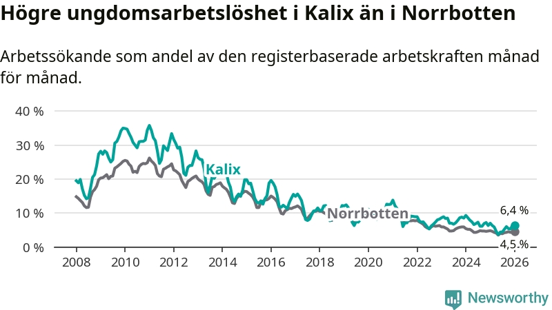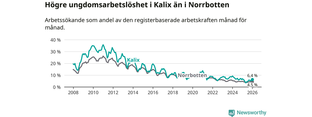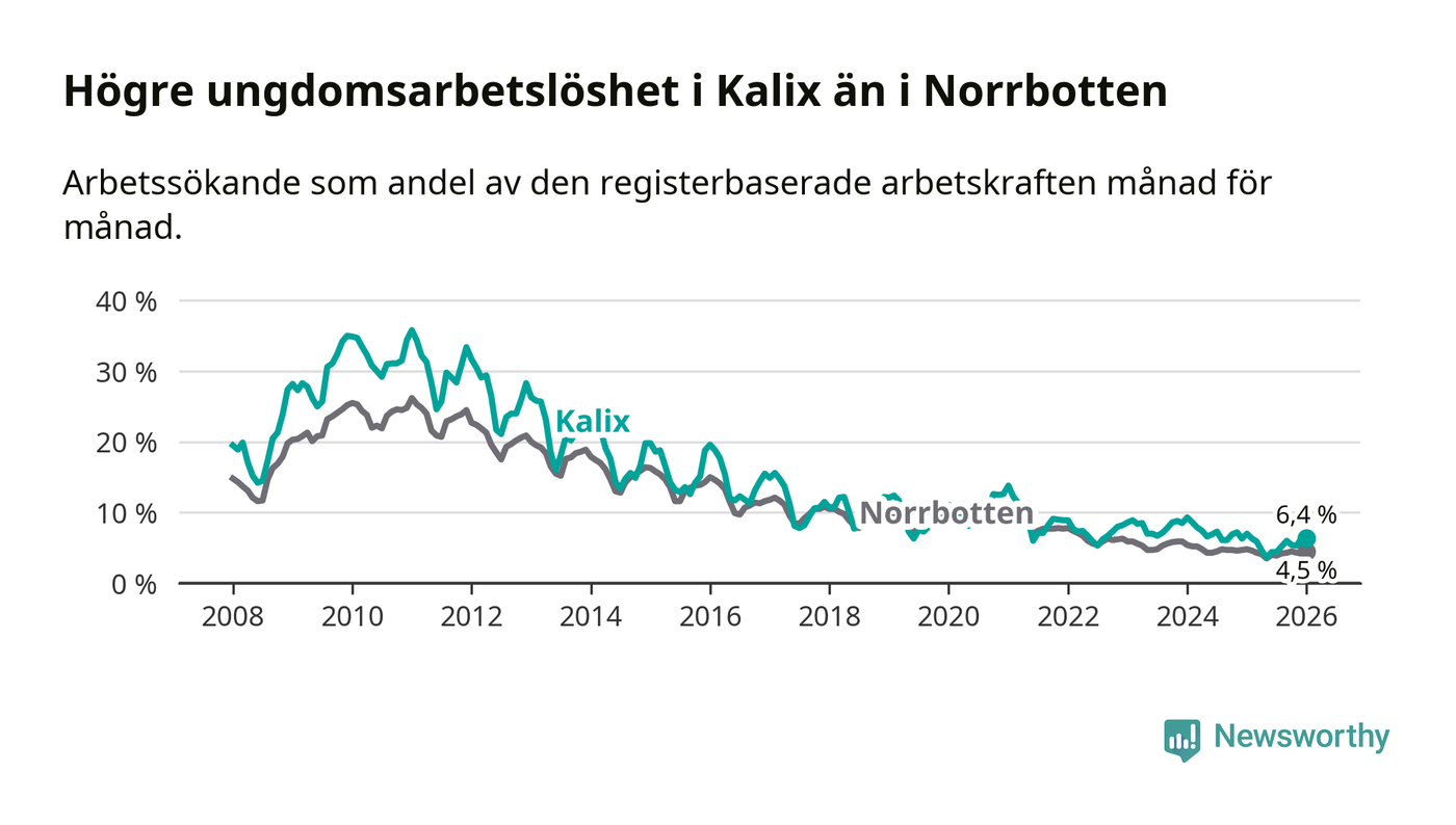 Precis som den totala arbetslösheten ligger ungdomsarbetslösheten i Kalix högre än i Norrbotten som helhet. Skillnaden mellan kommunen och länet är 1,9 procentenheter.
