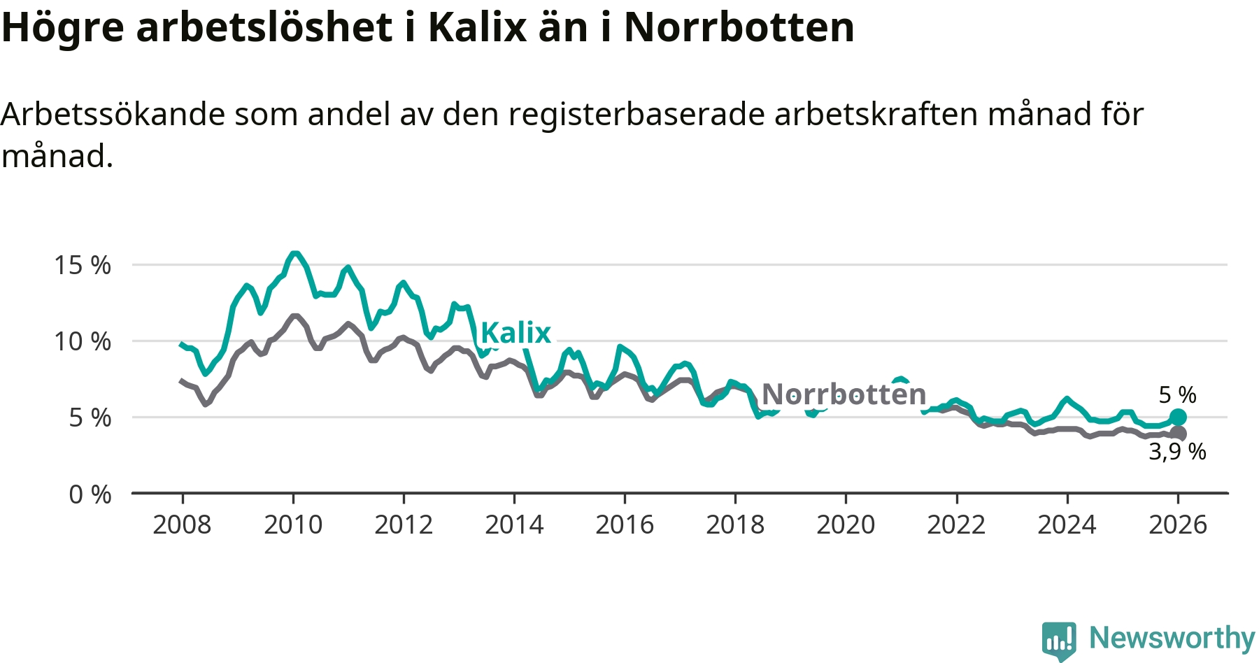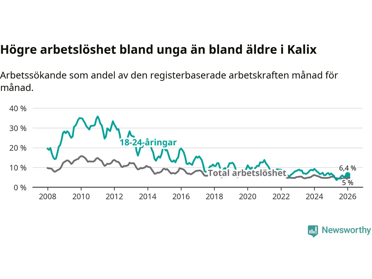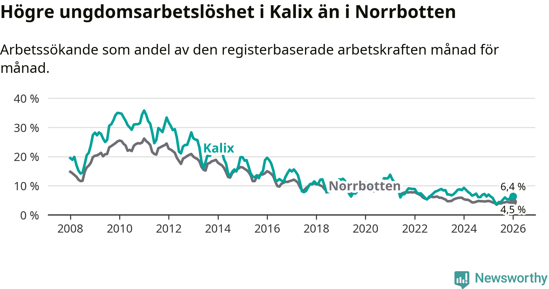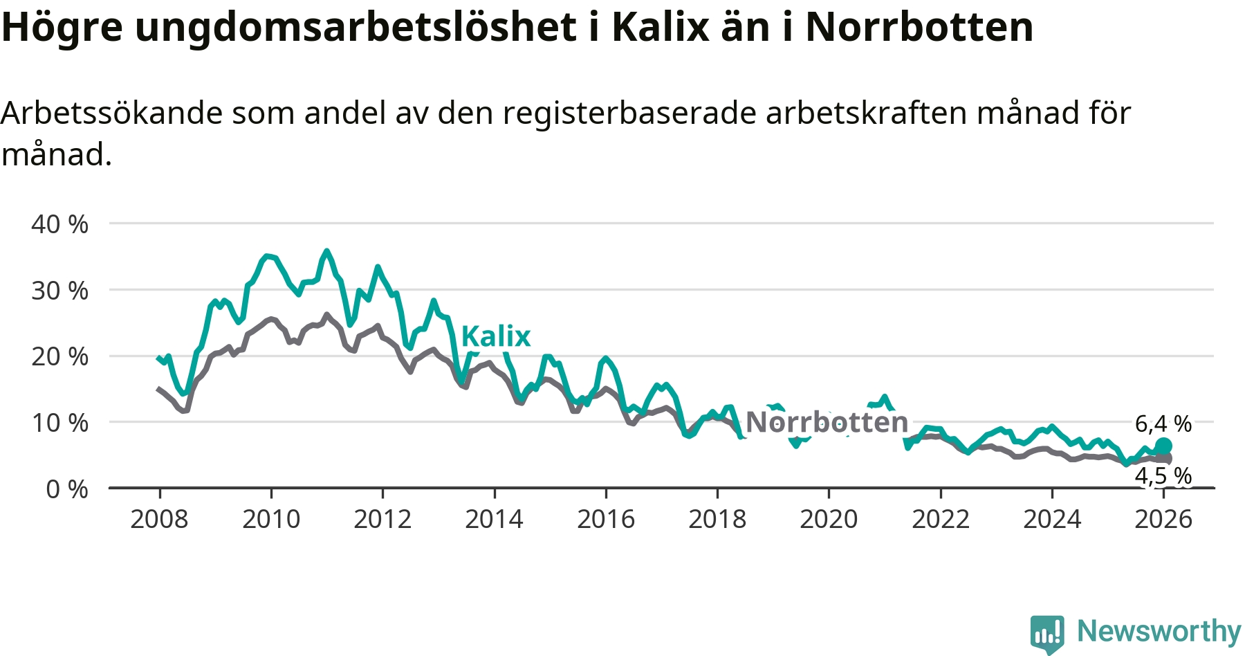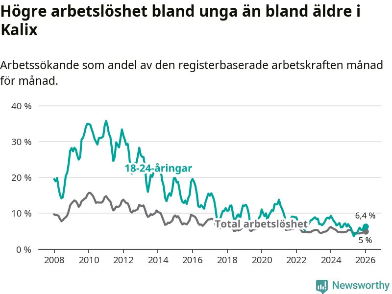 Precis som den totala arbetslösheten ligger ungdomsarbetslösheten i Kalix högre än i Norrbotten som helhet. Skillnaden mellan kommunen och länet är 1,9 procentenheter.