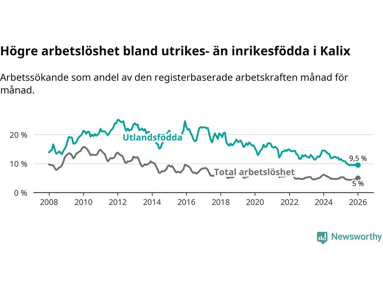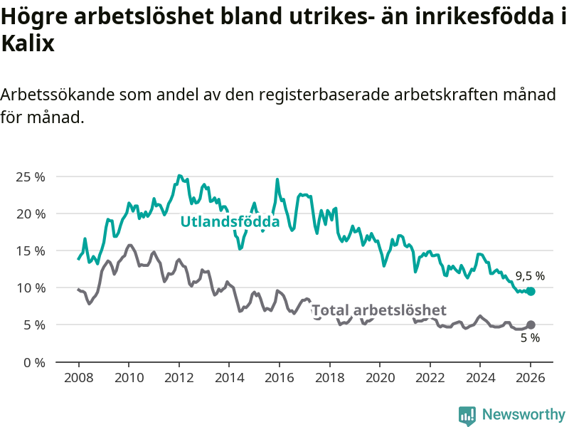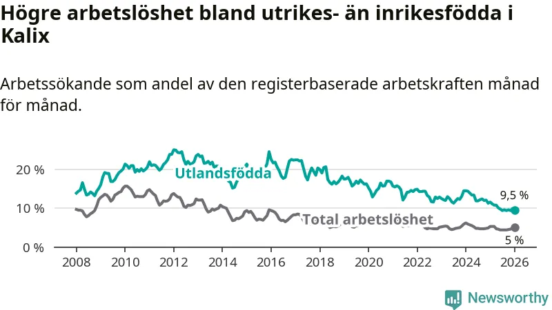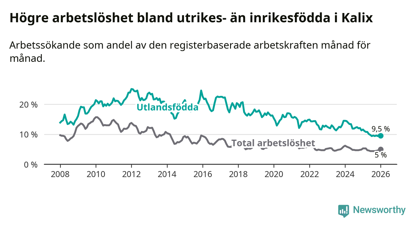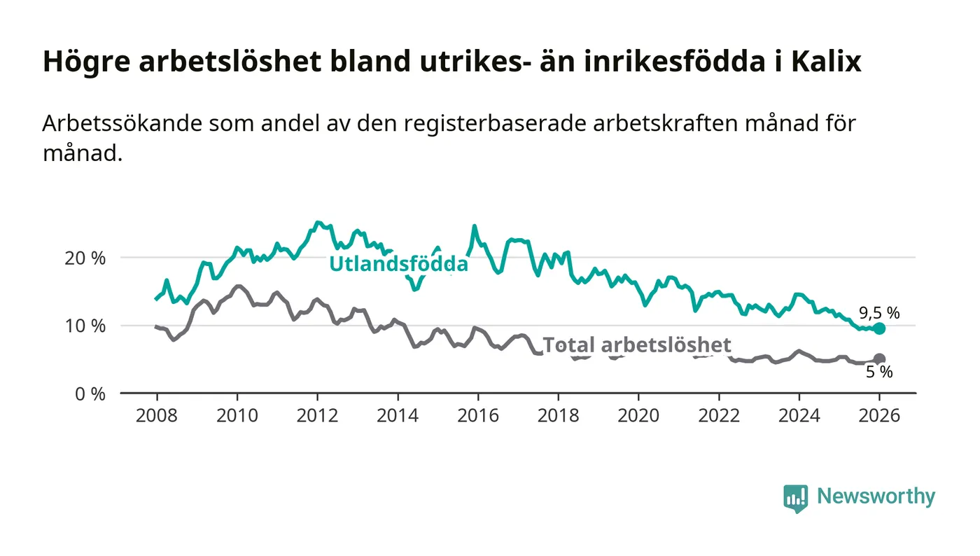Arbetslösheten bland utlandsfödda var 9,5 procent i Kalix under januari månad, motsvarande 81 av 853 personer. Det är 2,1 procentenheter färre än vid samma tidpunkt i fjol (−19 om man räknar personer). Därmed är de utlandsföddas arbetslöshet lägre än vid samma tidpunkt i fjol för 17:e månaden i följd. Sedan augusti 2024 har arbetslösheten bland utlandsfödda minskat från 12,2 till 9,5 procent.