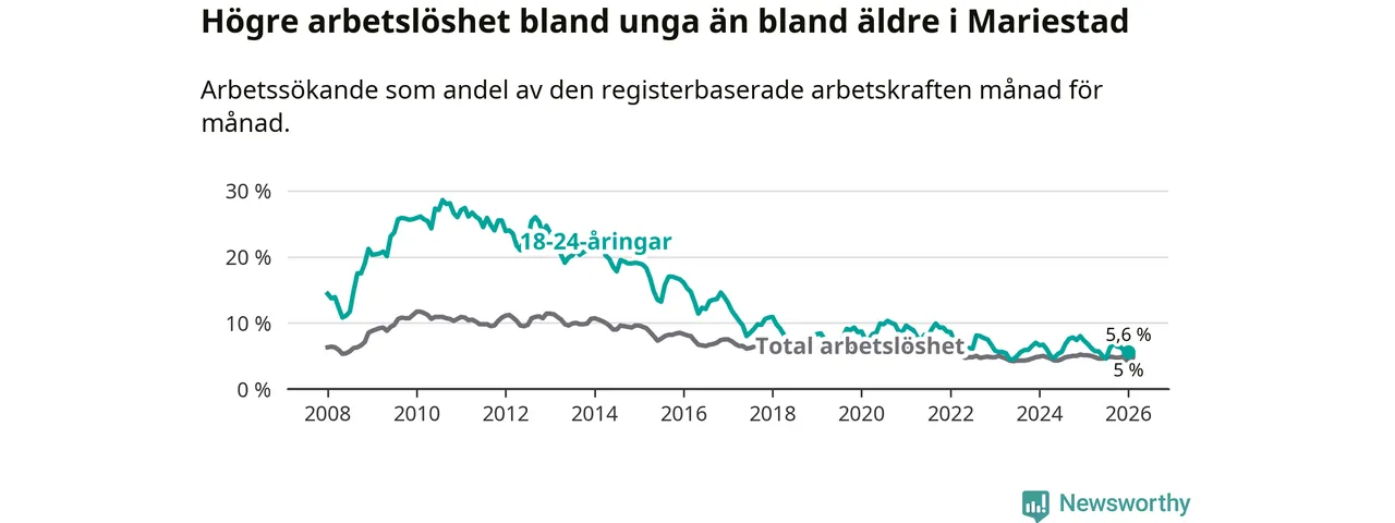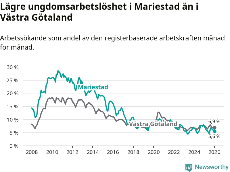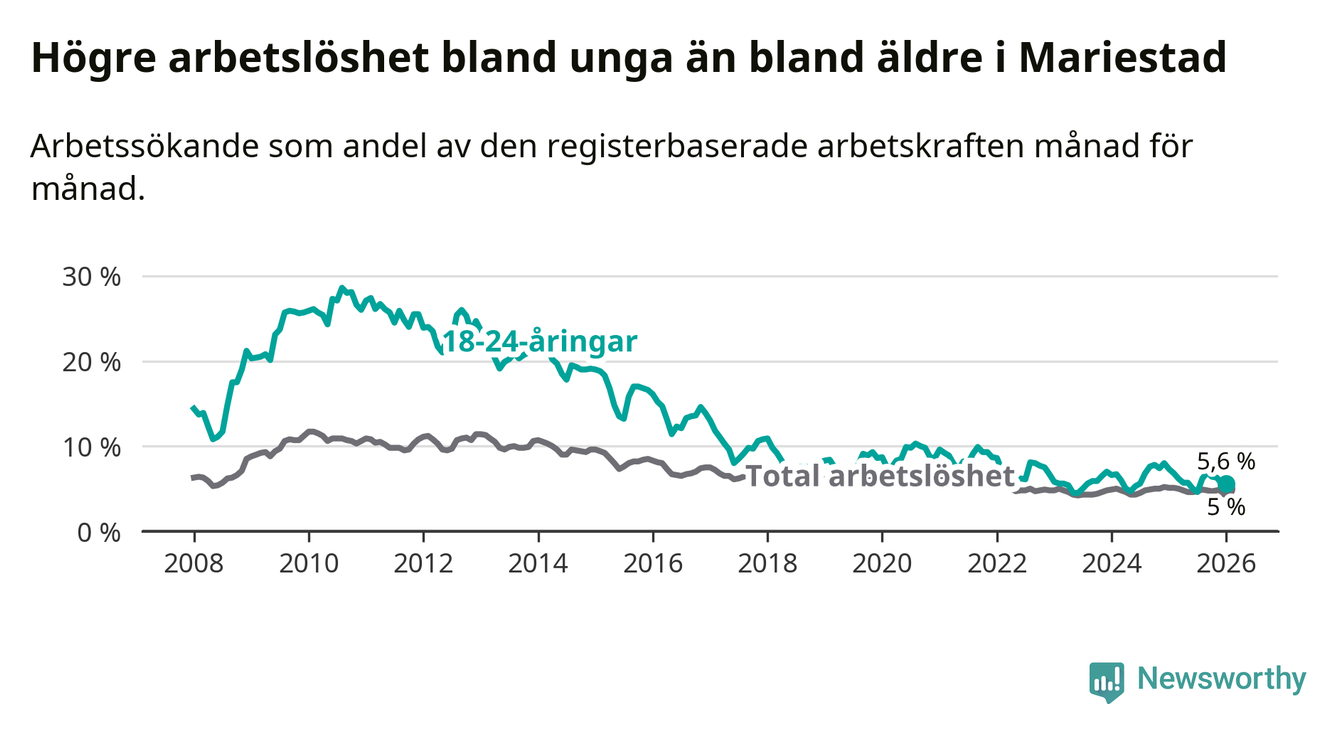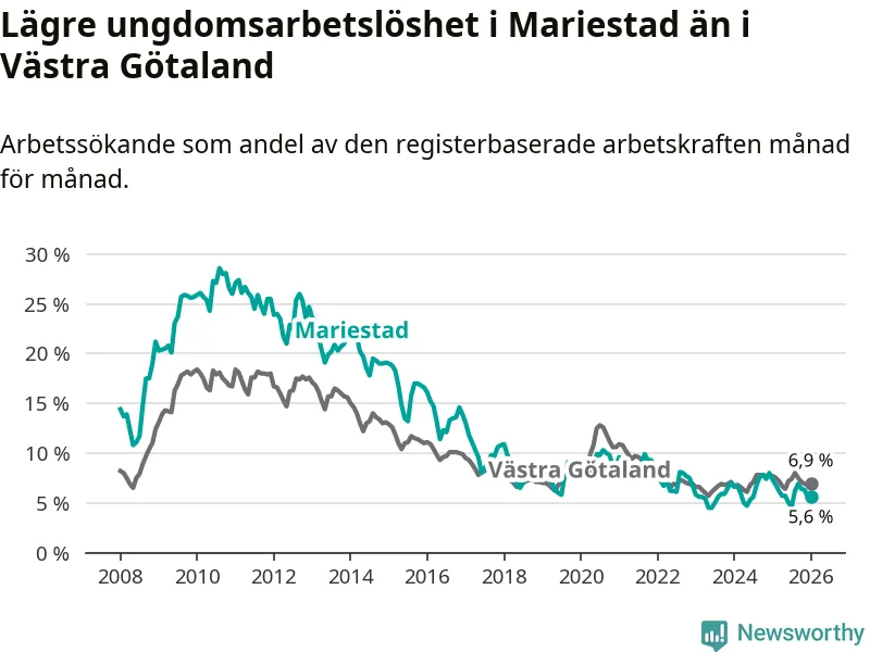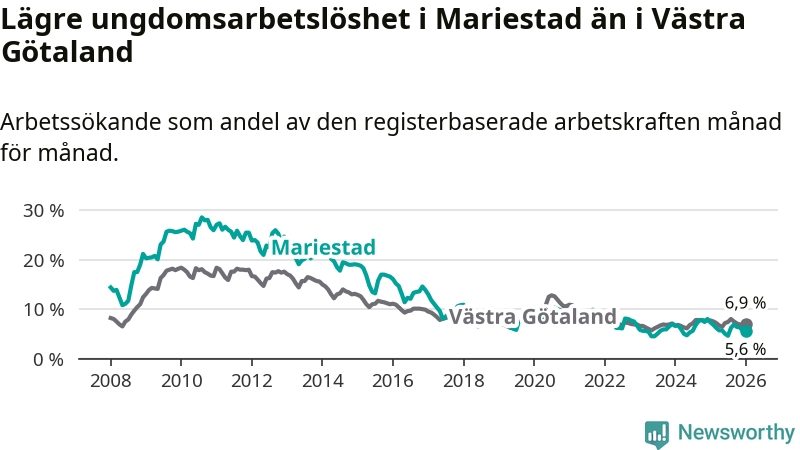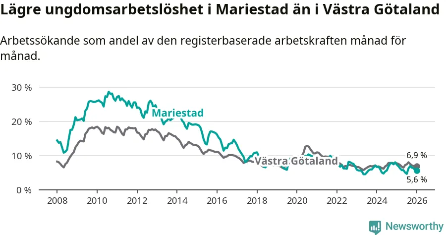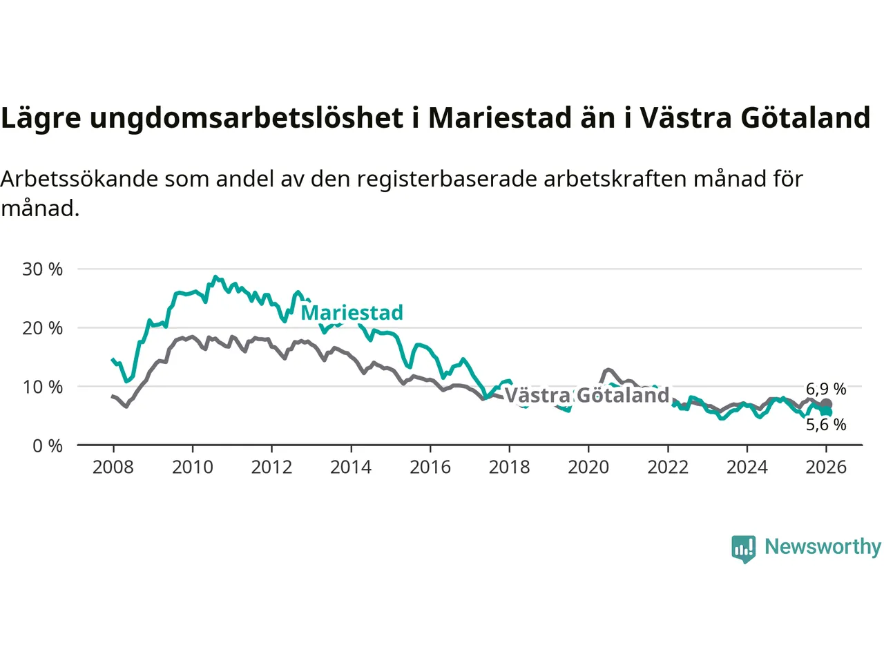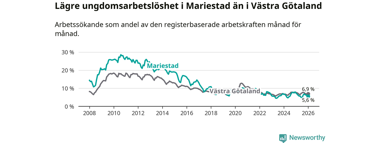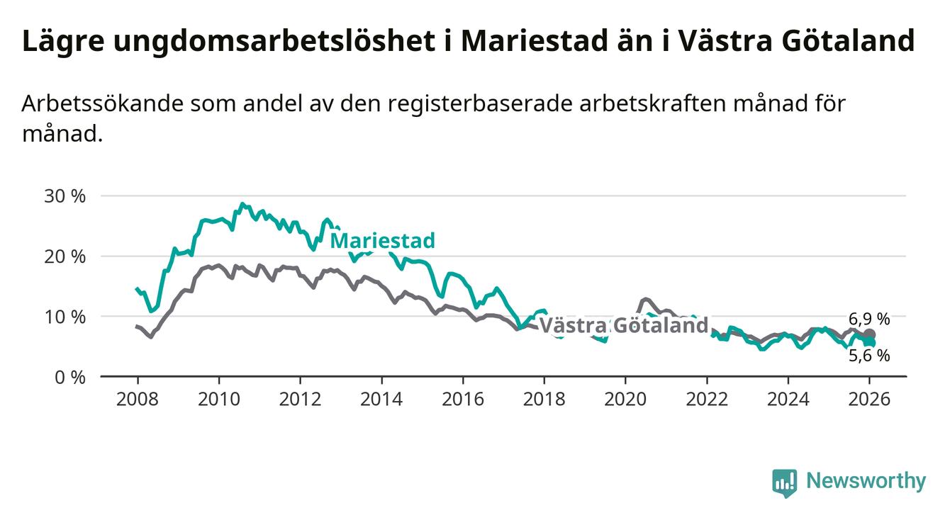 I och med den senaste månadens nedgång har de ungas arbetslöshet i Mariestad sjunkit åtta månader i följd (ner från 5,7 procent i maj 2025 till 5,6 procent nu).