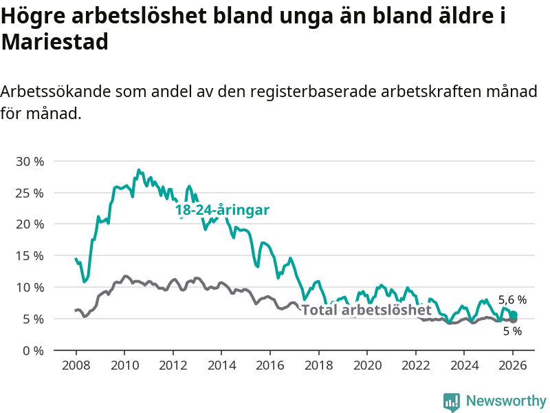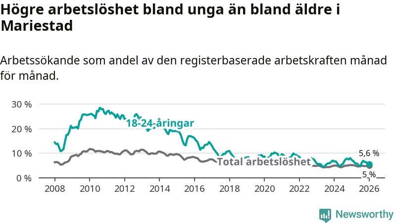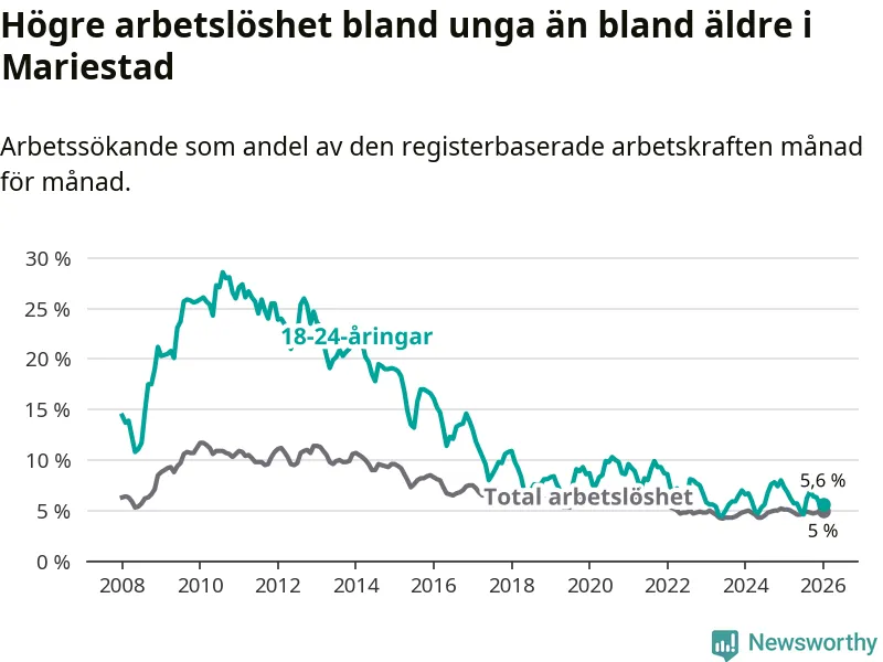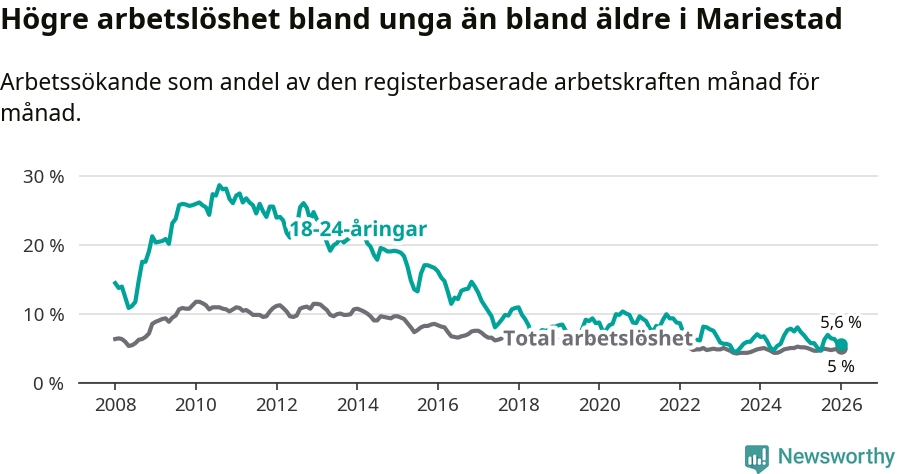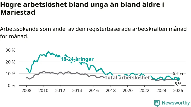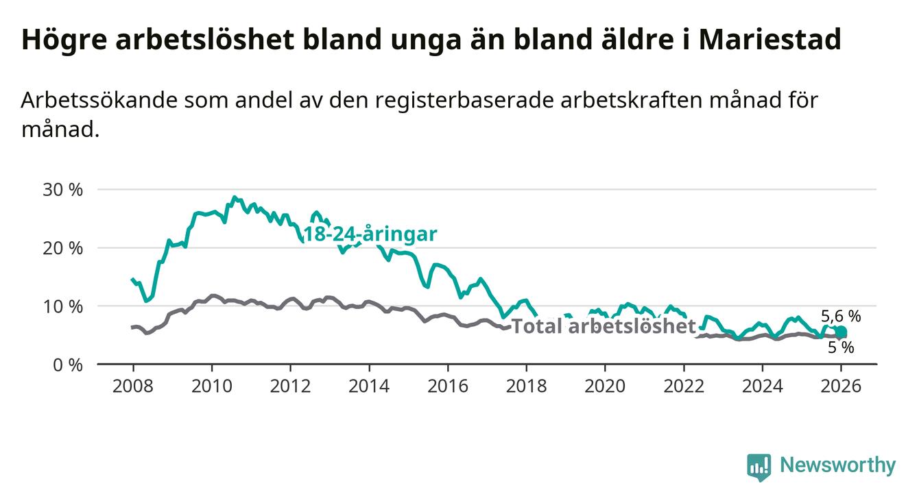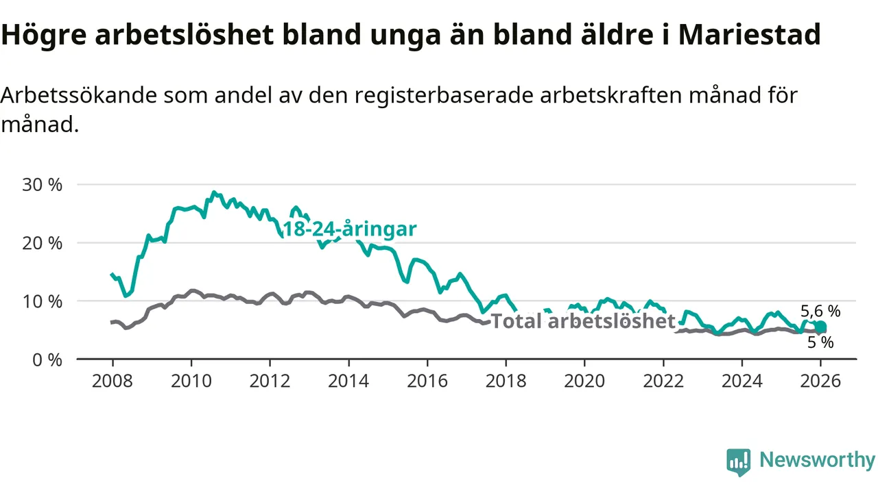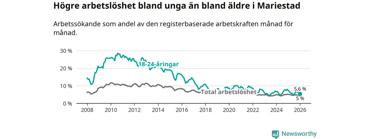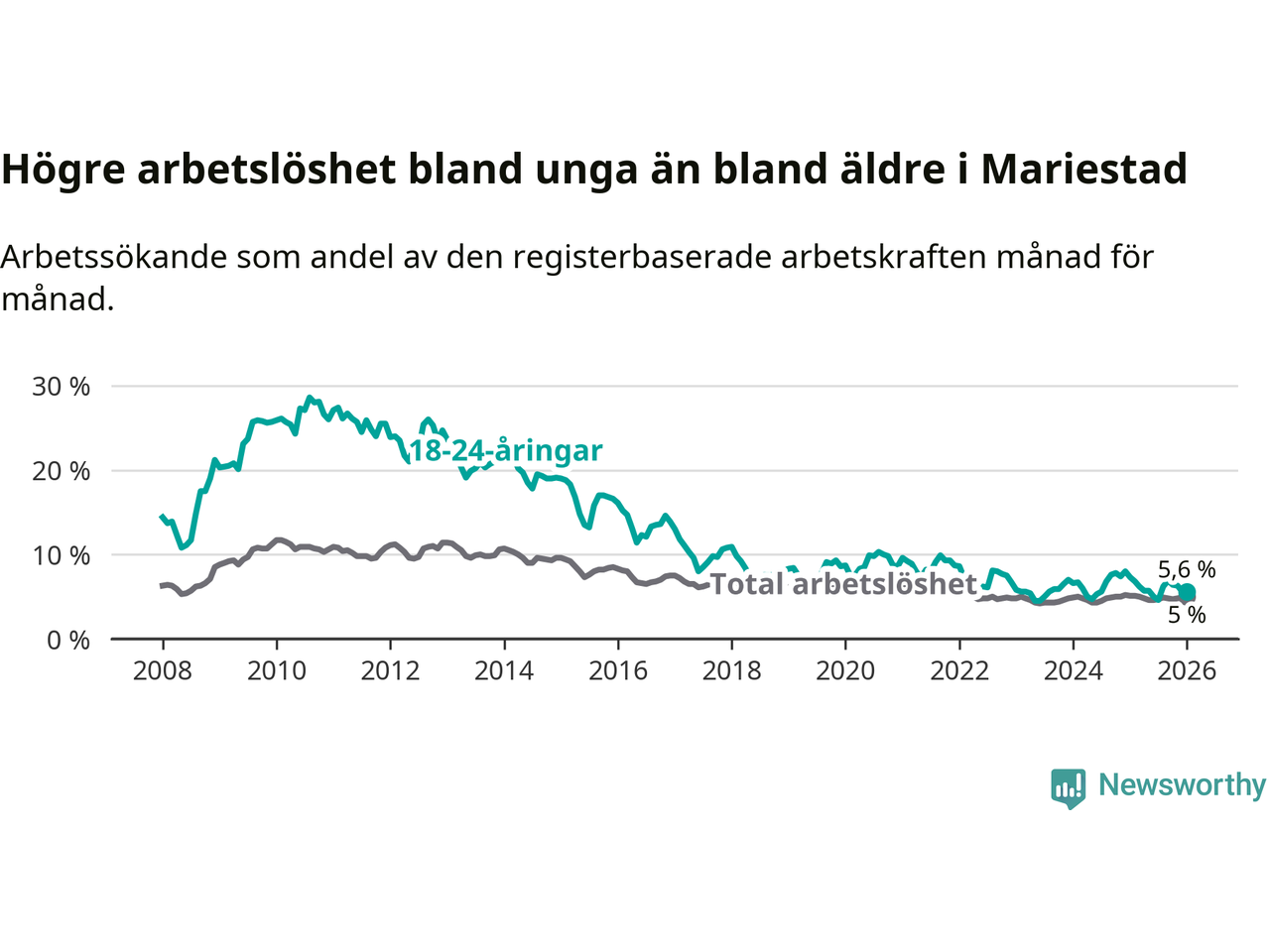 I och med den senaste månadens nedgång har de ungas arbetslöshet i Mariestad sjunkit åtta månader i följd (ner från 5,7 procent i maj 2025 till 5,6 procent nu).
