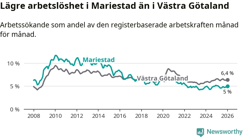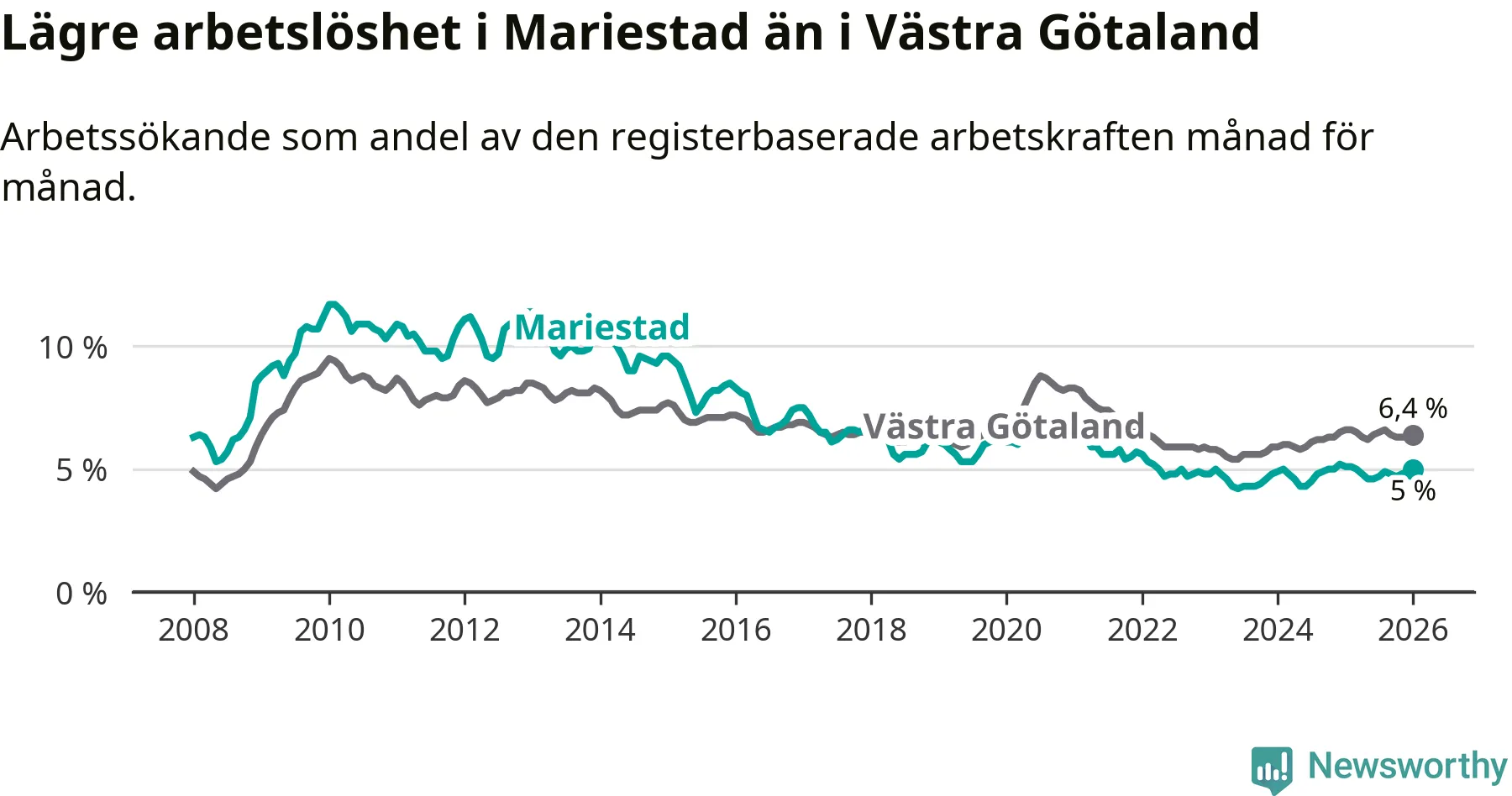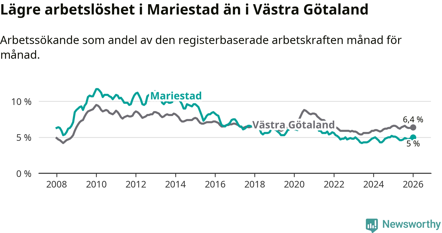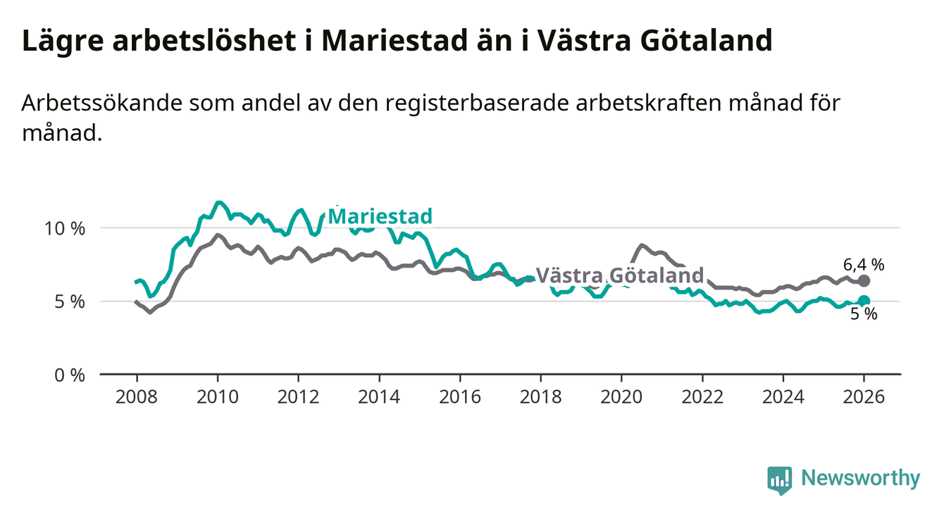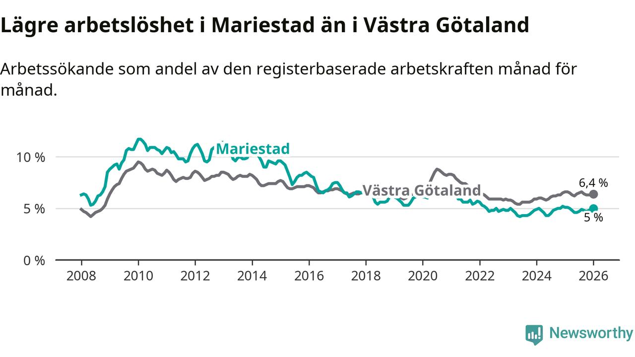 Mariestad hade redan tidigare lägre arbetslöshet än snittet i hela Västra Götalands län och nu växer klyftan (5,0 procent i kommunen, jämfört med 6,4 procent i hela länet). Öckerö har den lägsta arbetslösheten i länet (2,9 procent), medan Gullspång har den högsta (8,7 procent). För att Mariestad skulle komma ner i samma arbetslöshetsnivå som Öckerö skulle 247 personer behöva sysselsättas.